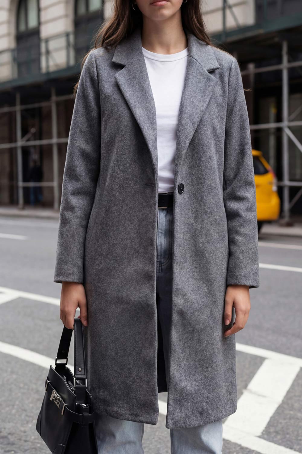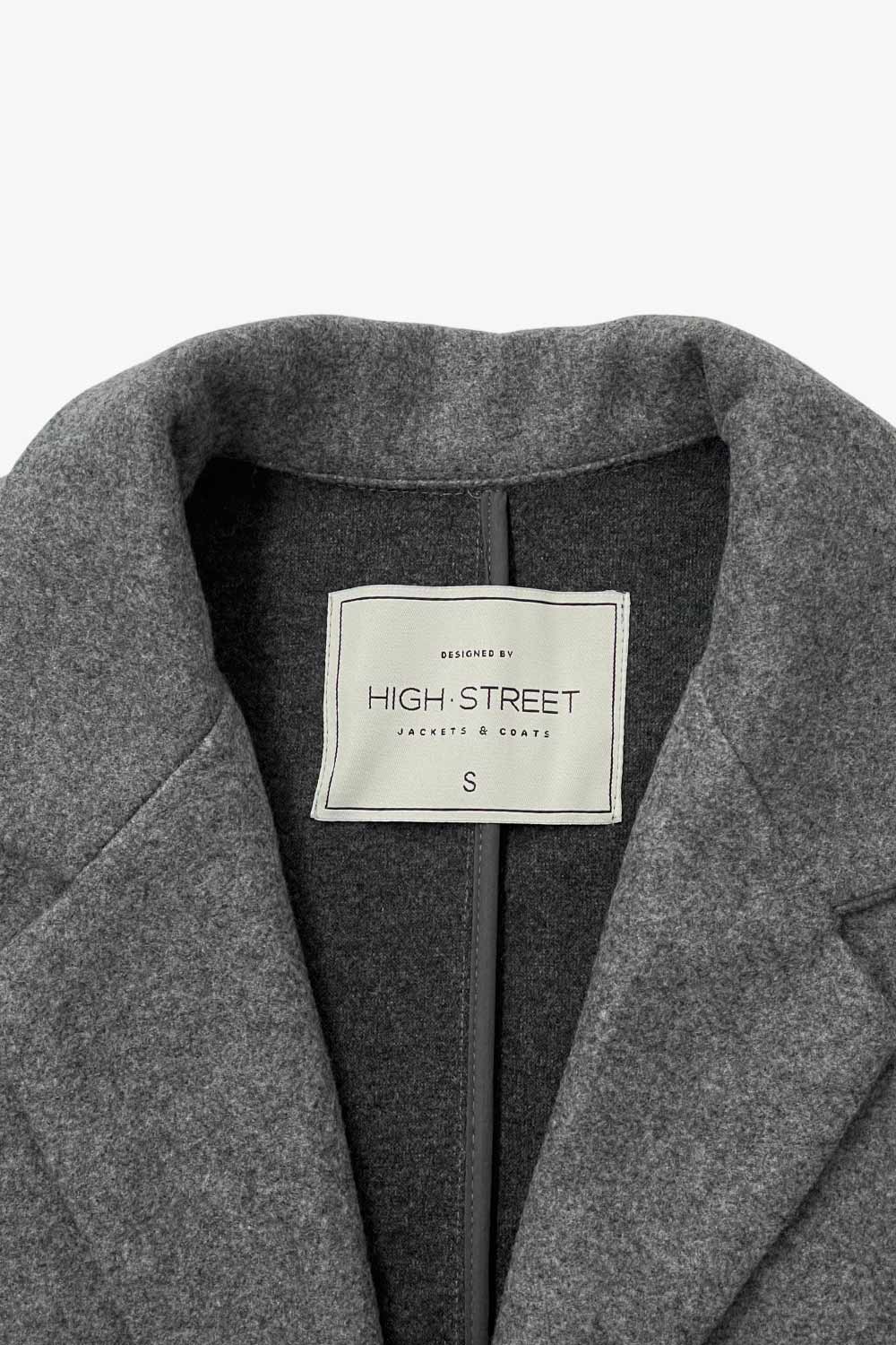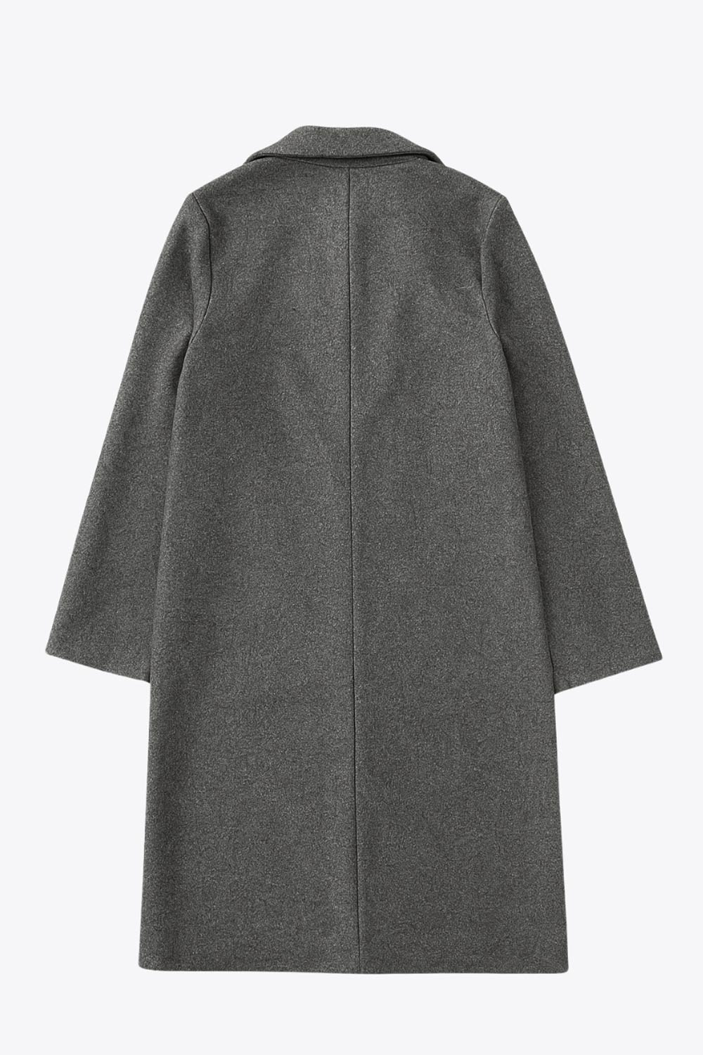 Abrigo largo de fit recto, con solapa, manga larga y cierre frontal con cruce de botón en contraste.