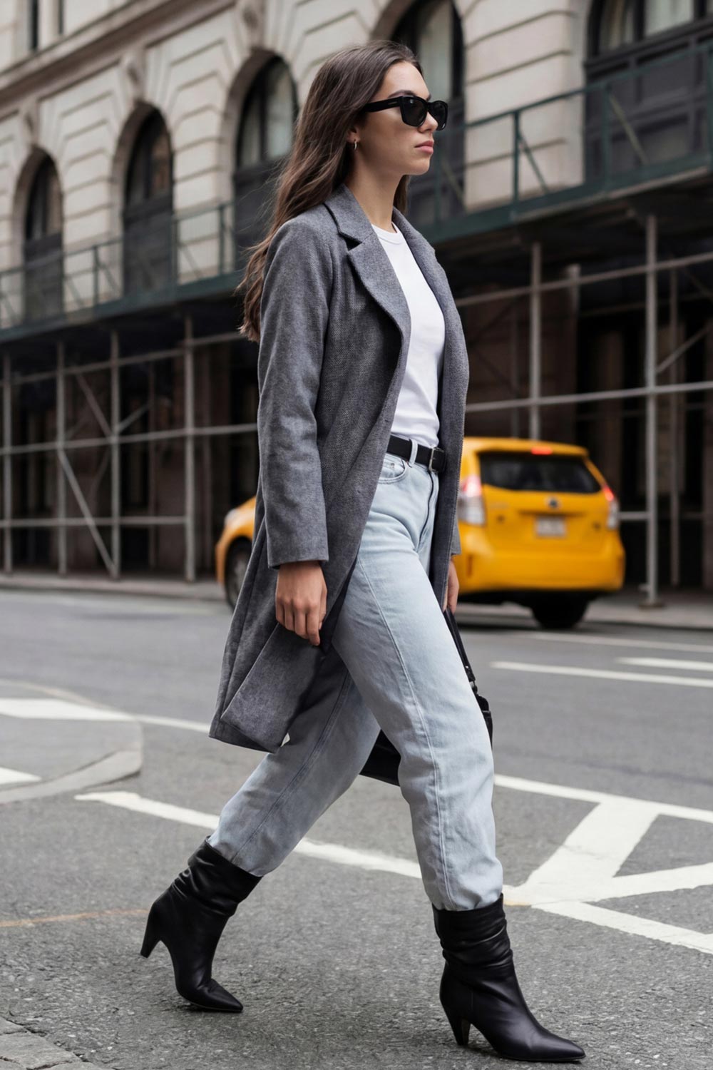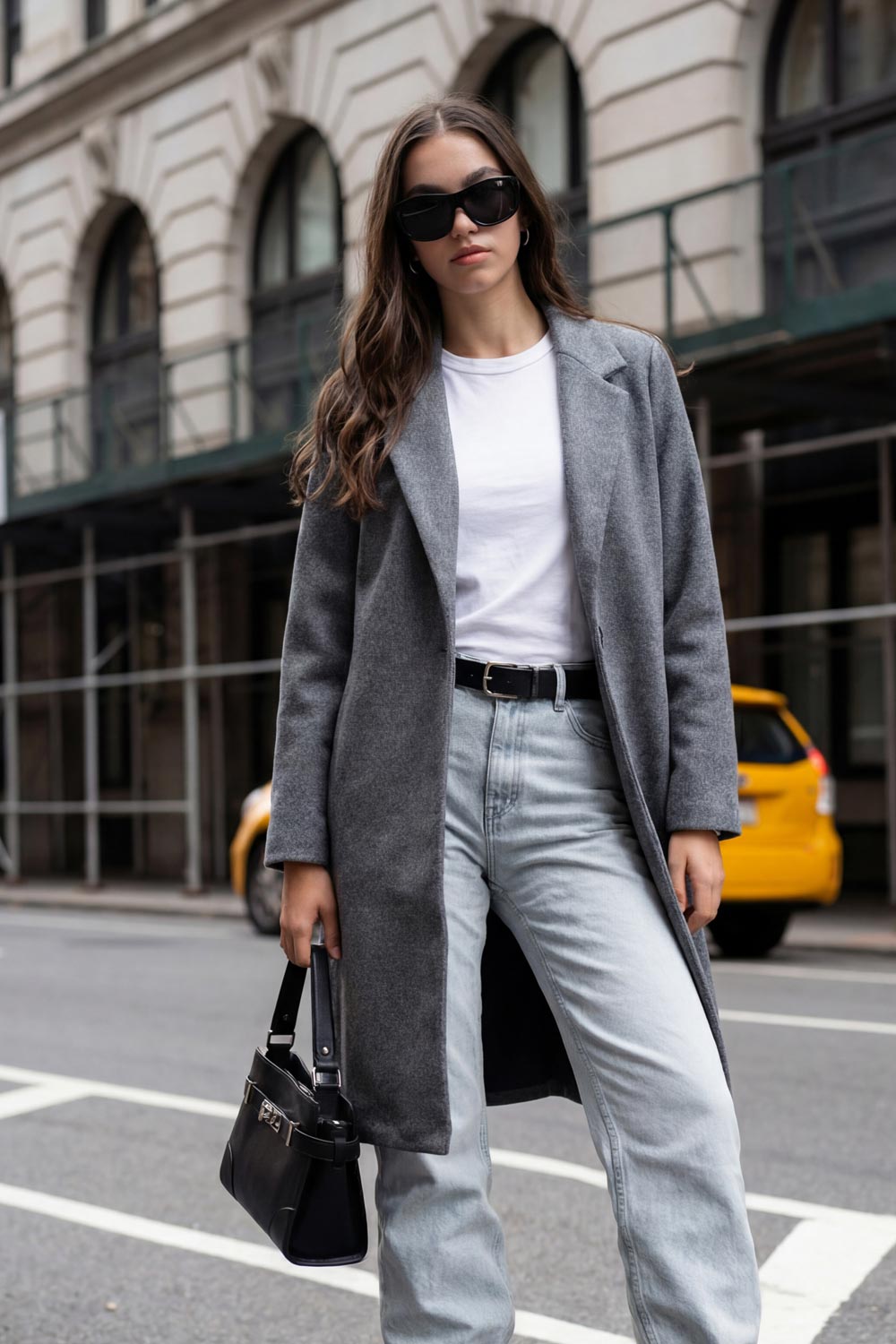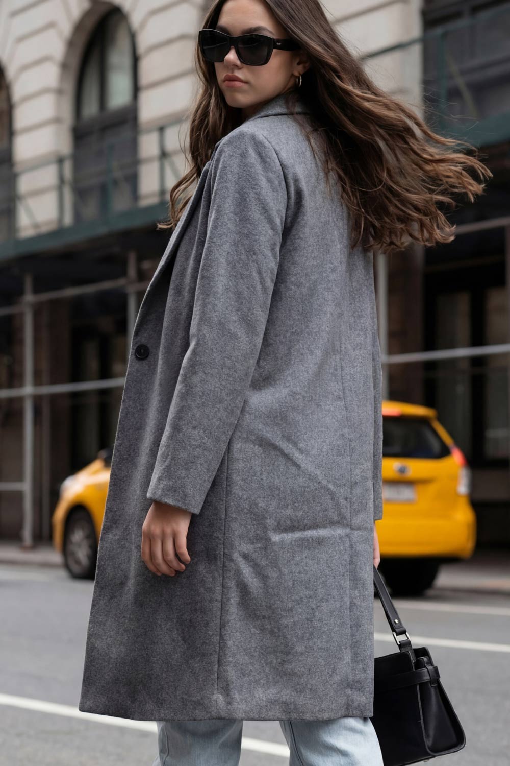 Abrigo largo de fit recto, con solapa, manga larga y cierre frontal con cruce de botón en contraste.