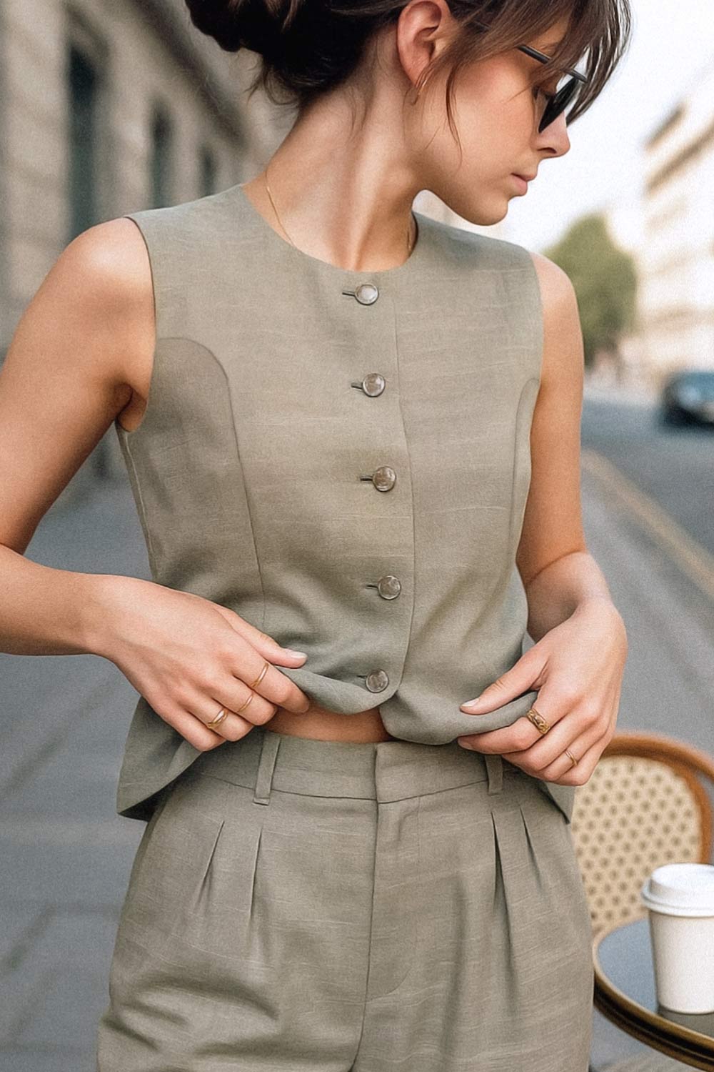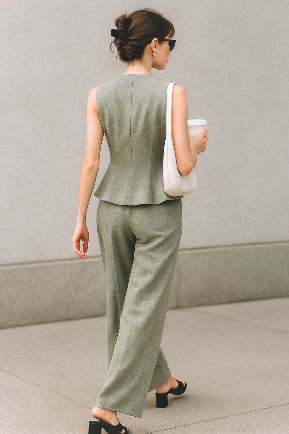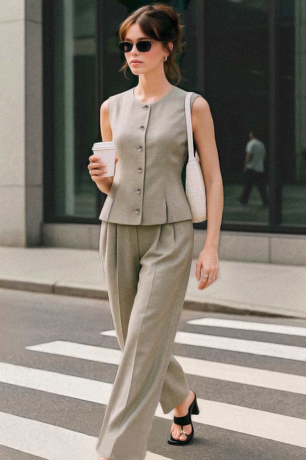 Pantalón de fit wide leg, cintura alta, con pretina y trabillas, bolsillos delanteros, pinzas frontales, cierre frontal con broche y cremallera ocultas.