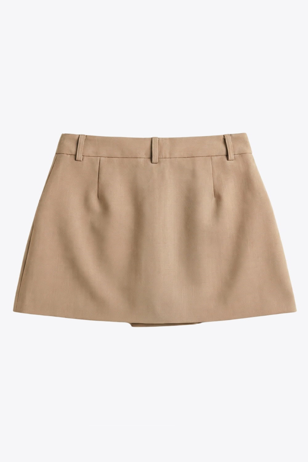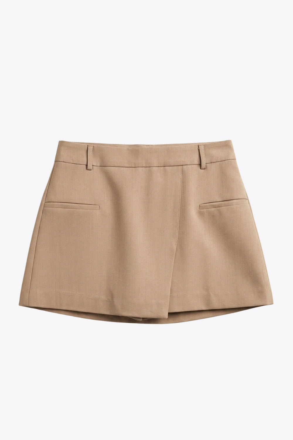 Falda short corto de cintura alta con pretina y trabillas, corte en a, cruce frontal en diagonal y vivos decorativos frontales. Cierre lateral con cremallera oculta.