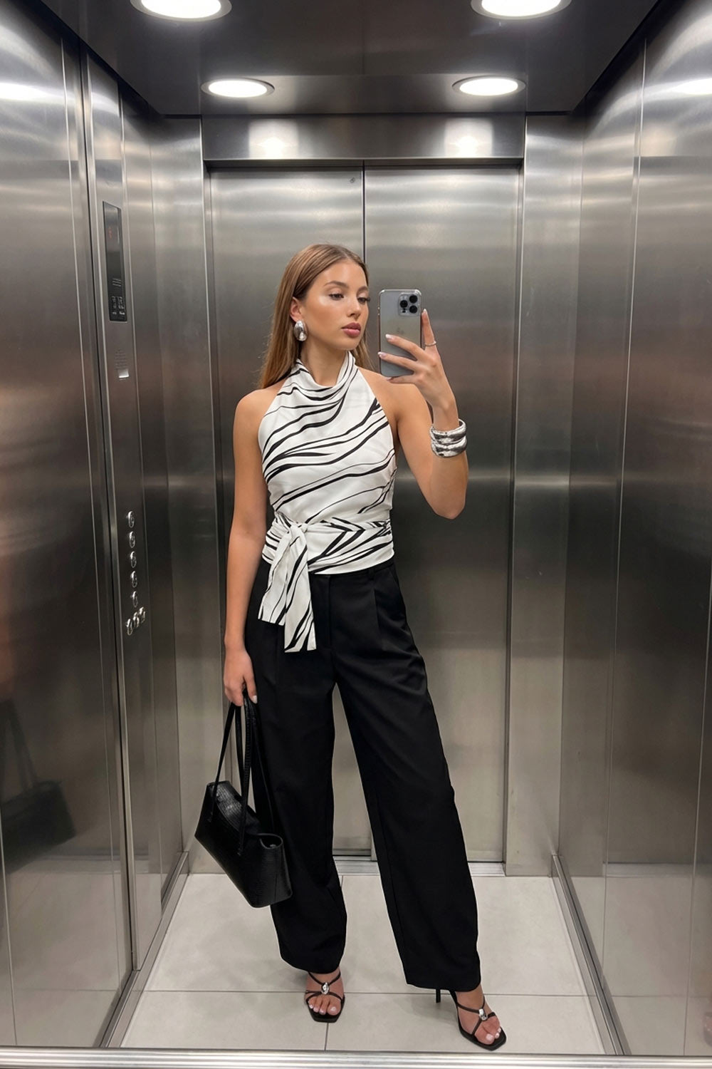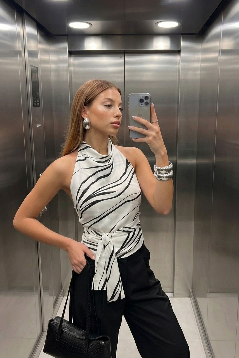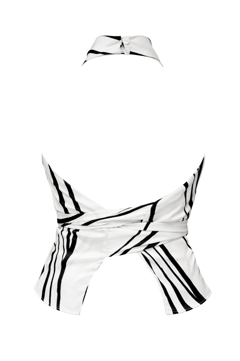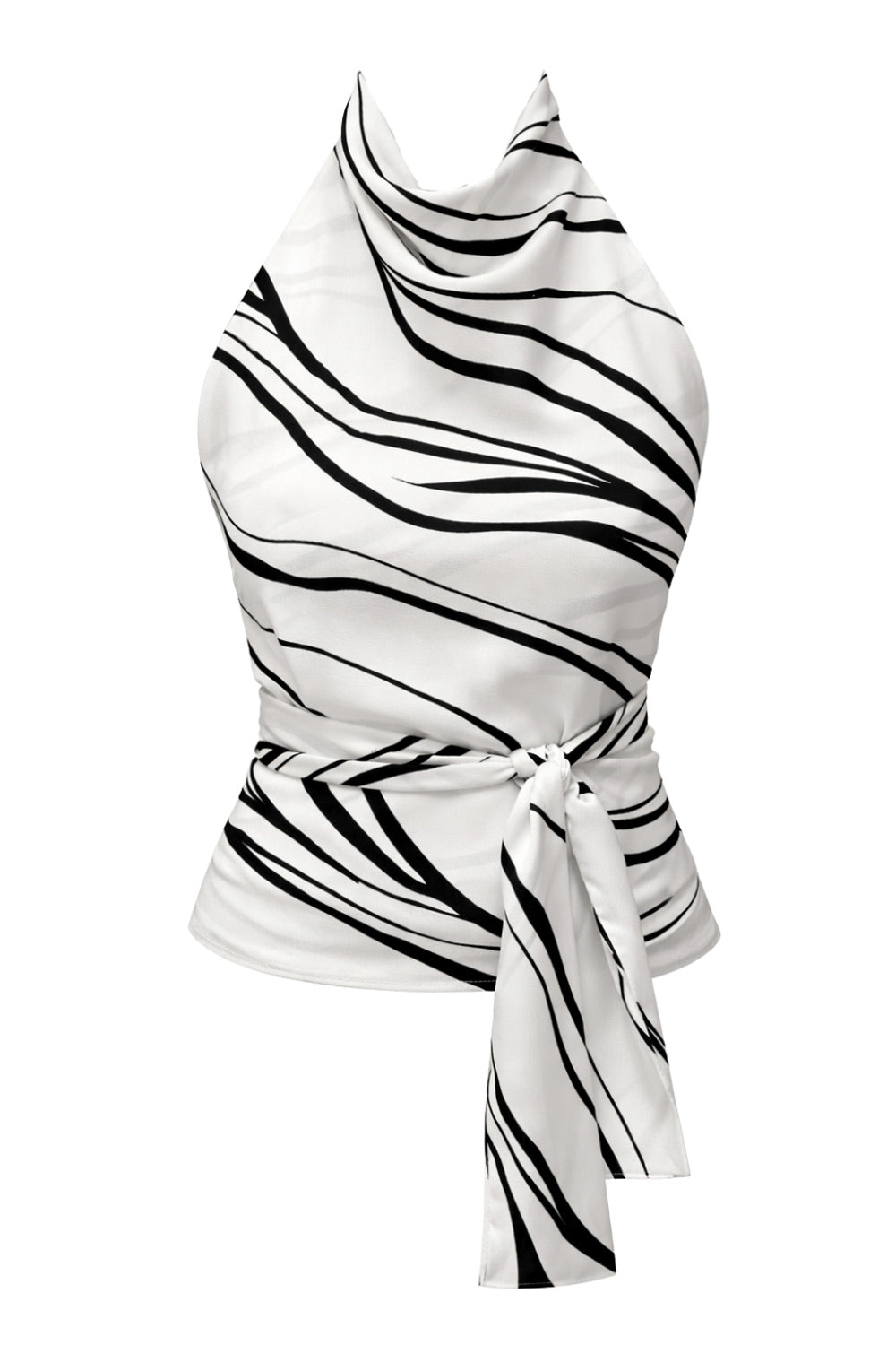 Blusa estampada de fit recto, halter con cuello fluido, sin mangas, lazo amarrable en cintura, cierre posterior con botón y ojal.