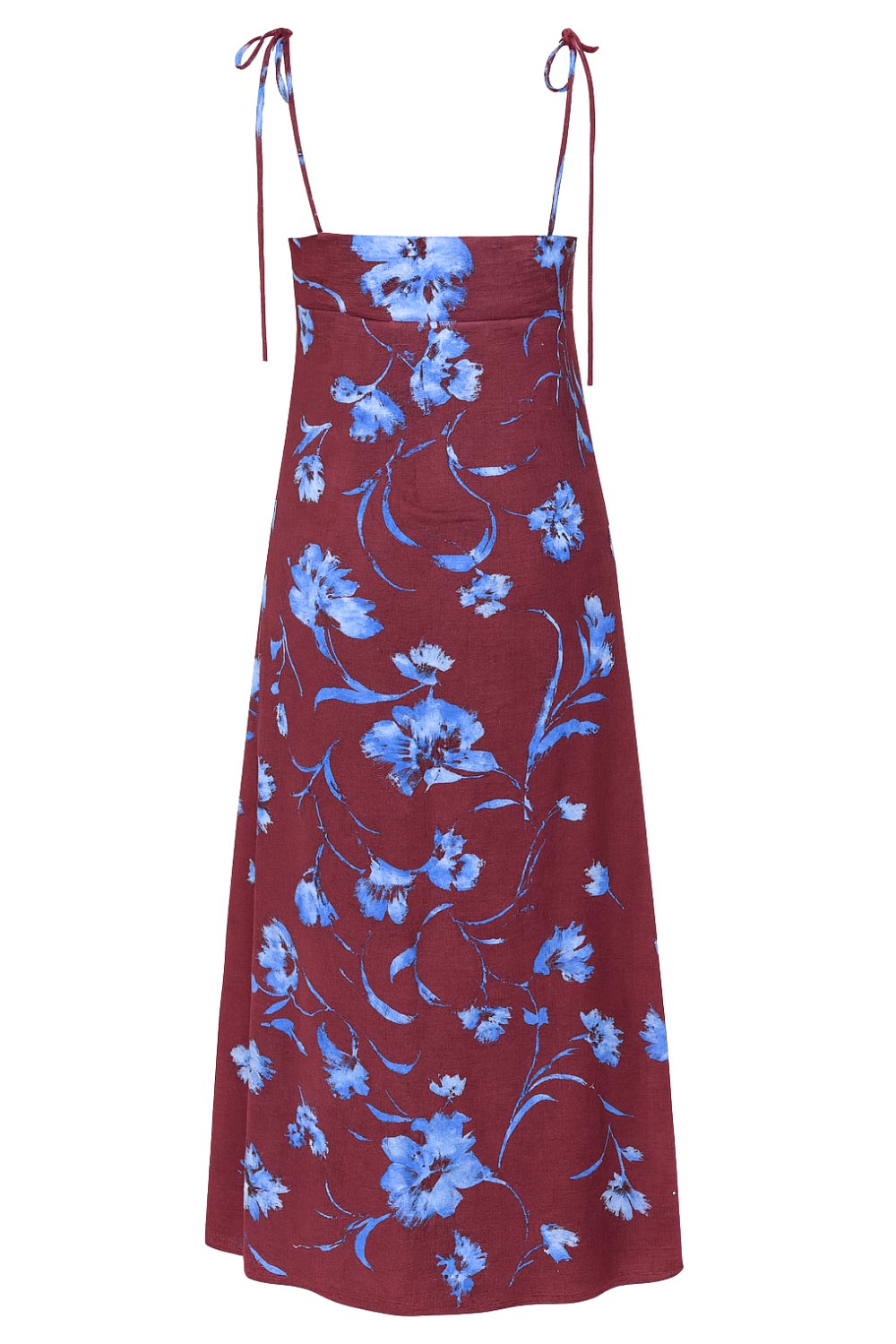 Blusa larga estampada, de fit fluido, tirantes delgados con nudo ajustable, escote v con cortes, abertura frontal y cierre con botón.