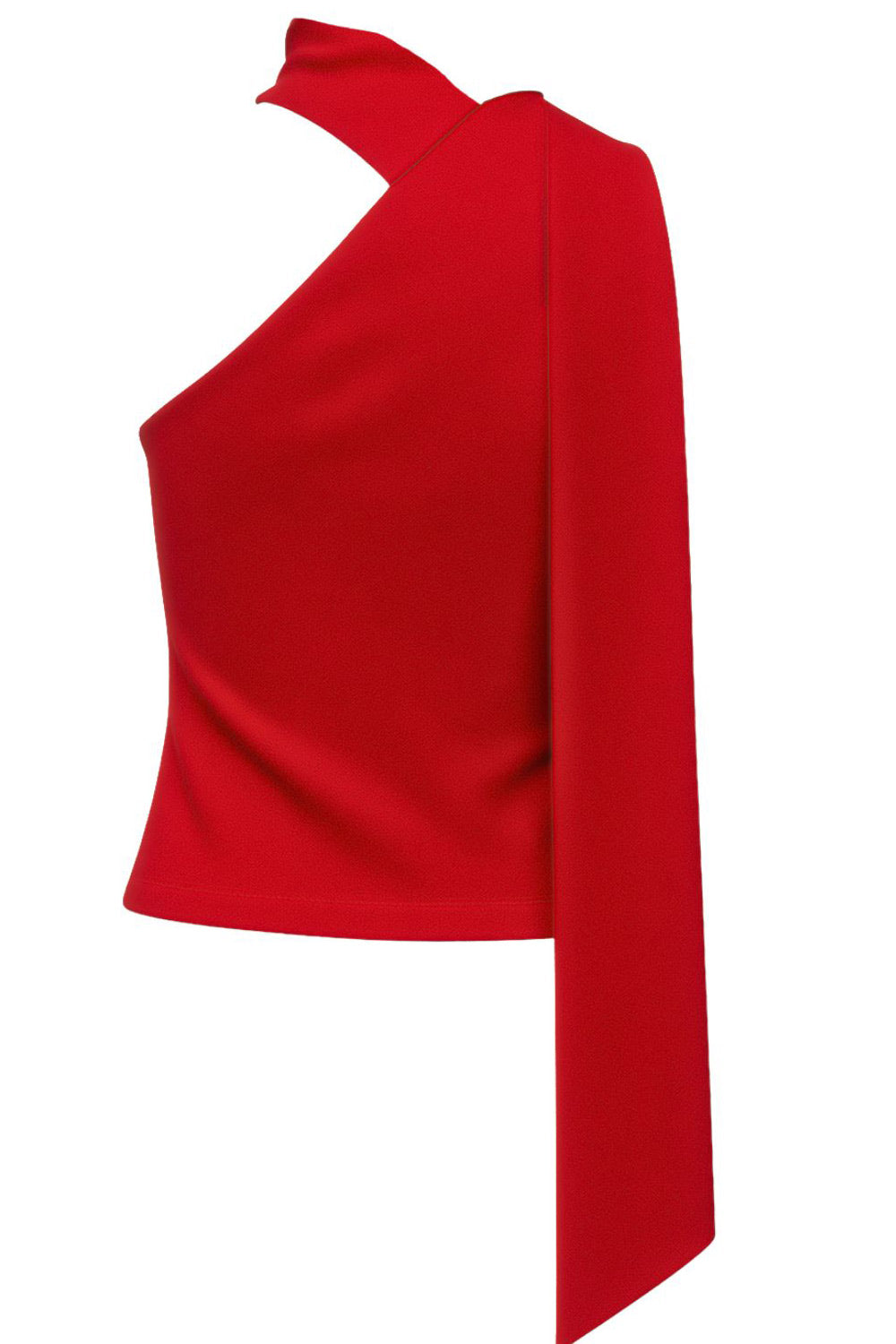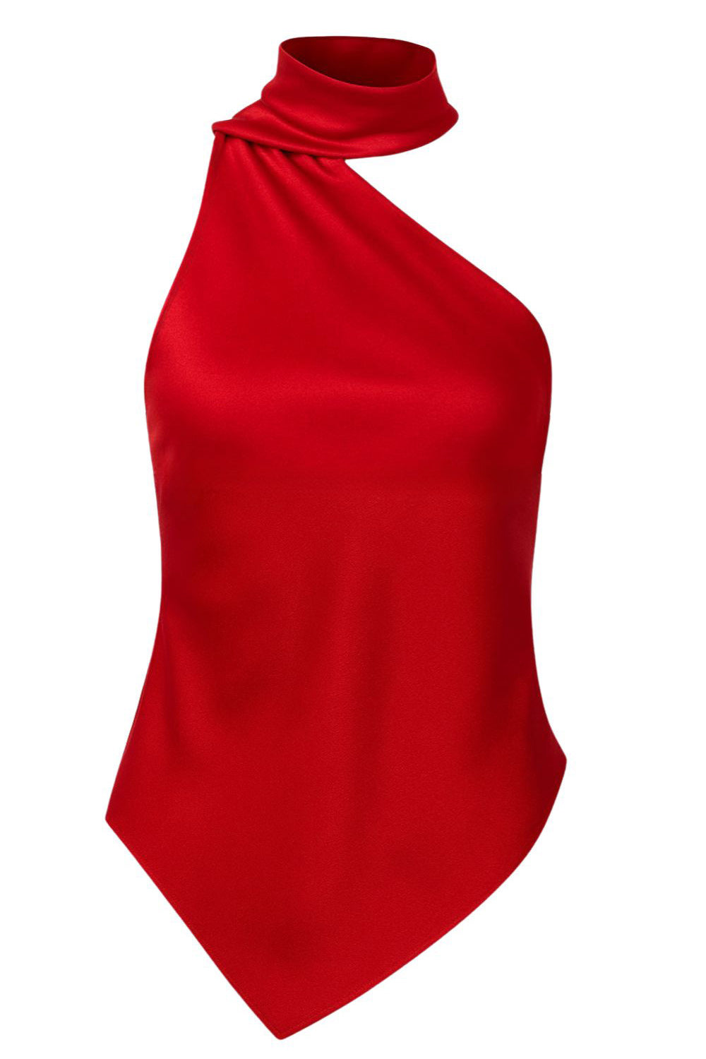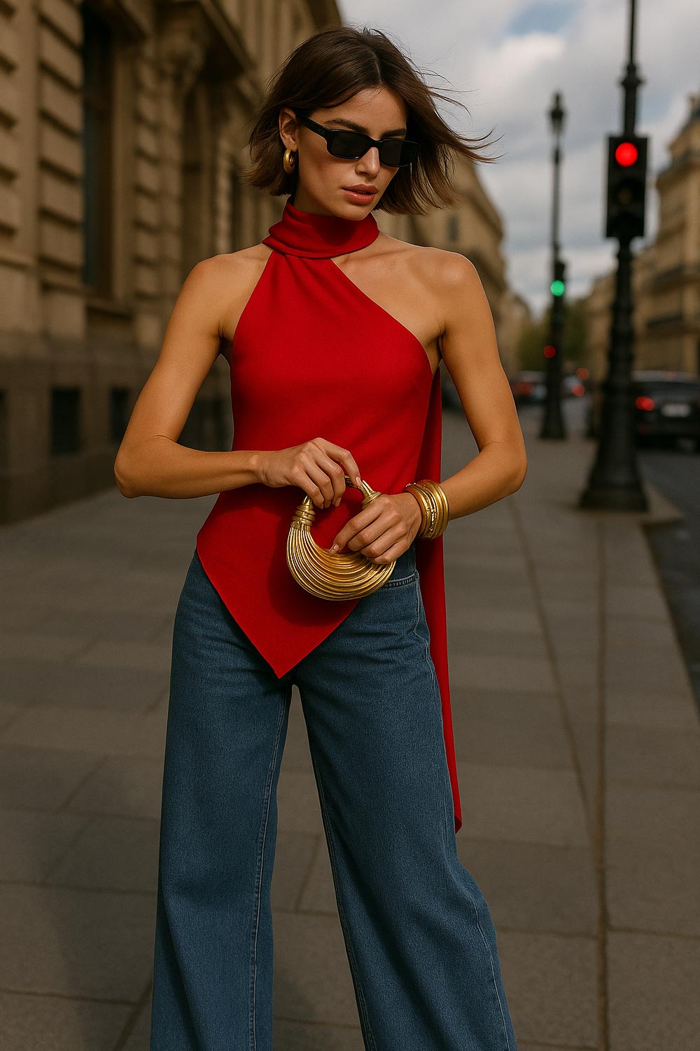Blusa de fit recto, de un hombro, sin mangas, escote diagonal con detalle de choker cruzado y bajo frontal asimétrico.
