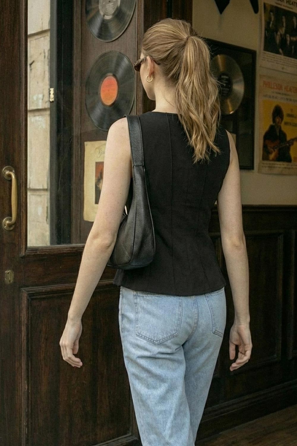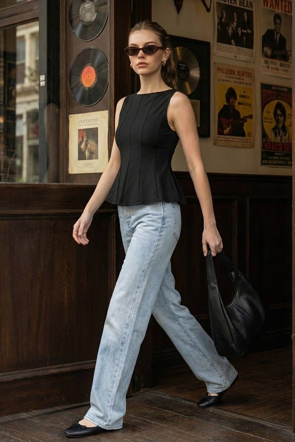 Blusa de fit ajustado, sin mangas, cuello barco, cortes frontales y peplum con olanes en bajo.