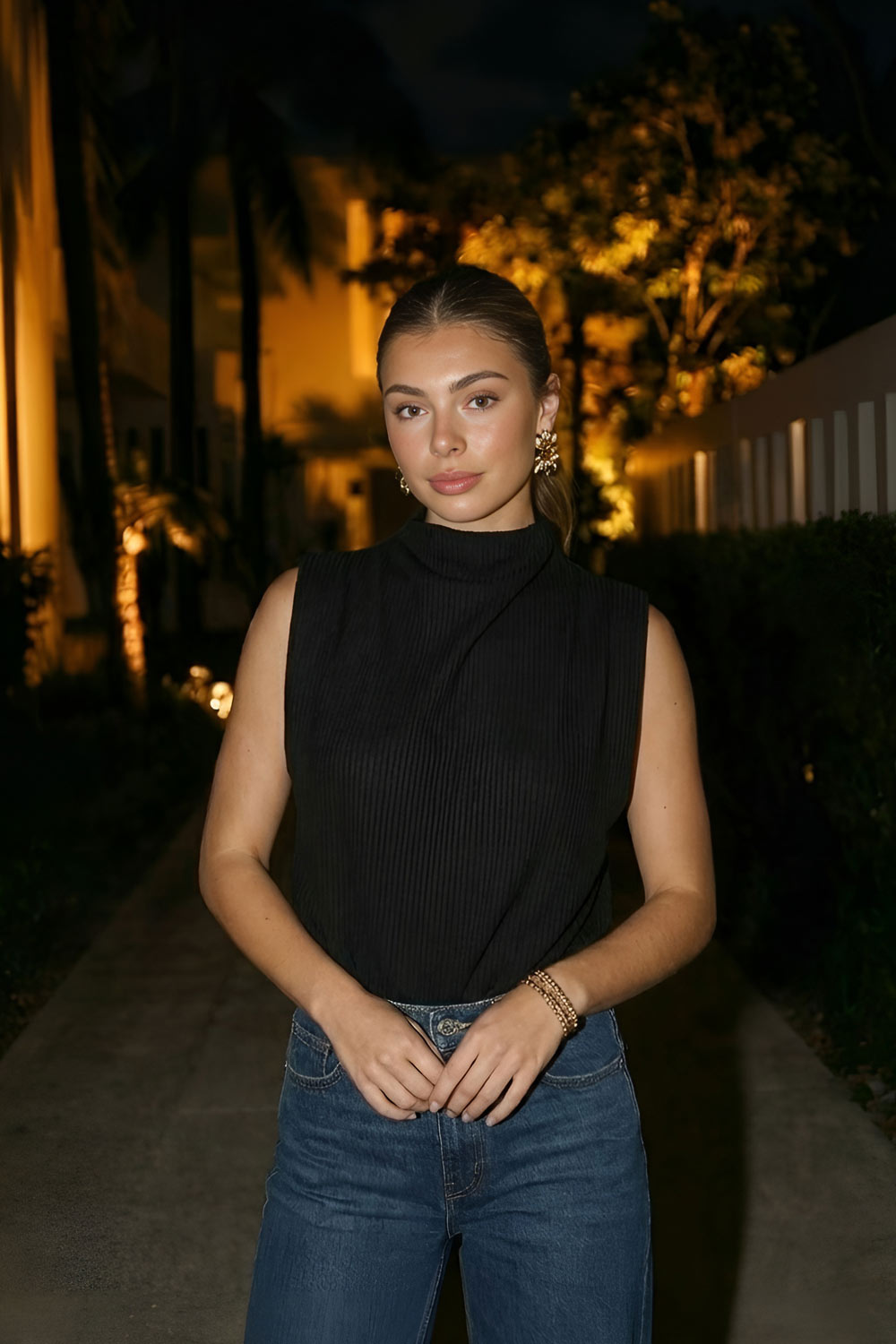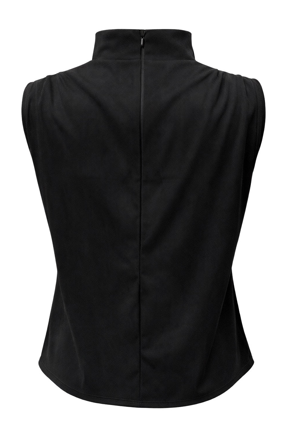 Blusa de fit recto, cuello mock seguido, sin mangas y plisados en hombros.