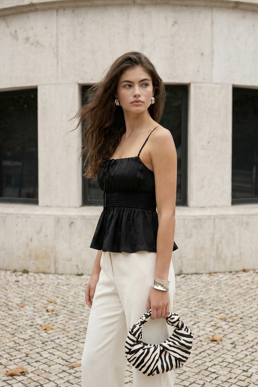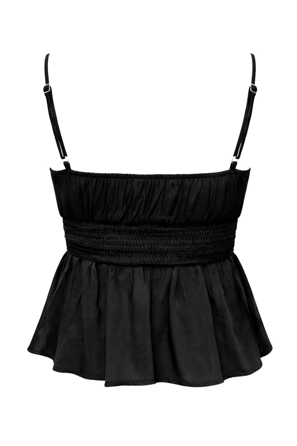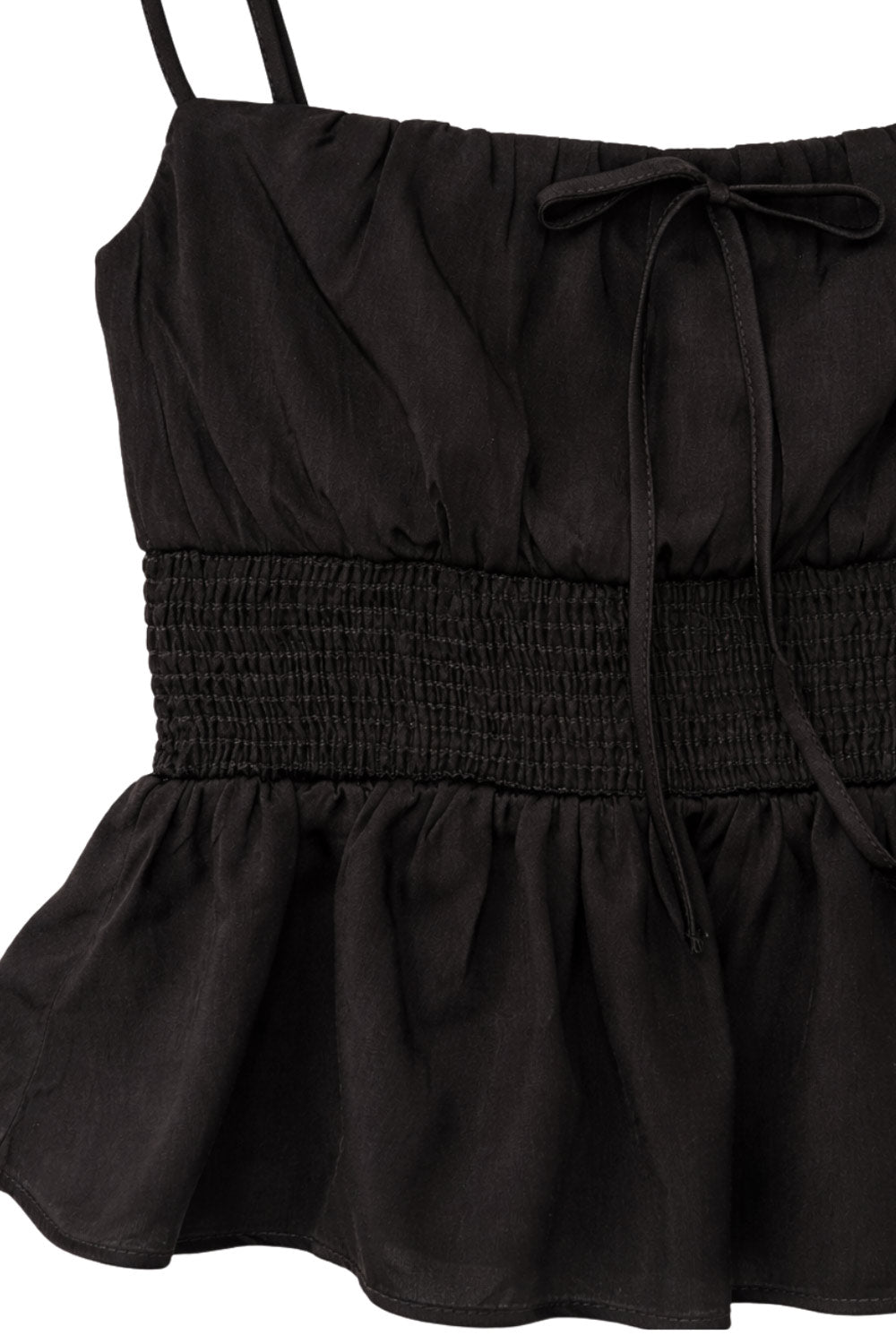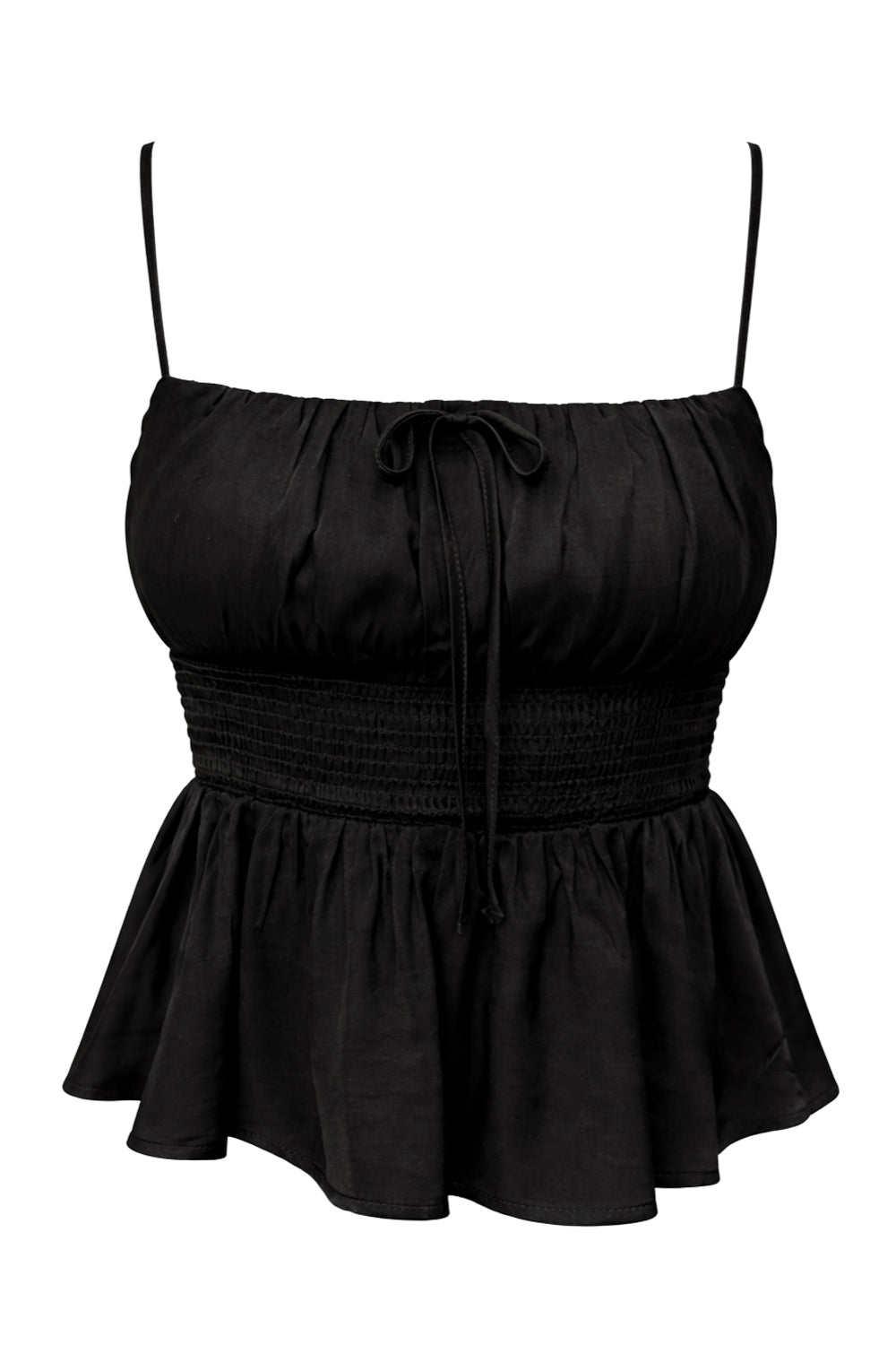 Blusa corta de tirantes delgados ajustables, escote recto con plisados y lazo ajustable frontal, fruncido en cintura y peplum de olanes en bajo.