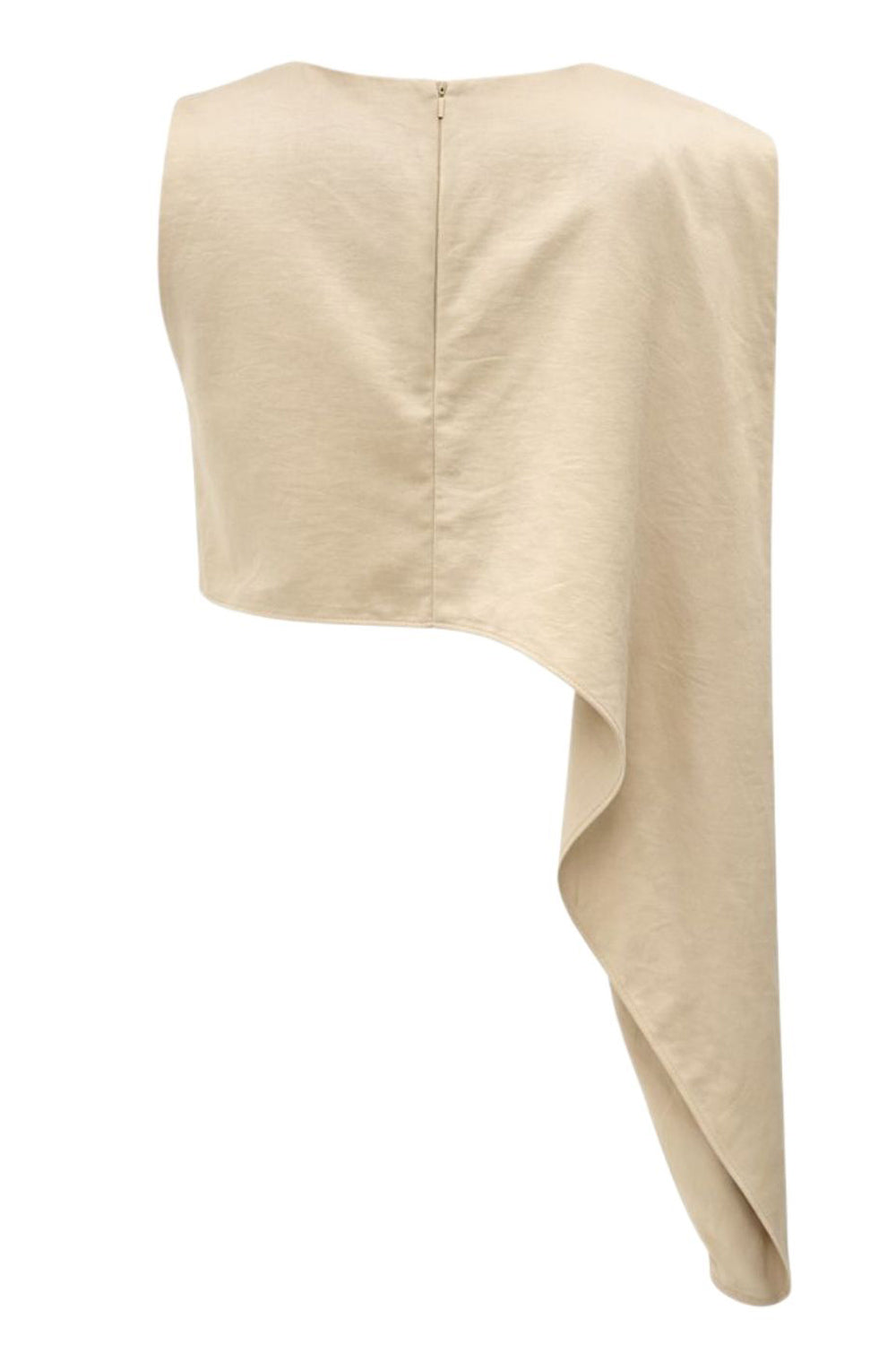 Blusa tipo túnica asimétrica, de cuello redondo, con hombreras, una manga corta seguida, fit fluido y bajo asimétrico.