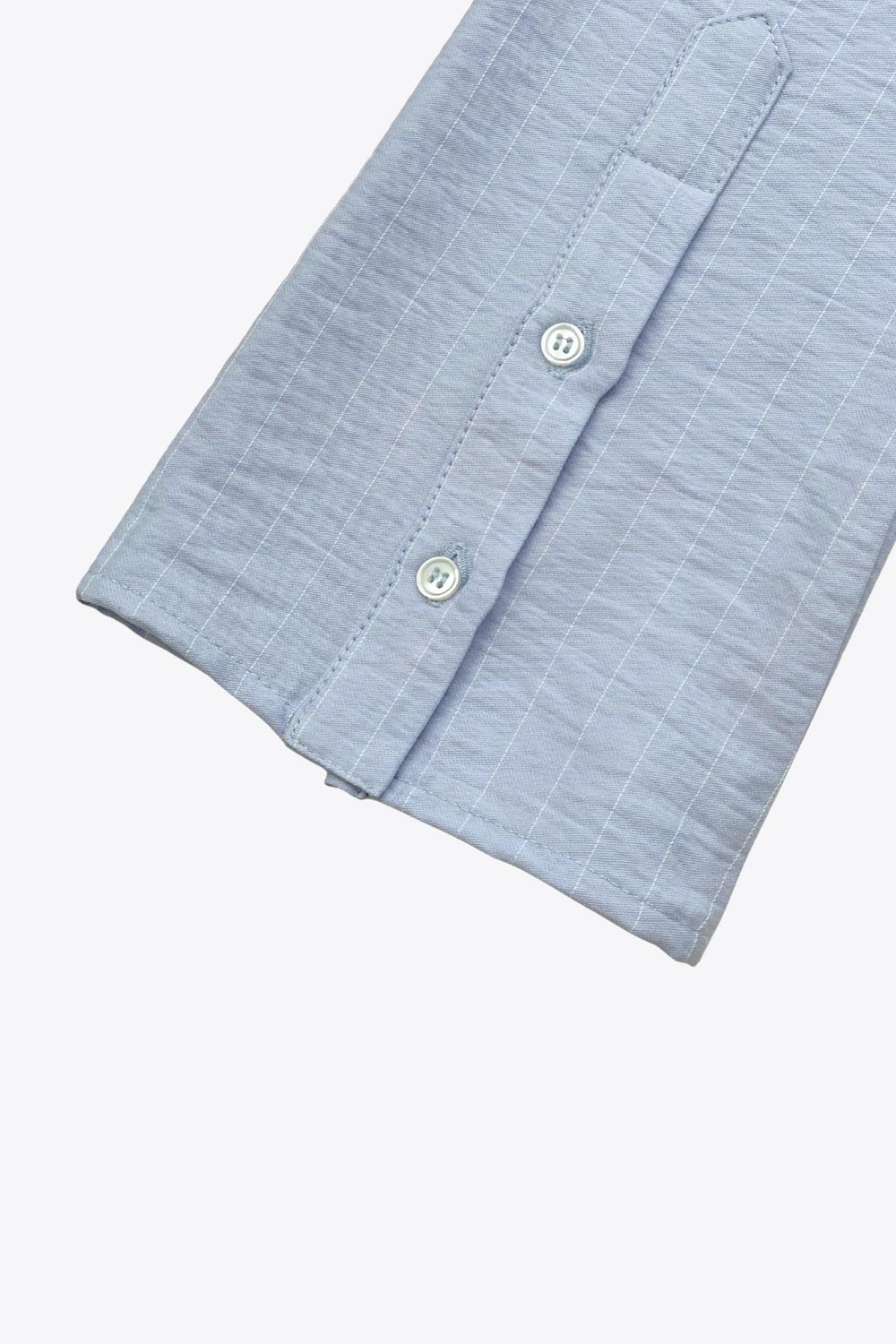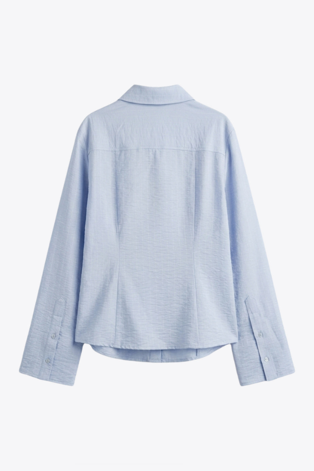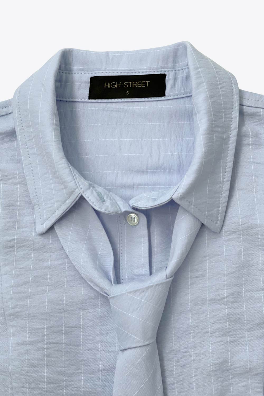 Camisa de fit ajustado, estampado rayas, cuello camisero, manga larga con puño amplio abotonado, pinzas, bajo curveado y cierre frontal con hilera de botones. Detalle de corbata del mismo tejido.