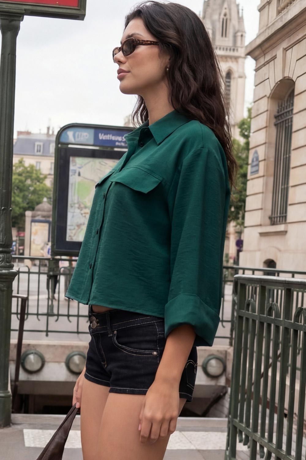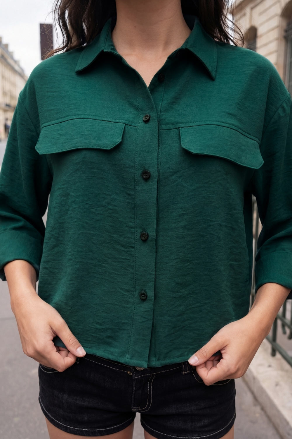 Camisa corta de estilo utilitario. Corte recto, silueta amplia y largo crop. Frente con cuello camisero clásico, tapeta de botones y dos bolsillos con tapa en el pecho. Espalda con canesú y tablón central invertido.