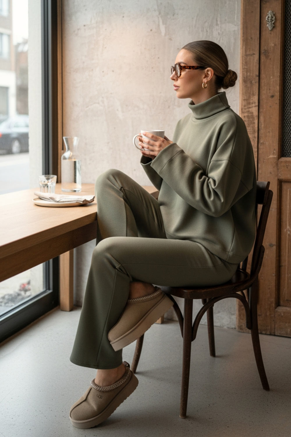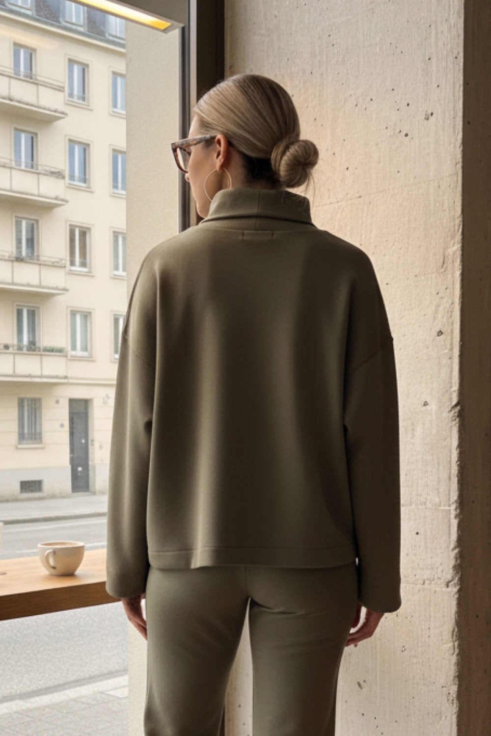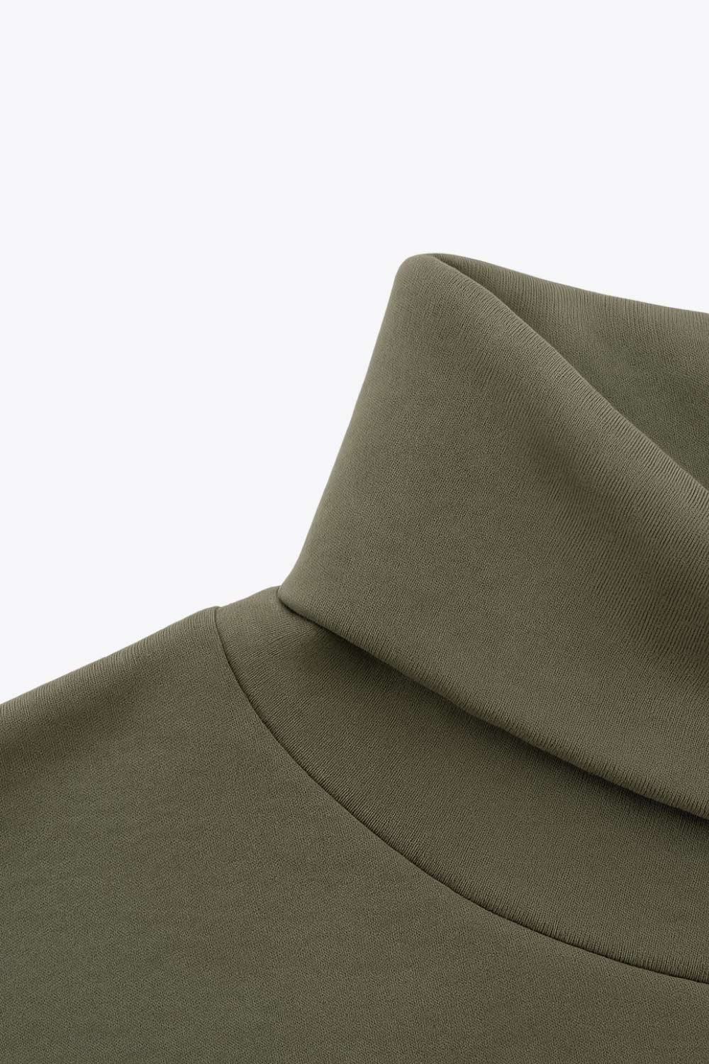 Jersey de fit fluido, cuello alto con doblez, manga larga con hombro caído y rib en puño.