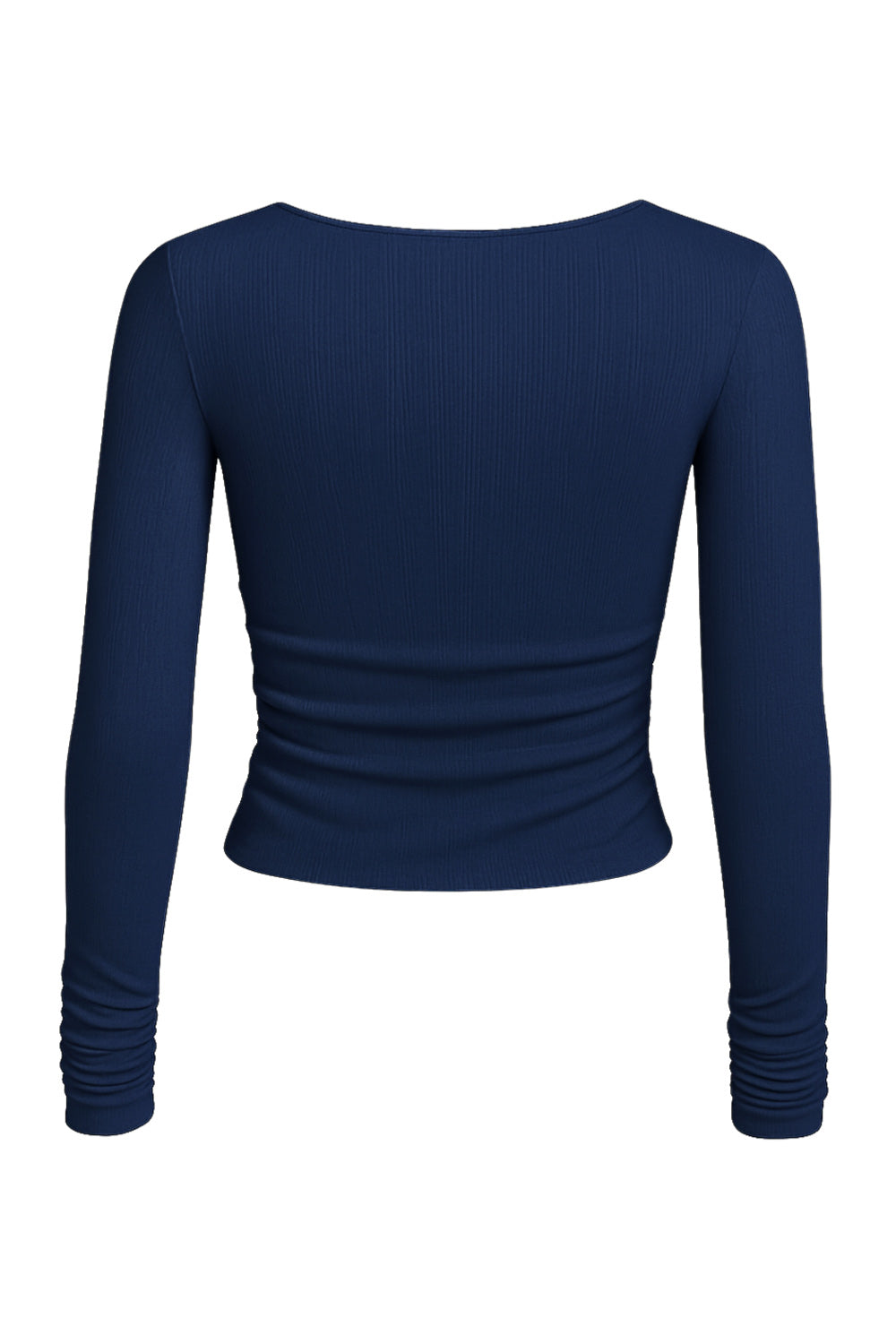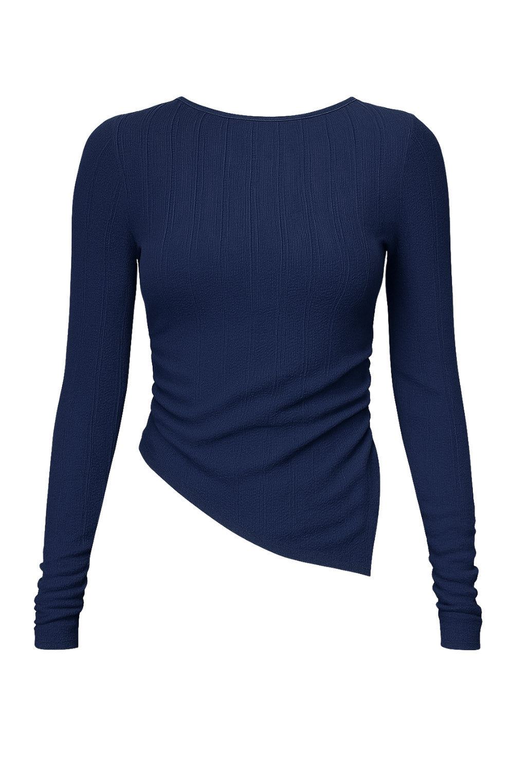Top corto fit ajustado, cuello barco, manga larga y bajo frontal asimétrico. Detalle de textura en tejido, plisados laterales en cintura y puños.