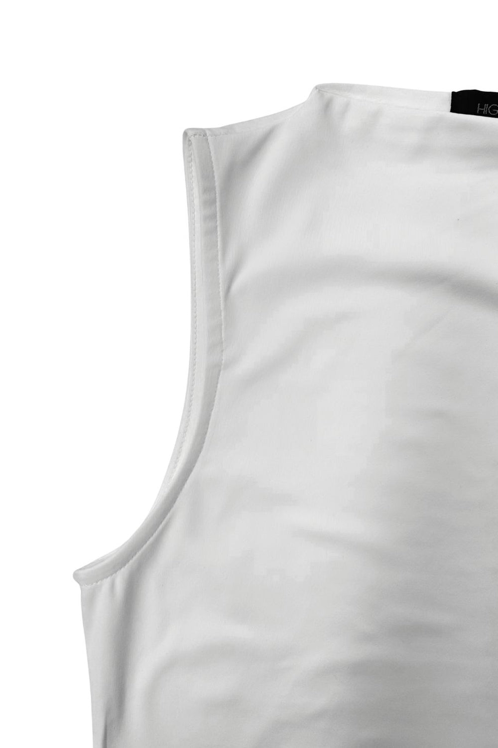 Top asimétrico de fit recto, cuello barco, sin mangas, bajo asimétrico diagonal con abertura lateral y lazo amarrable decorativo.