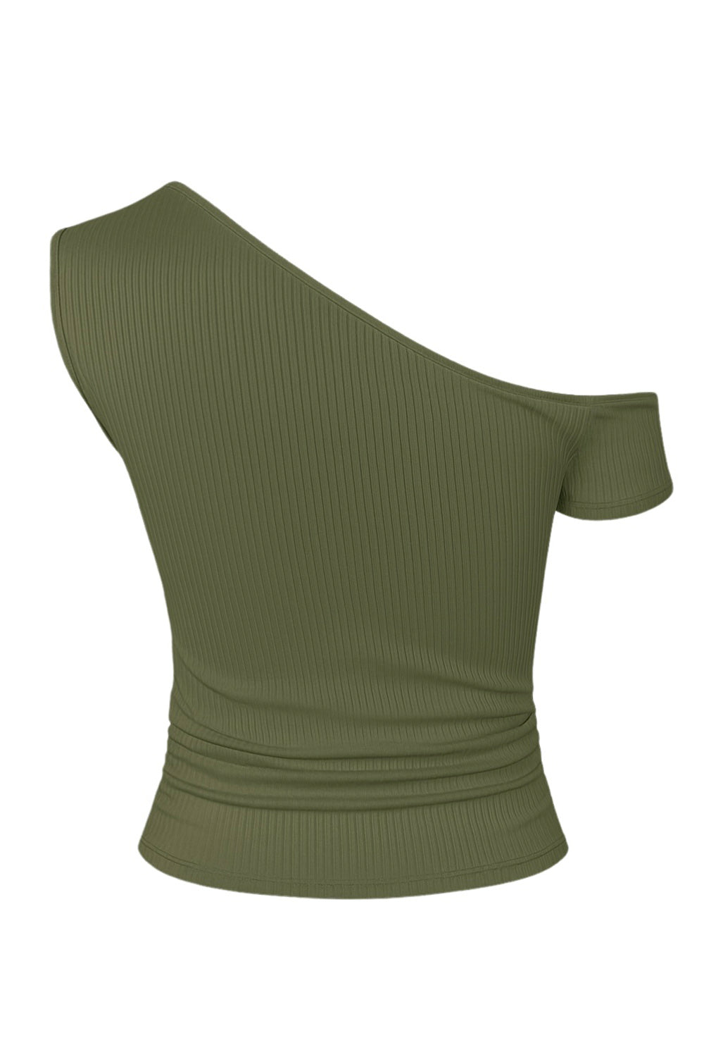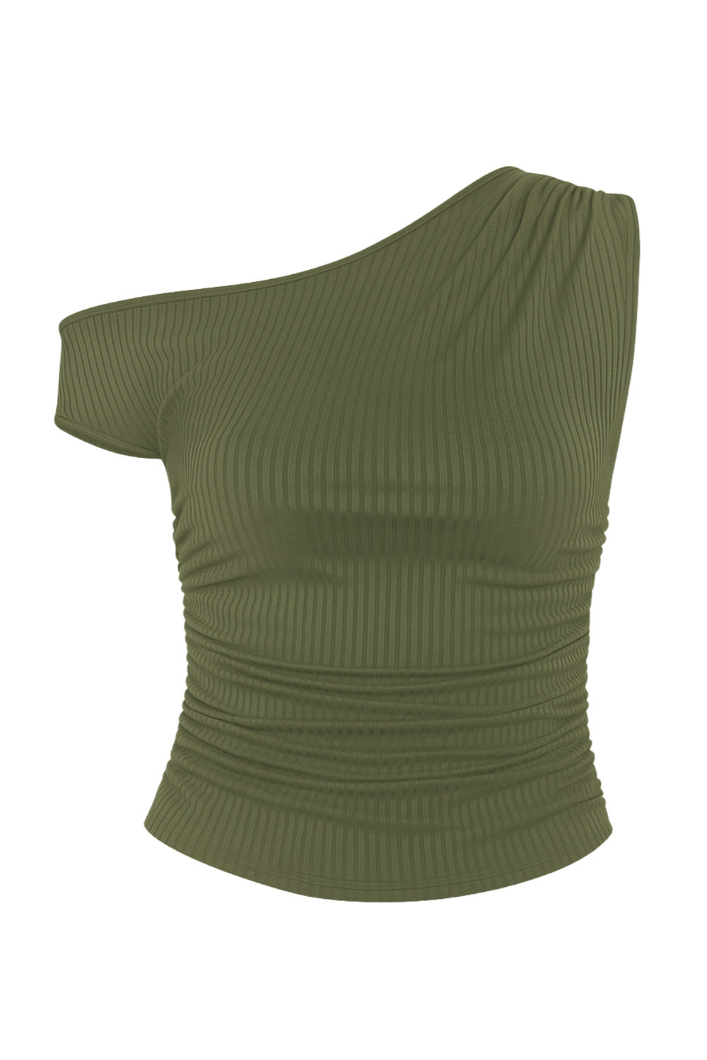 Top corto canalé asimétrico de fit ajustado, un manga corta seguida con hombro descubierto, plisados en costados y un hombro.