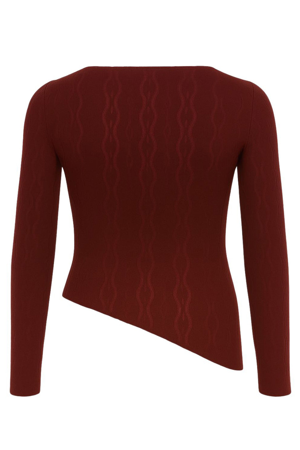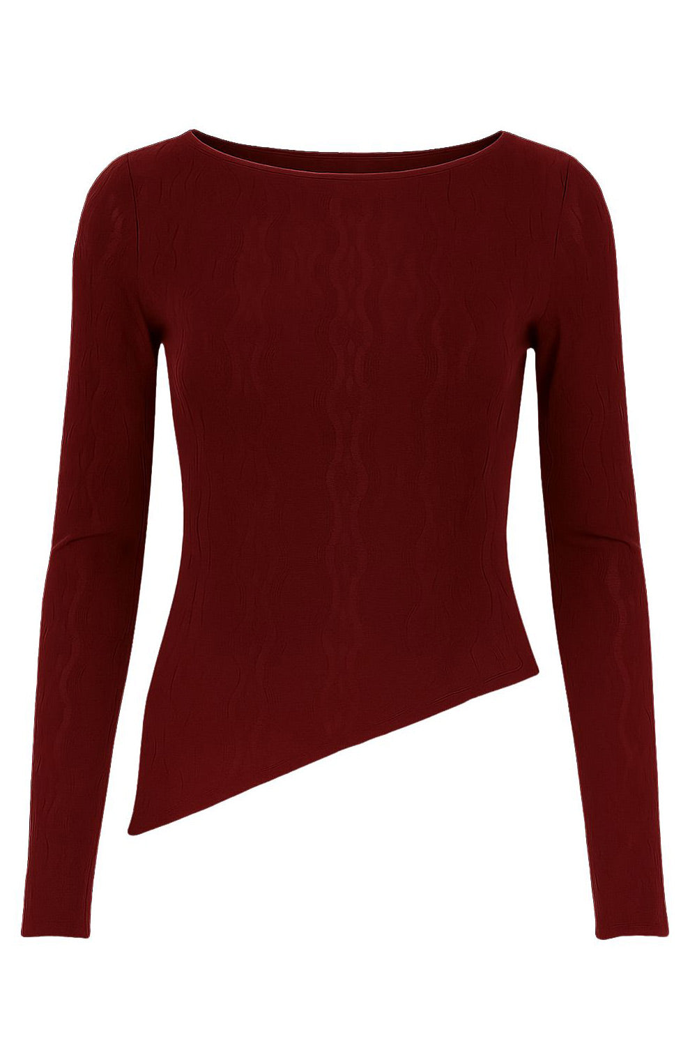 Top de encaje, fit ajustado, cuello barco, manga larga y bajo asimétrico.