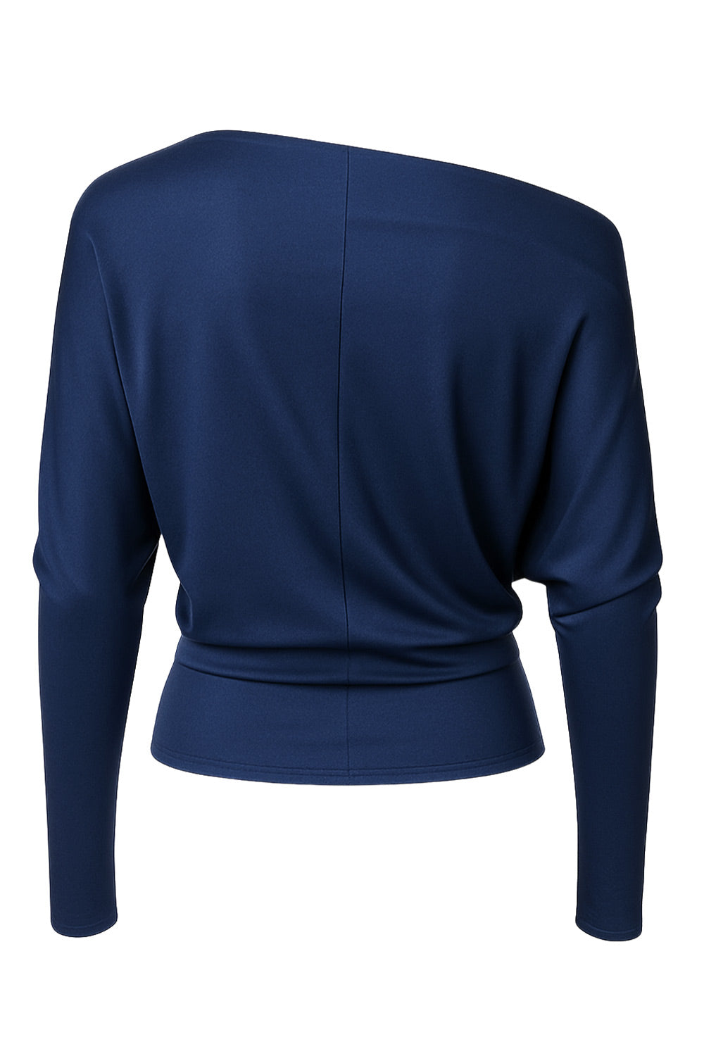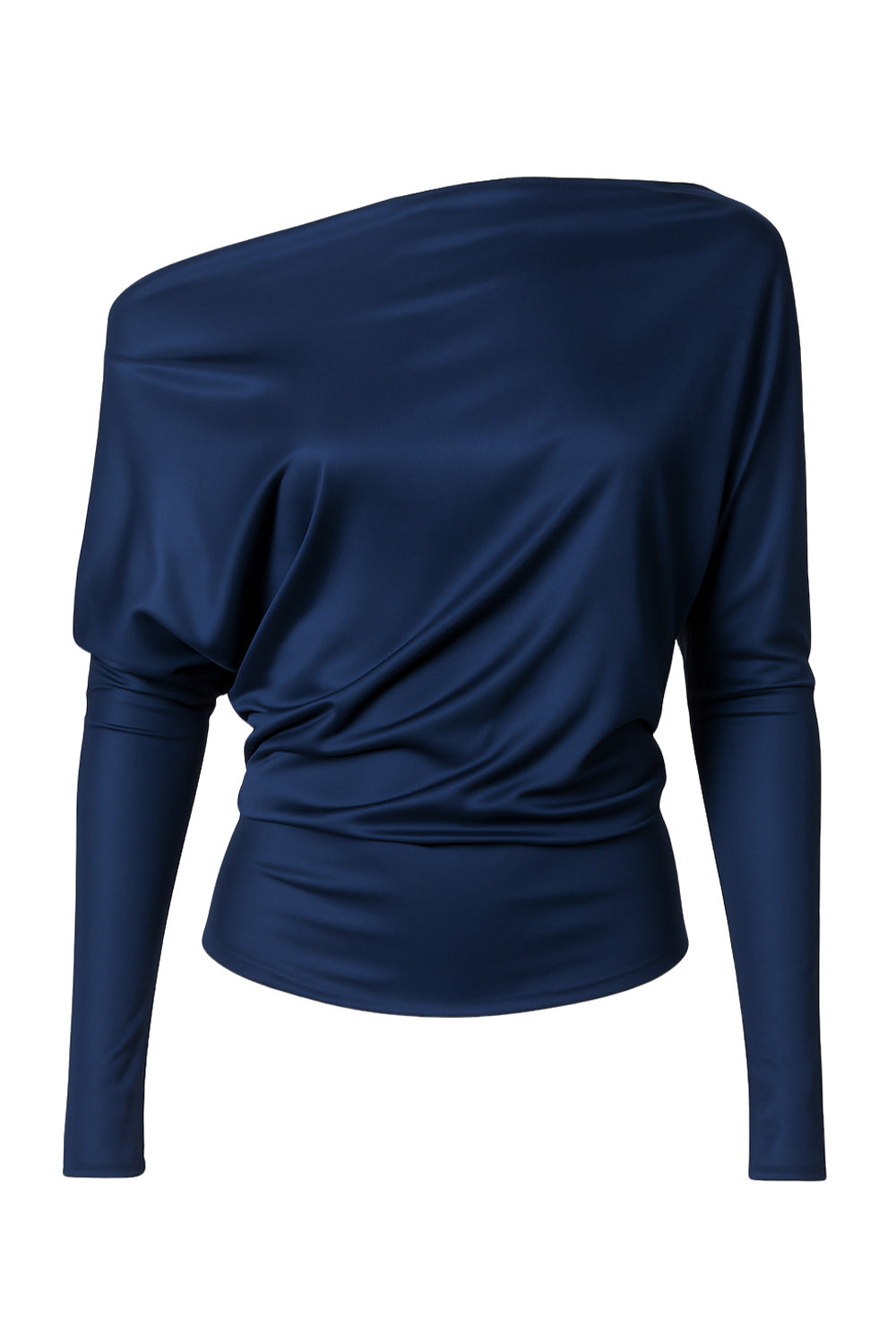 Top satinado de cuello diagonal asimétrico con hombro descubierto y manga larga seguida.