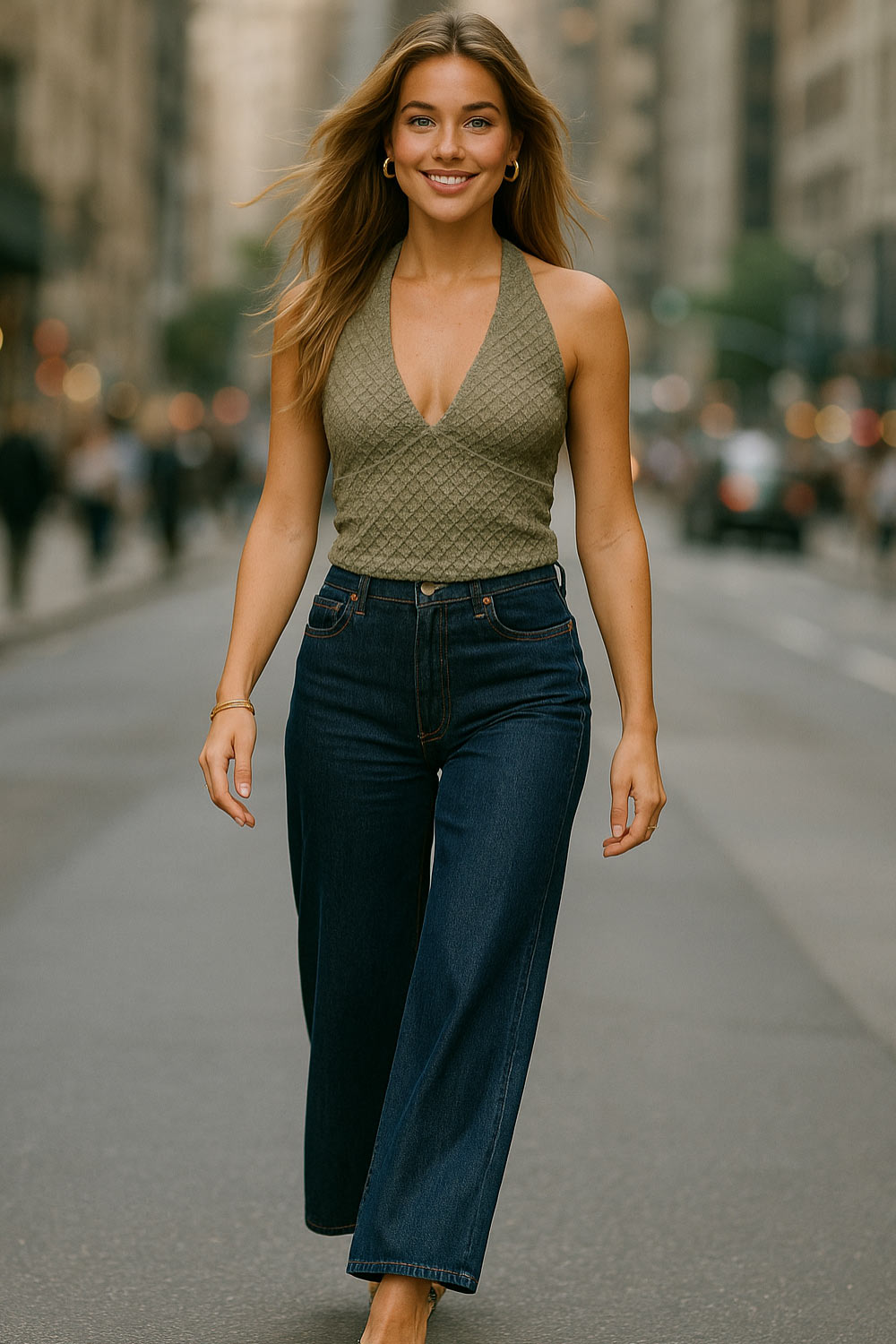 Top corto de cuello halter con escote v y cortes frontales, fit ajustado, escote en espalda y detalle de textura en tejido.