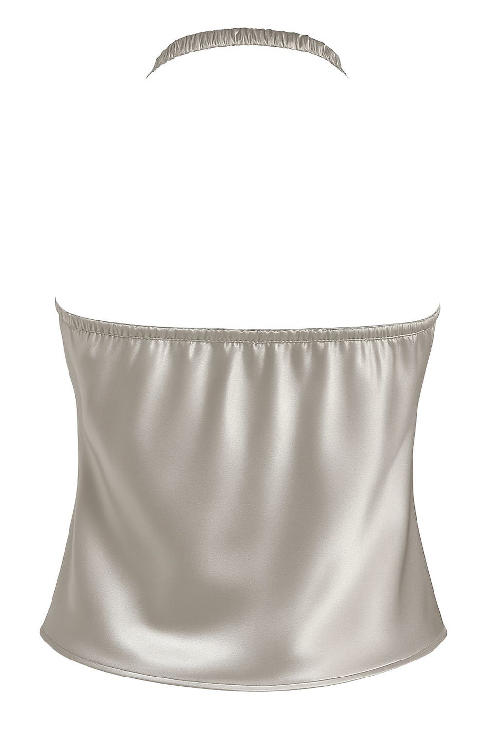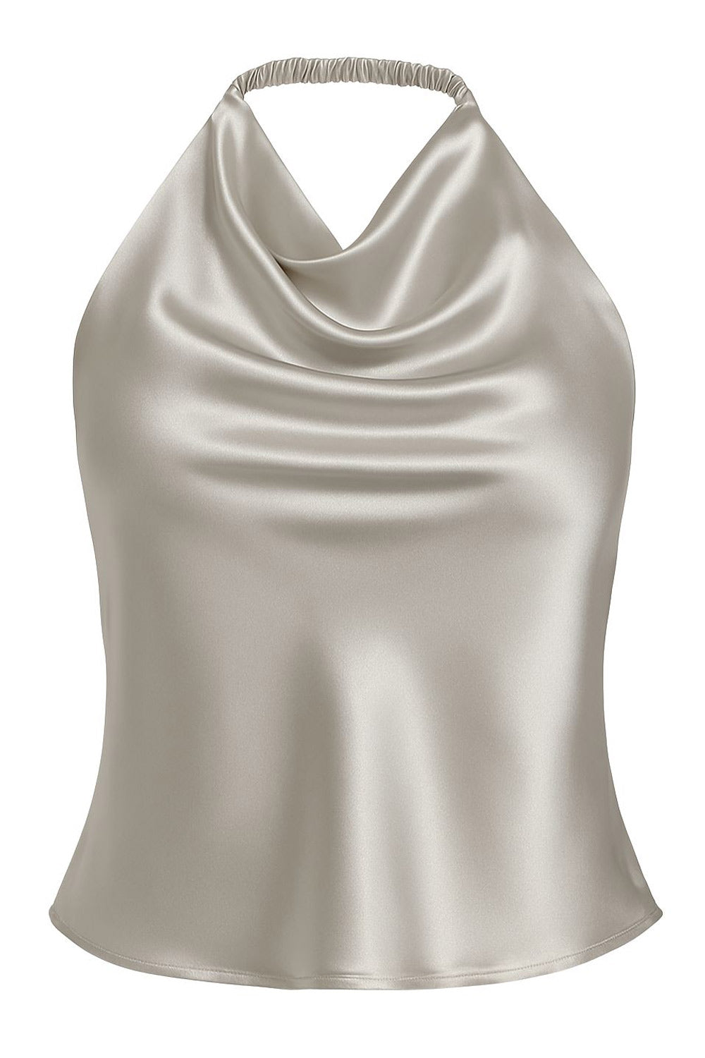 Top corto satinado de cuello halter fluido, sin mangas, fit ajustado y escote en espalda.