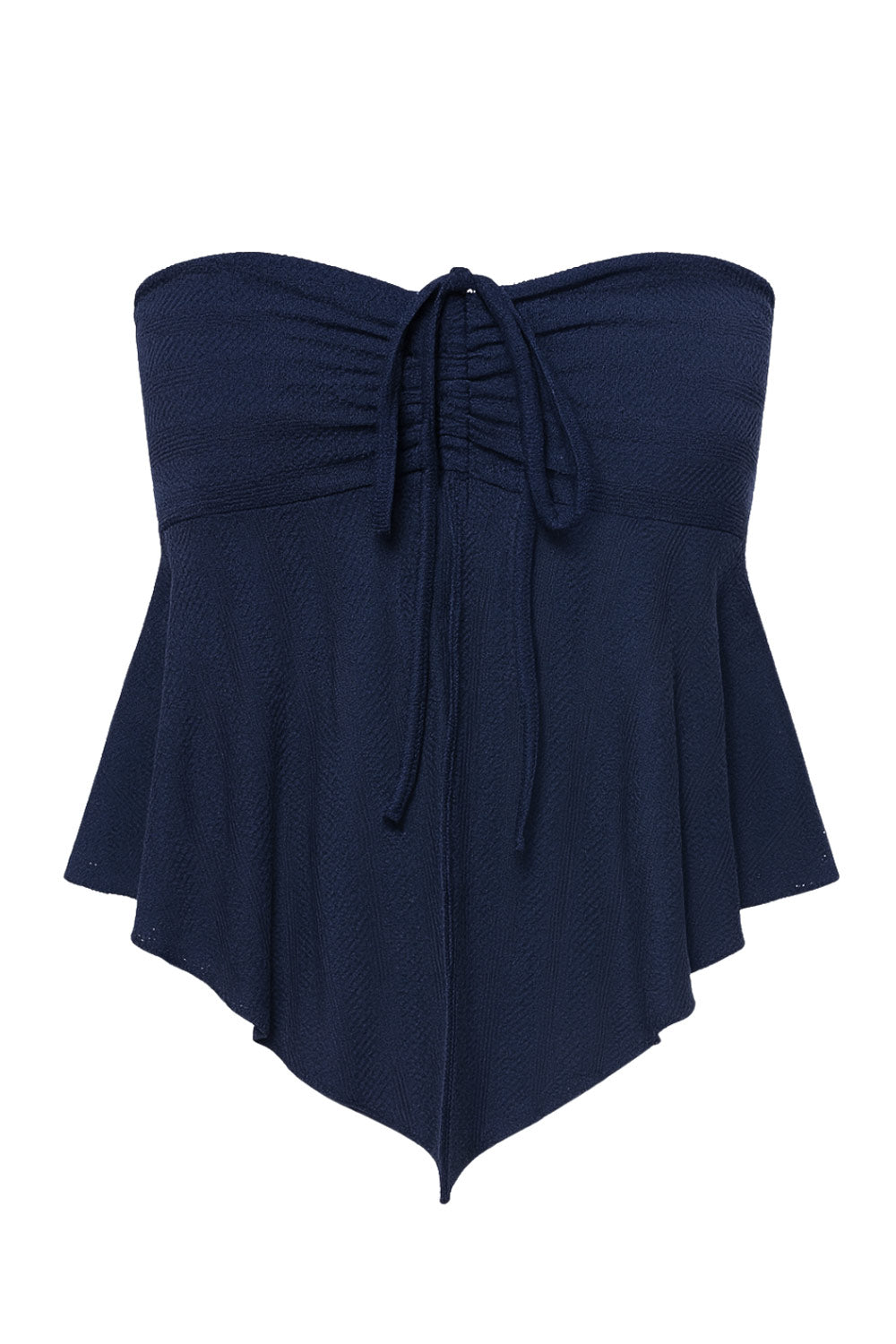 Top corto halter con lazo amarrable posterior, escote corazón con jareta ajustable y plisados frontales. Detalle de olanes y bajo asimétrico frontal con abertura.