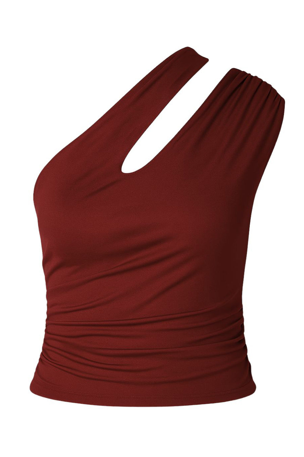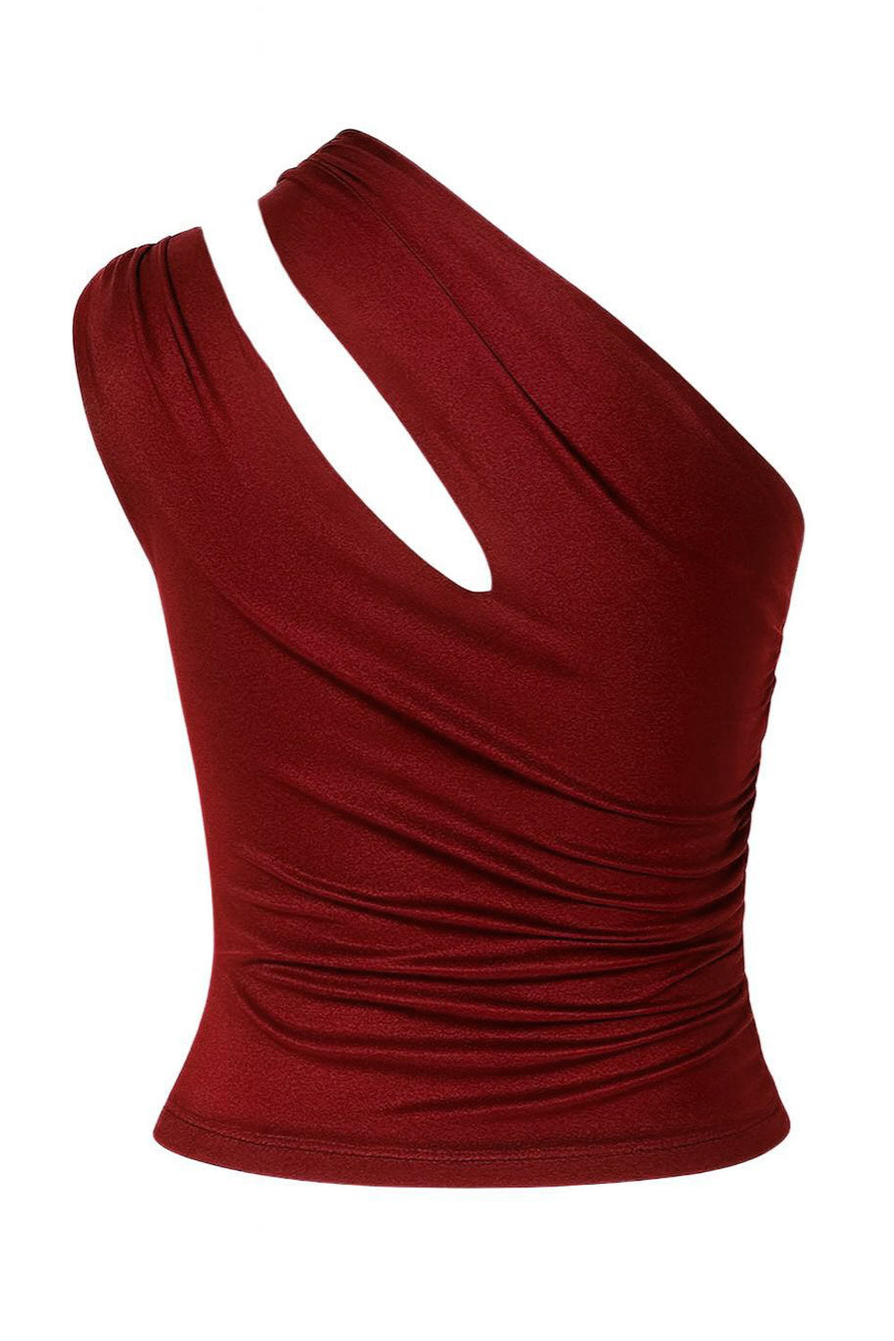 Top corto de fit ajustado, escote diagonal, plisados en costados, asimétrico de un hombro con cut out y plisados decorativos.