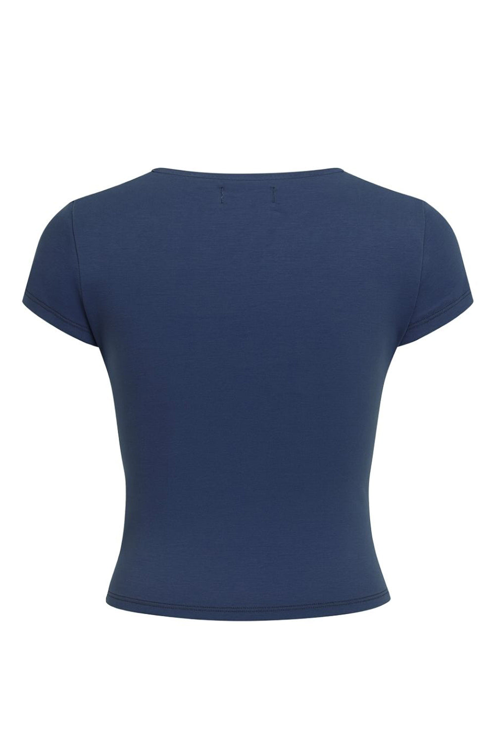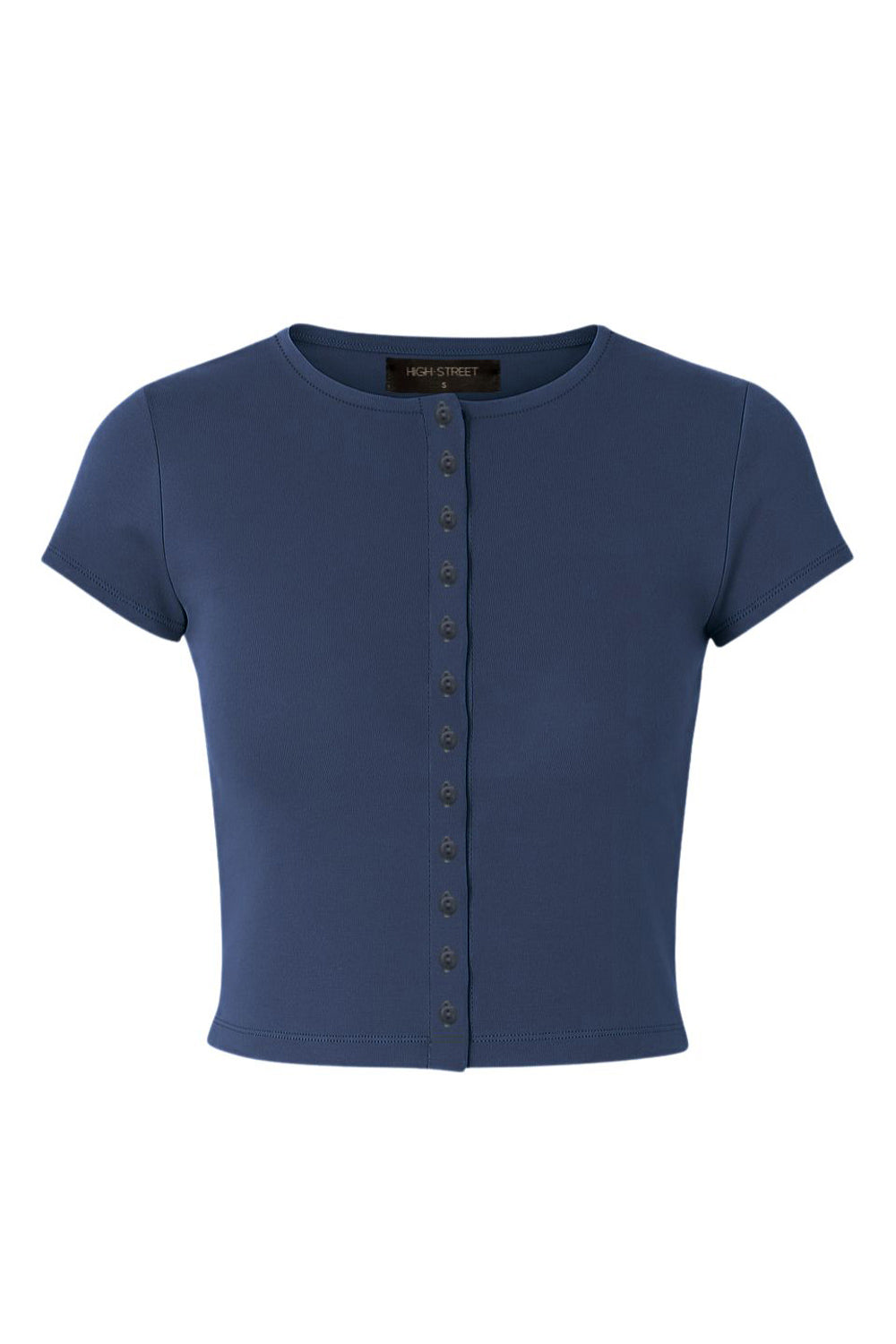 Top corto de fit ajustado, cuello redondo, manga corta y cierre frontal con hilera de botones.