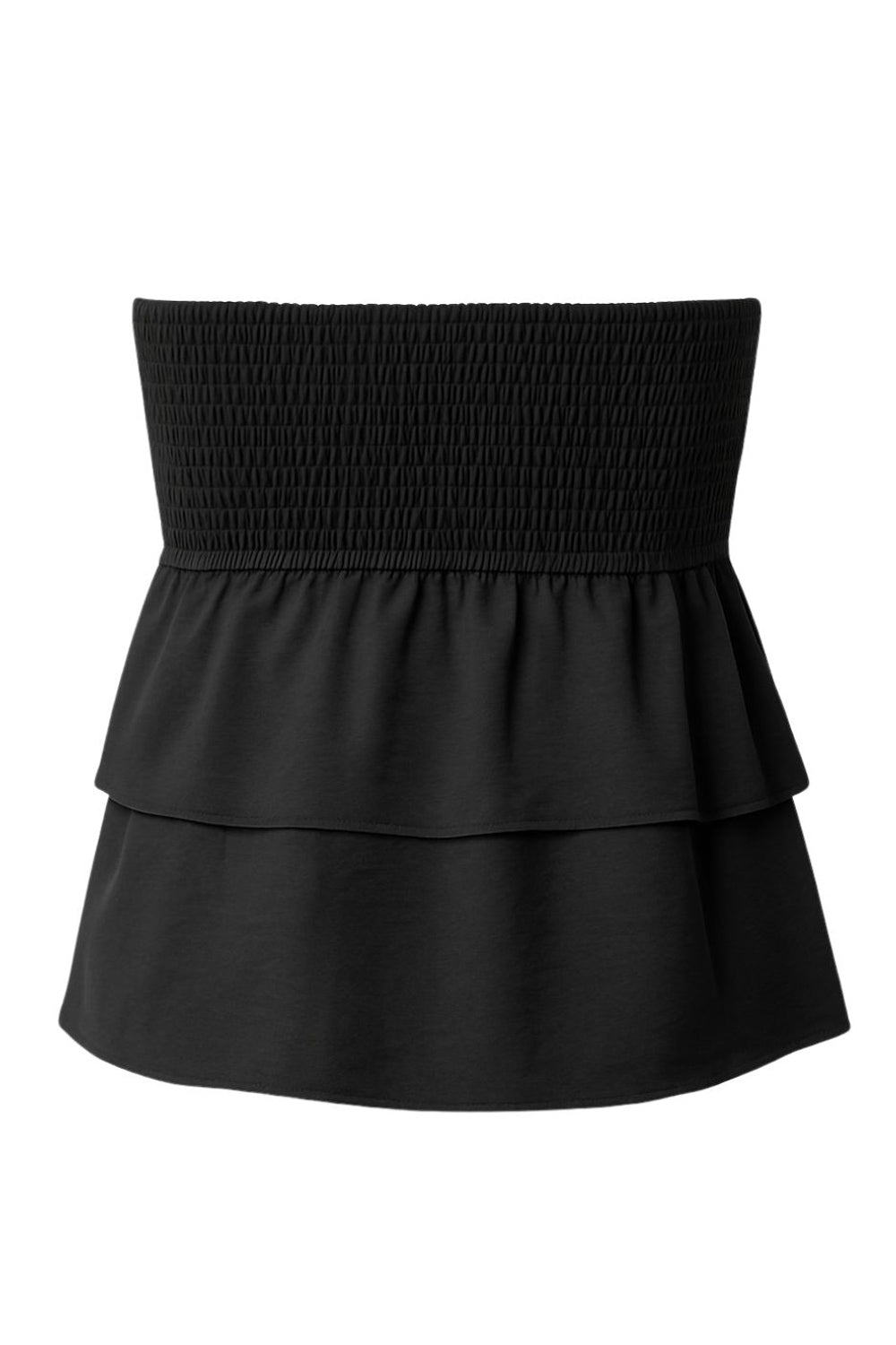 Top strapless de fit ajustado, escote recto con fruncido y peplum con capas de olanes en bajo.