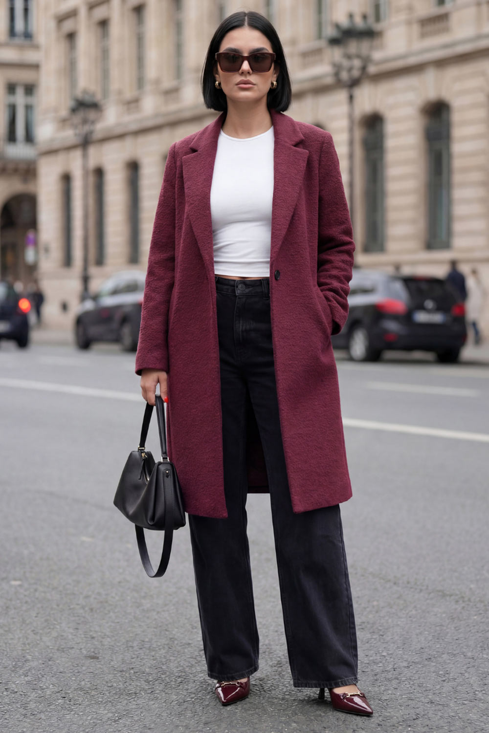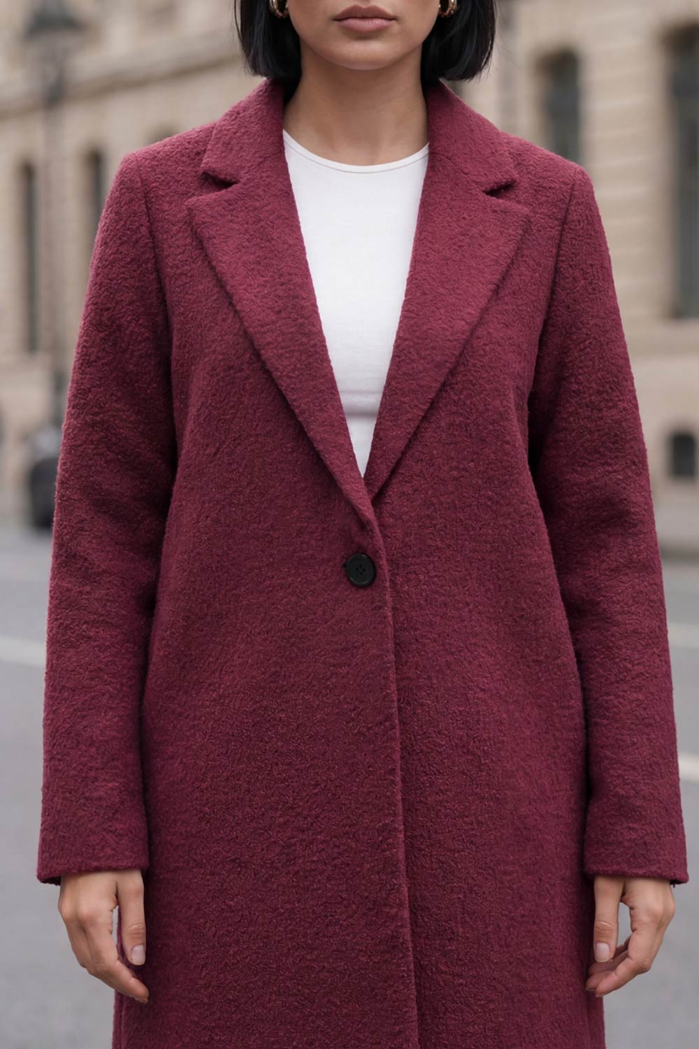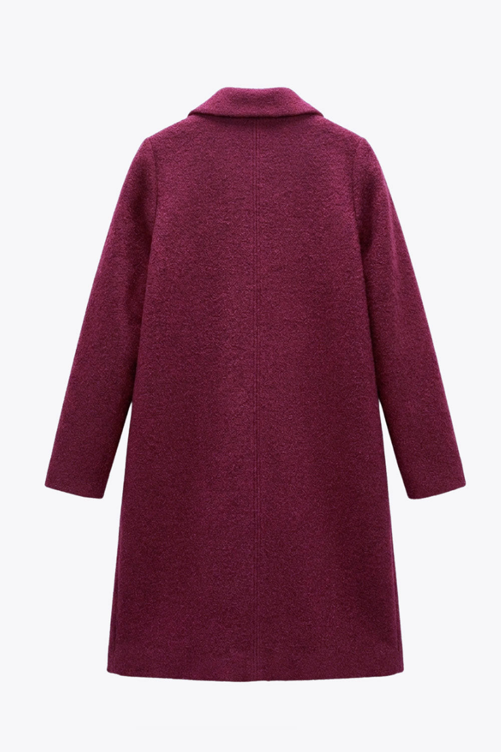 Abrigo largo de borreguillo, fit recto, con solapa y hombreras, manga larga y cierre frontal con botones en contraste.