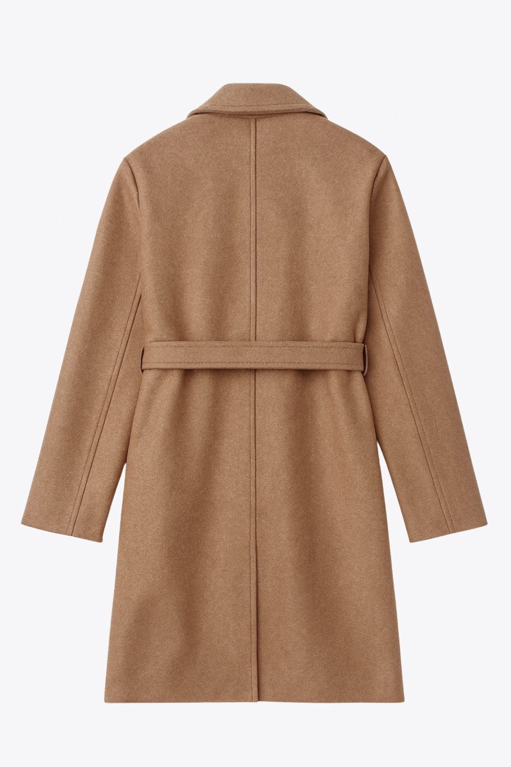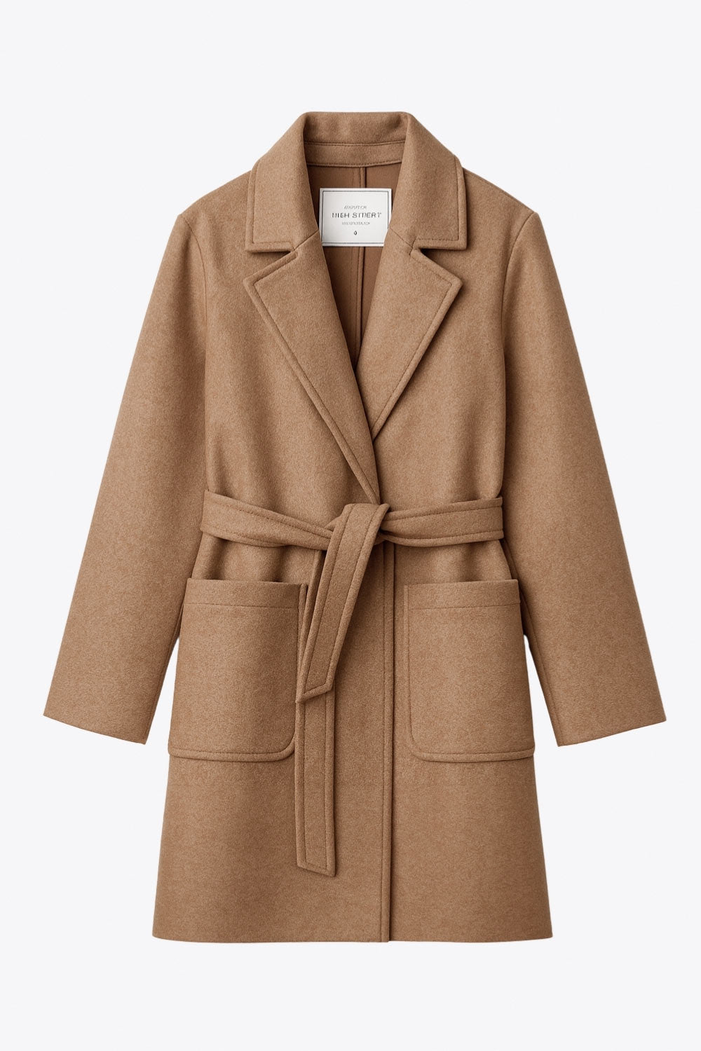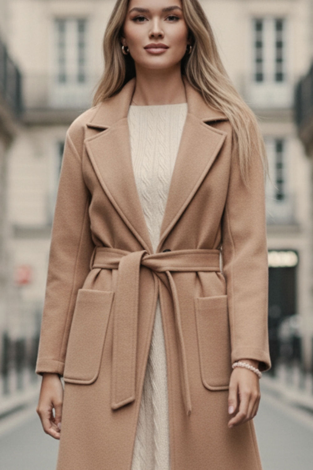 Abrigo largo de manga larga, con solapa, bolsillos delanteros de parche, trabillas y cinturón amarrable del mismo tejido.