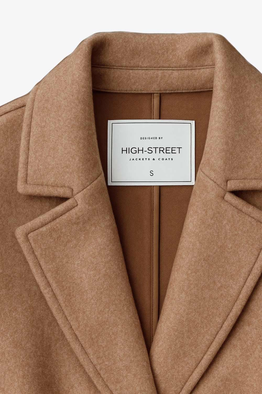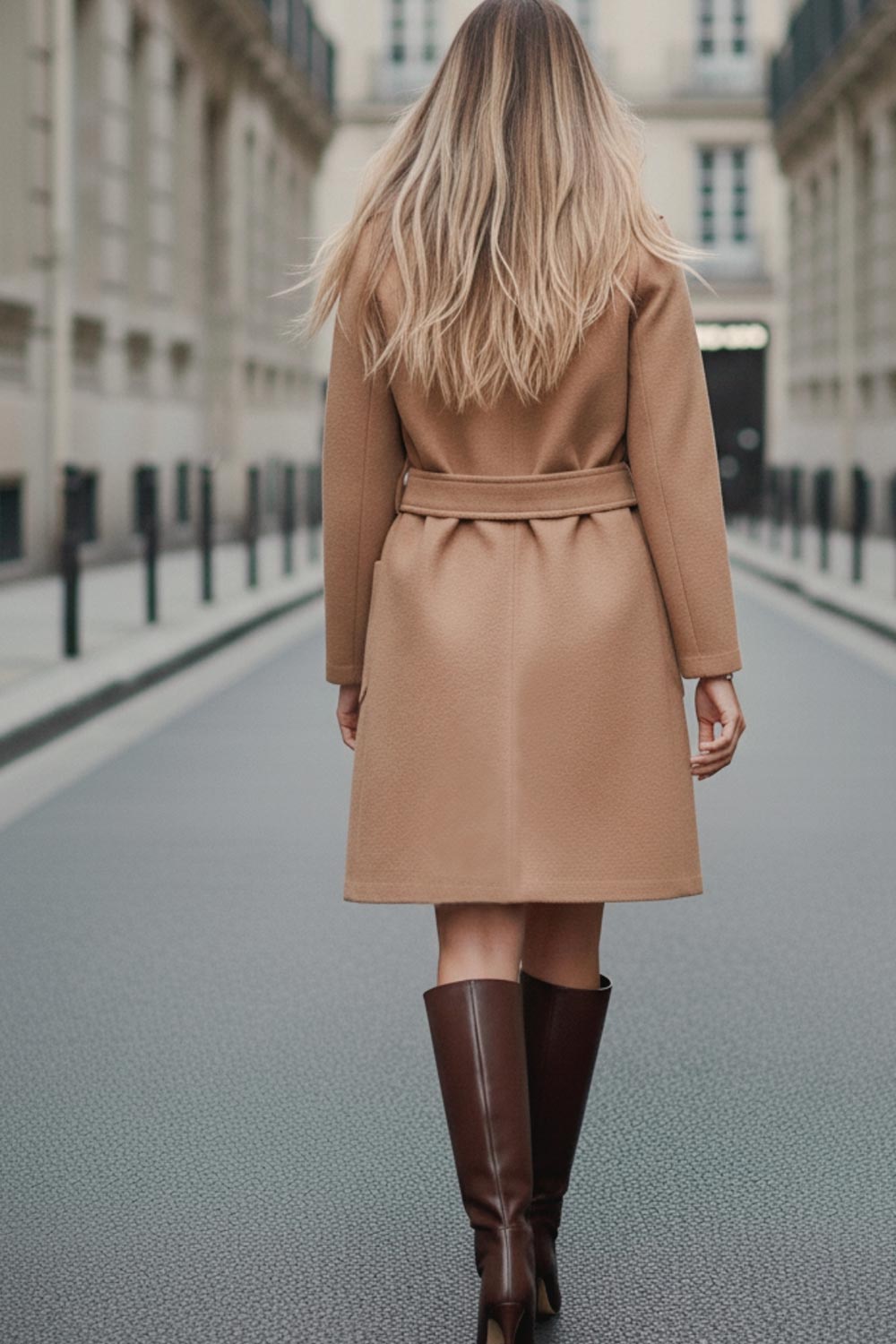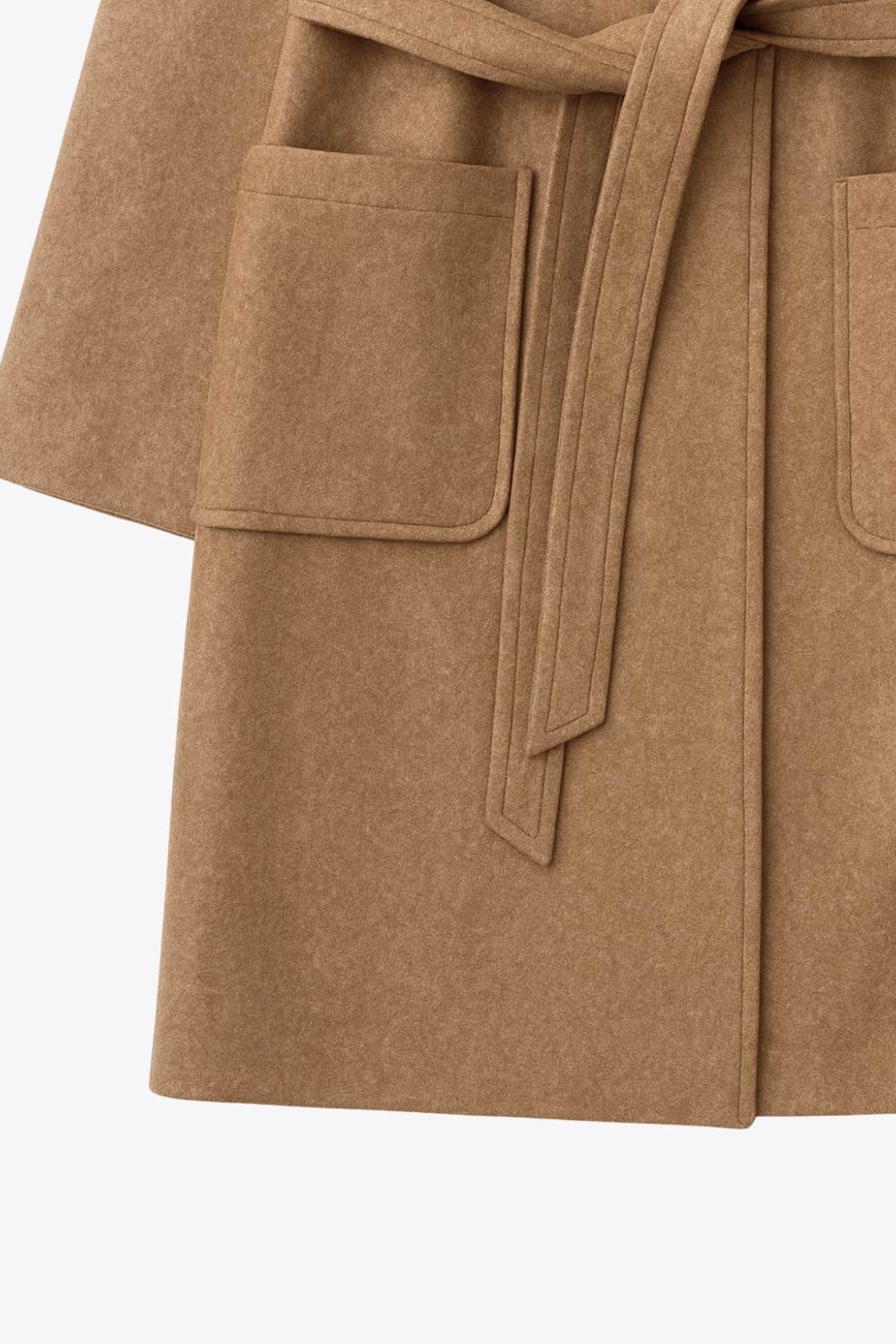 Abrigo largo de manga larga, con solapa, bolsillos delanteros de parche, trabillas y cinturón amarrable del mismo tejido.