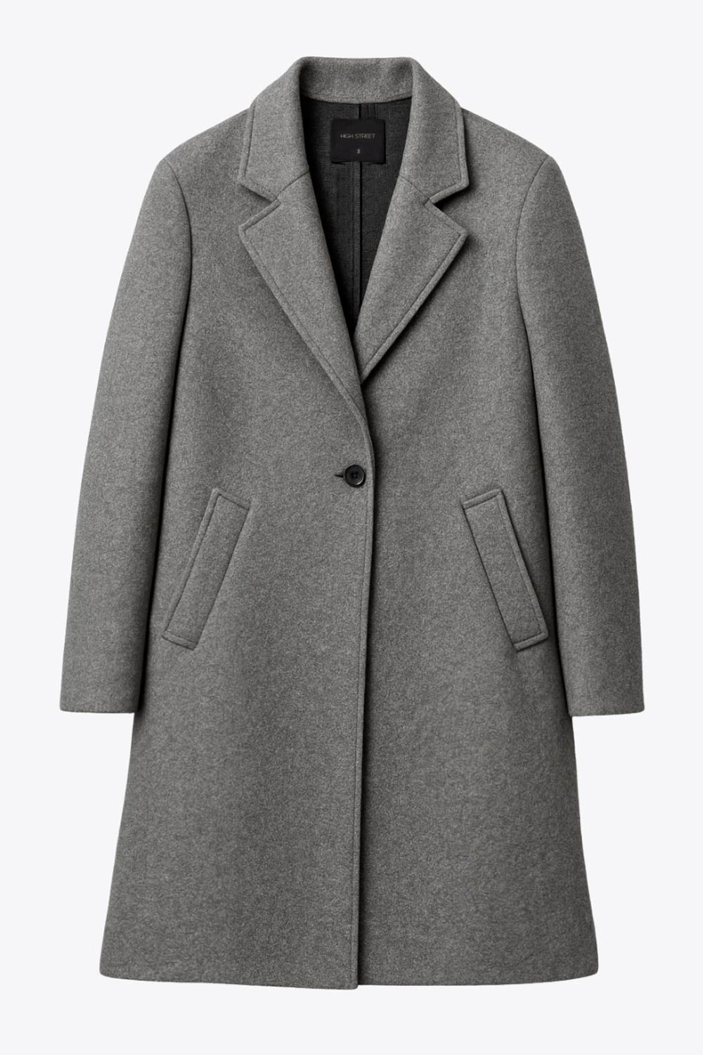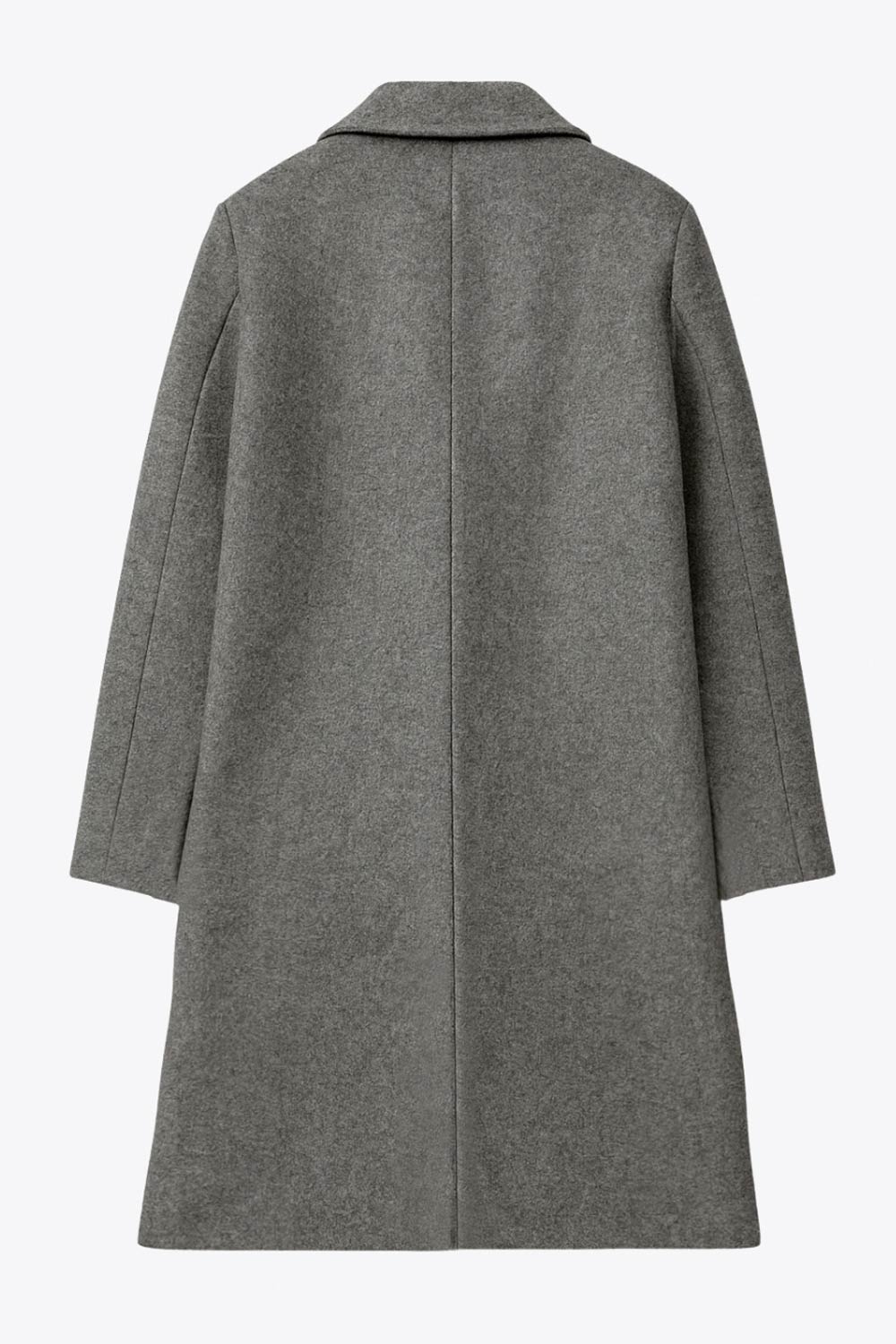 Abrigo largo de fit recto, con solapa y hombreras, manga larga y bolsillos frontales con vivos y cierre frontal con botón en contraste.