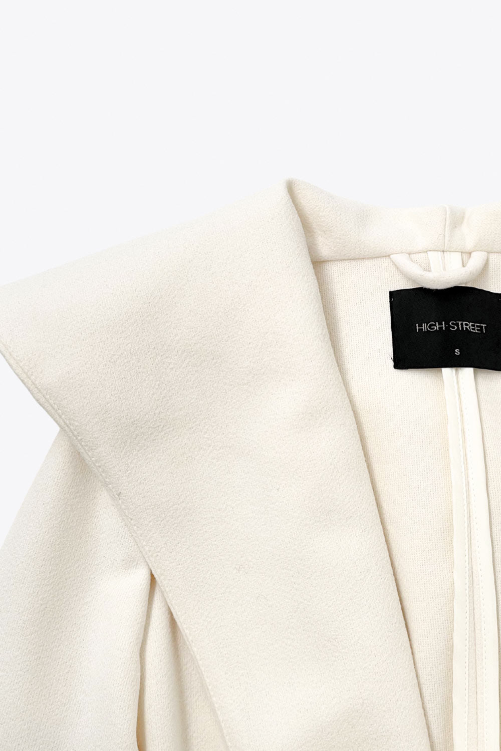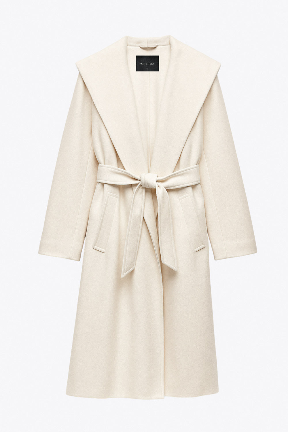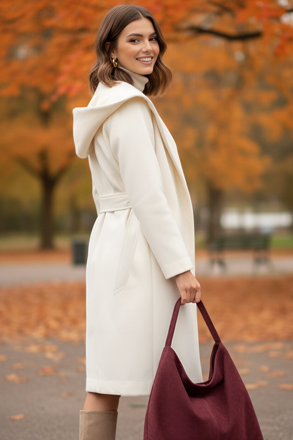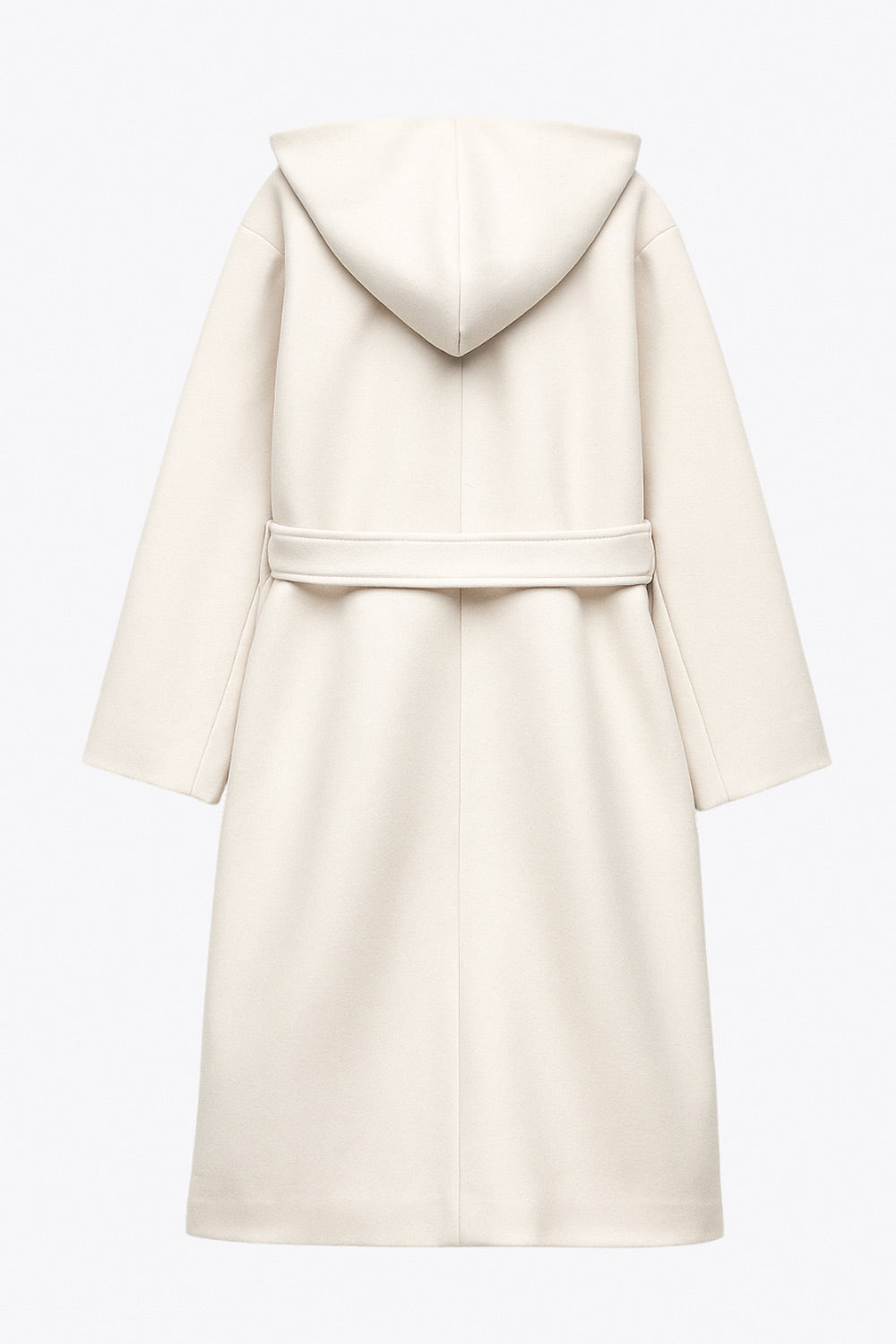 Abrigo largo de fit recto con capucha, manga larga y bolsillos delanteros. Detalle de trabillas y cinturón amarrable del mismo tejido.