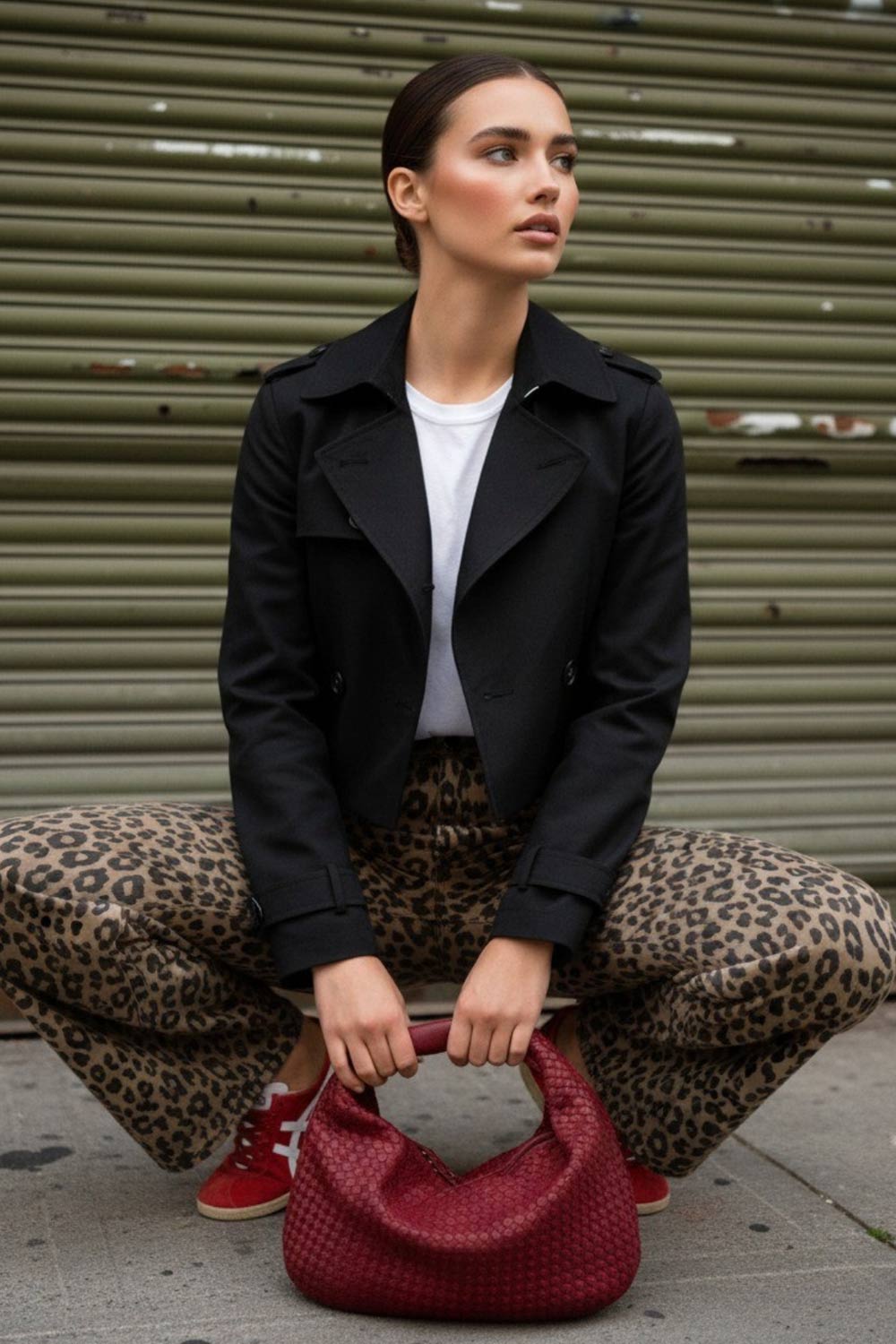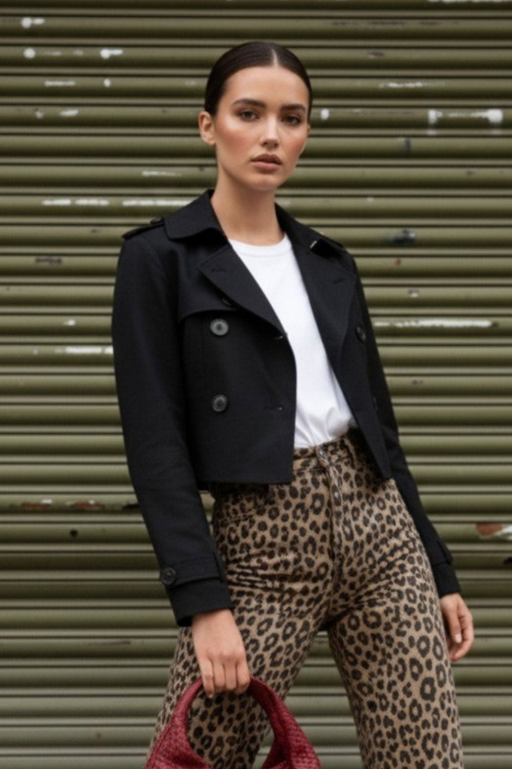 Abrigo trench corto de fit recto, cuello solapa, manga larga, trabillas con botón en puños y hombros. Bolsillos delanteros con vivos y cierre frontal con doble cruce de botones.