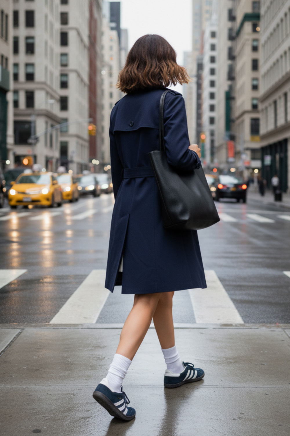 Abrigo trench corto de fit recto, con cuello solapa, bolsillos delanteros con vivos, detalle de bata trasera y manga larga. Trabillas, cinturón amarrable del mismo tejido y cierre frontal con doble cruce de botones en contraste. Detalle de trabilla y botón en hombros, bata trasera, cuello y puños.
