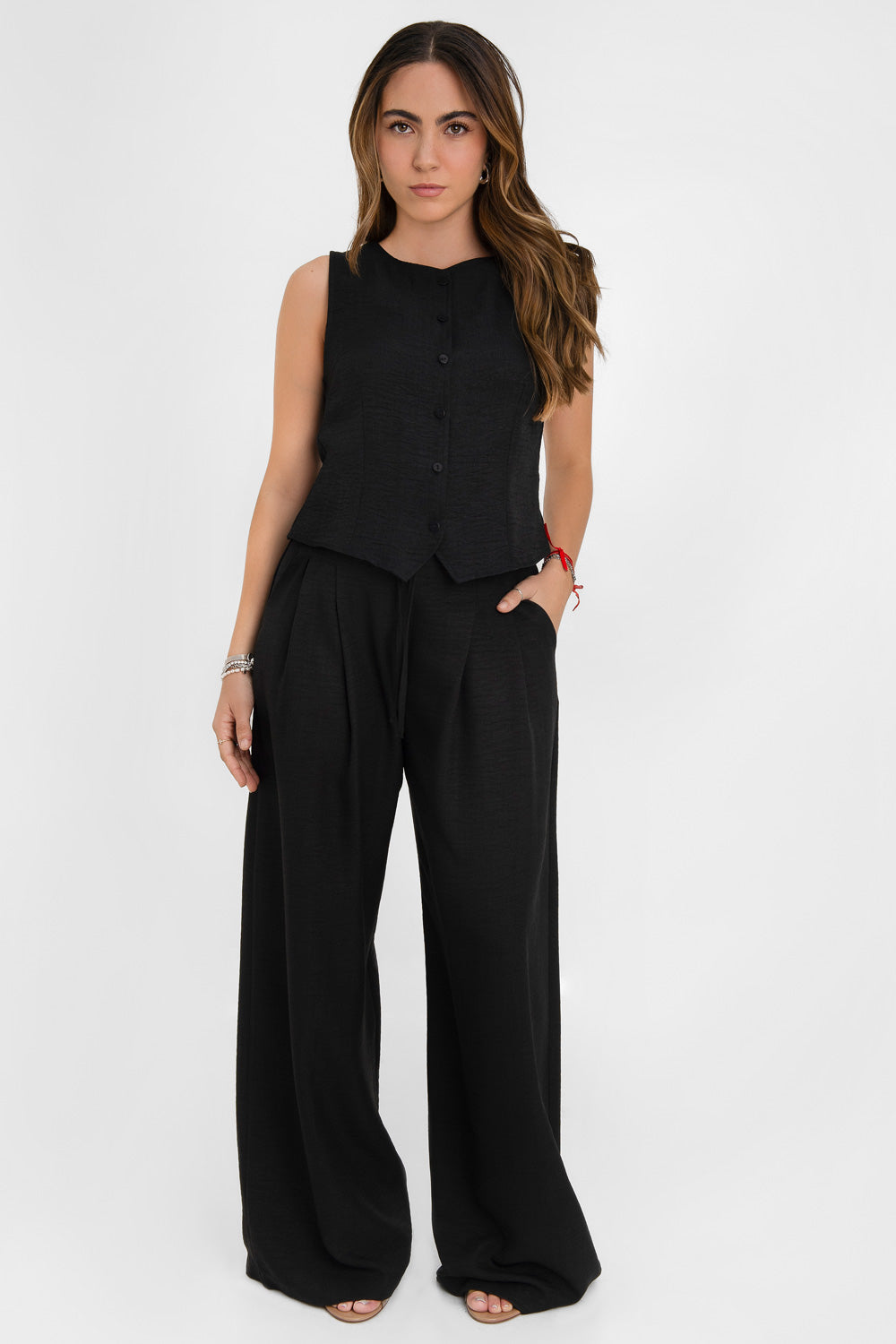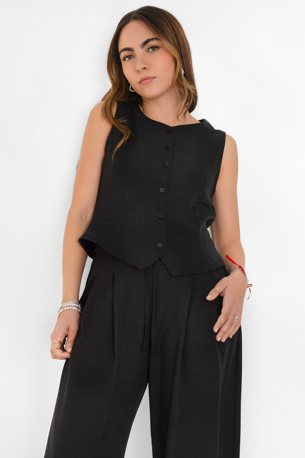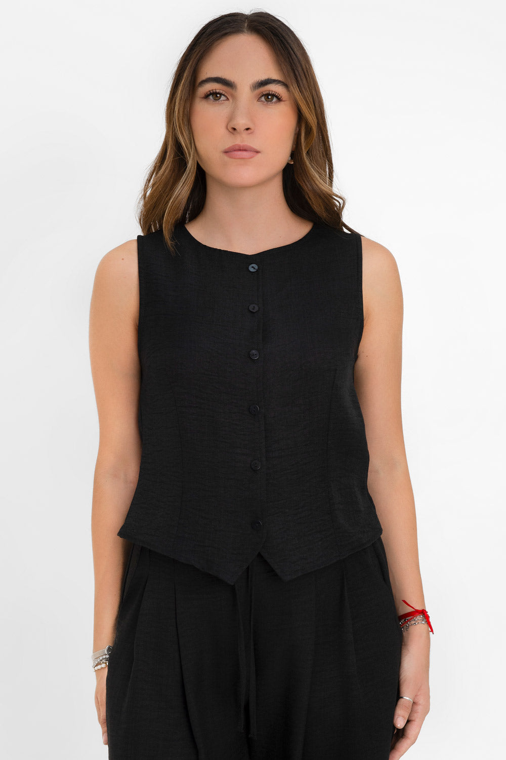Blusa corta fluida de fit recto, cuello redondo, sin mangas y cierre frontal con hilera de botones. Detalle de abertura frontal en bajo.