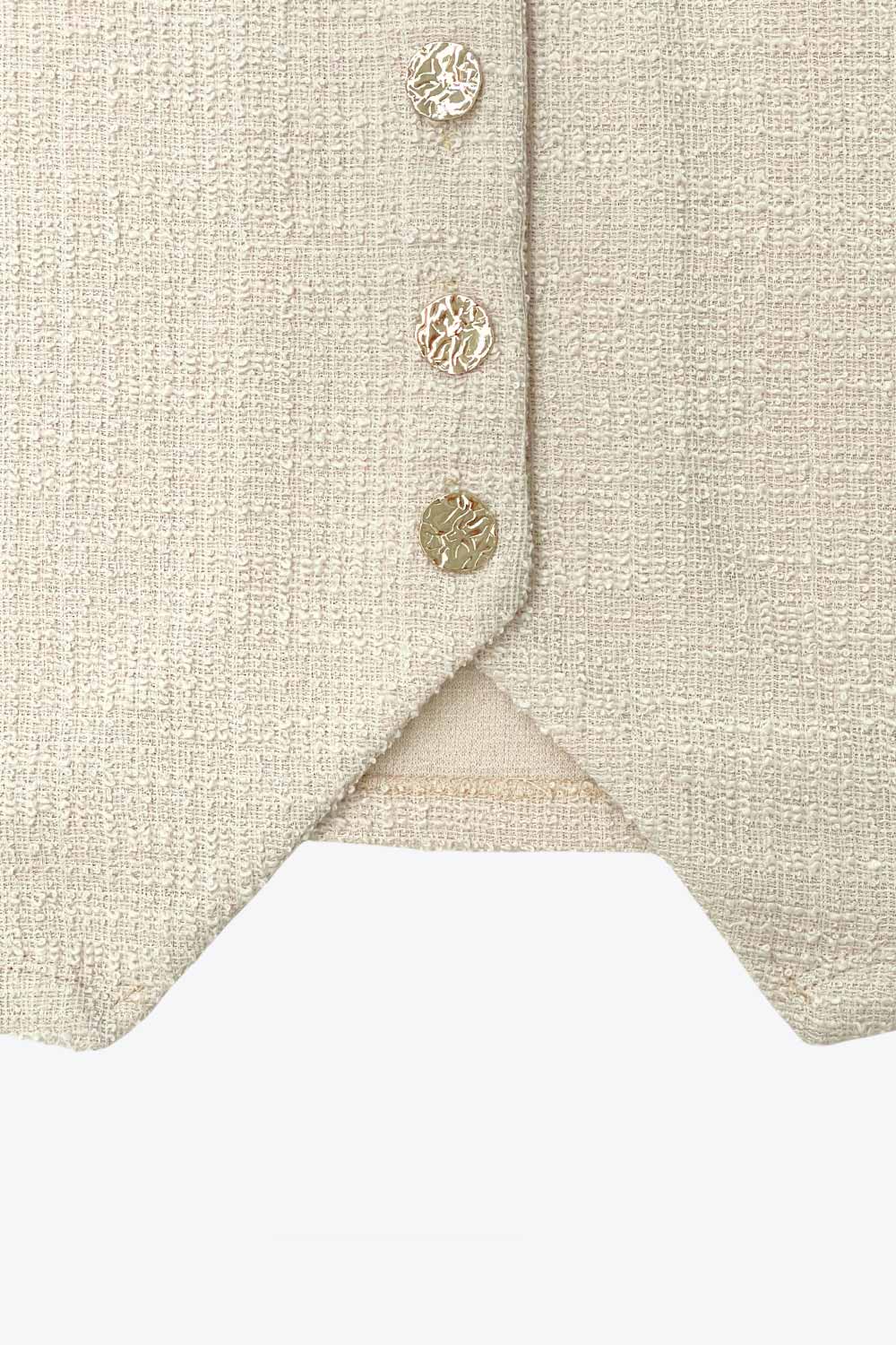 Chaleco de bouclé, fit recto, escote v, cierre con hilera de botones en contraste y abertura frontal v en bajo.