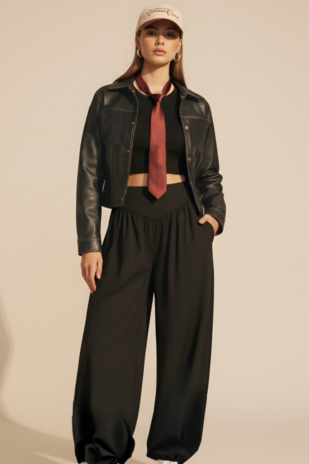 Chamarra corta de efecto piel, fit recto, cuello camisero, manga larga con puño abotonado, bolsillos delanteros de parche y cierre frontal con hilera de botones de presión. Detalle de costuras decorativas en contraste.