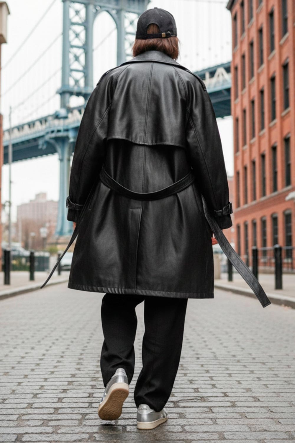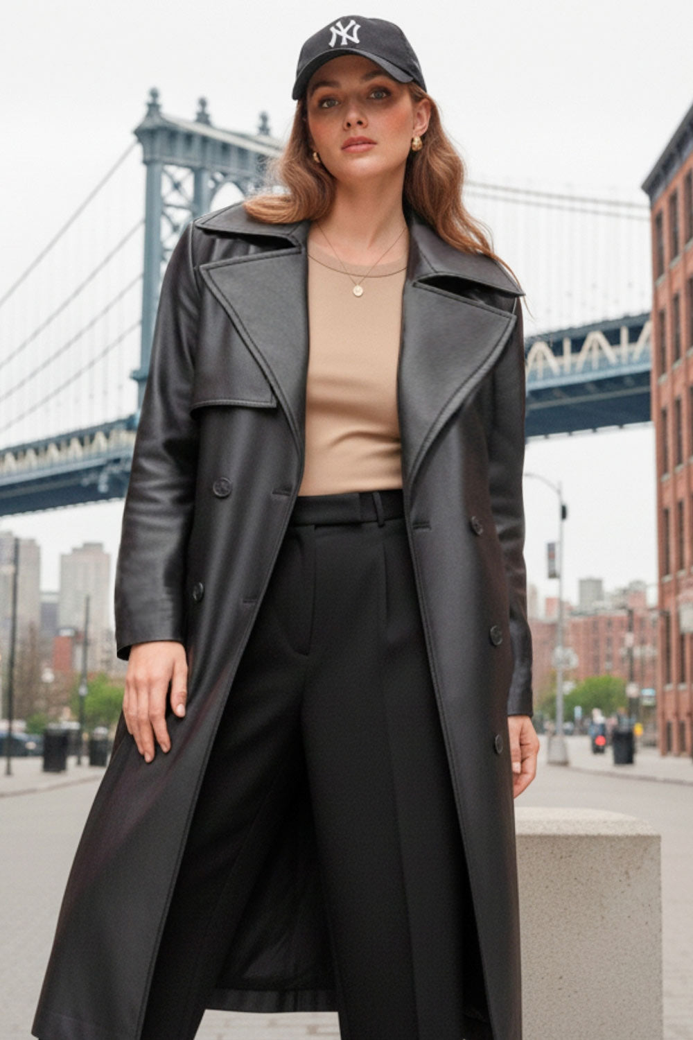 Abrigo trench largo de efecto piel, fit recto, manga larga, con solapa y bata en espalda, cortes decorativos frontales, trabillas y cinturón del mismo tejido con hebilla en contraste. Cierre frontal con doble cruce de botones en contraste.