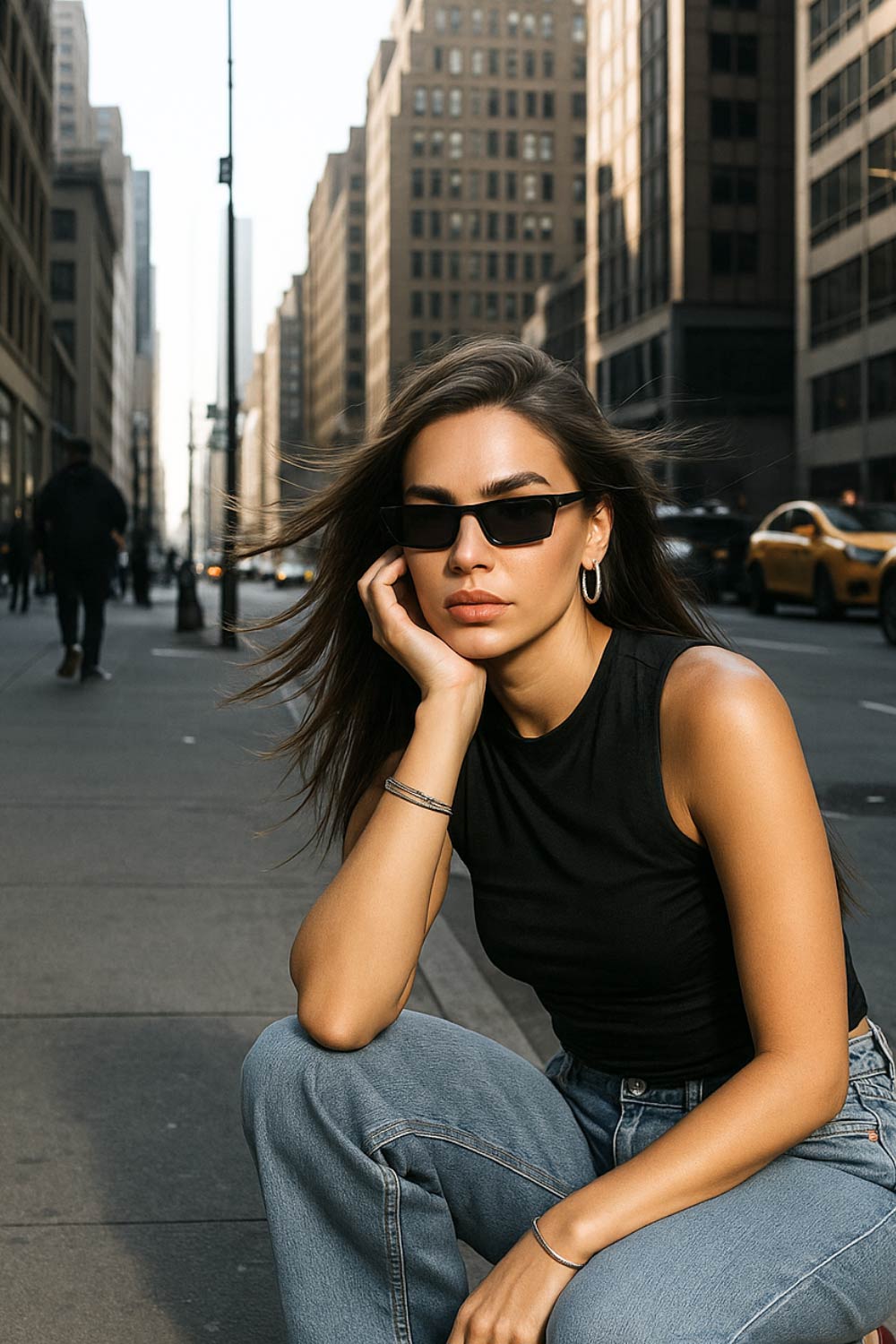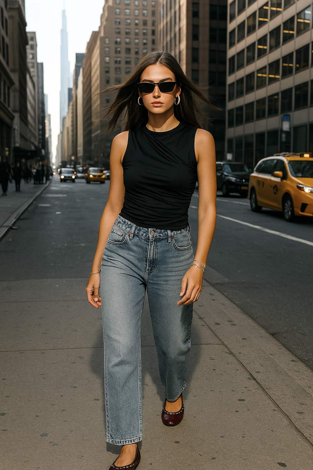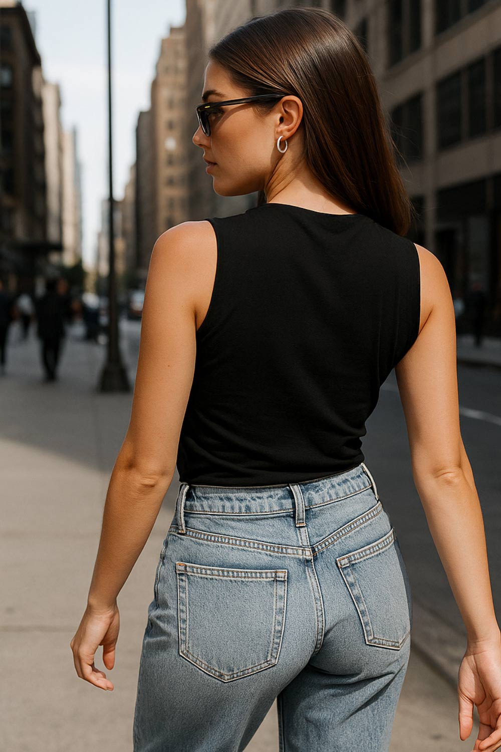 Top corto de fit ajustado, sin mangas, cuello barco, plisados decorativos en hombro y costados.