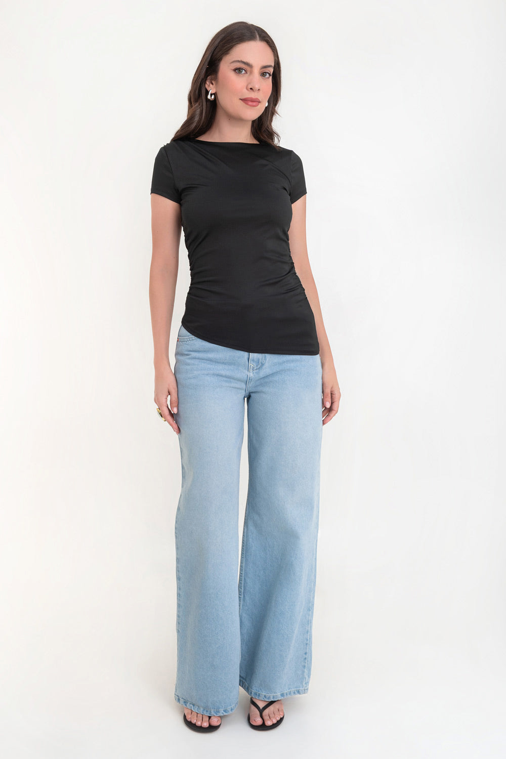 Top de fit ajustado, manga corta, cuello barco, plisados en costados y bajo curveado asimétrico.