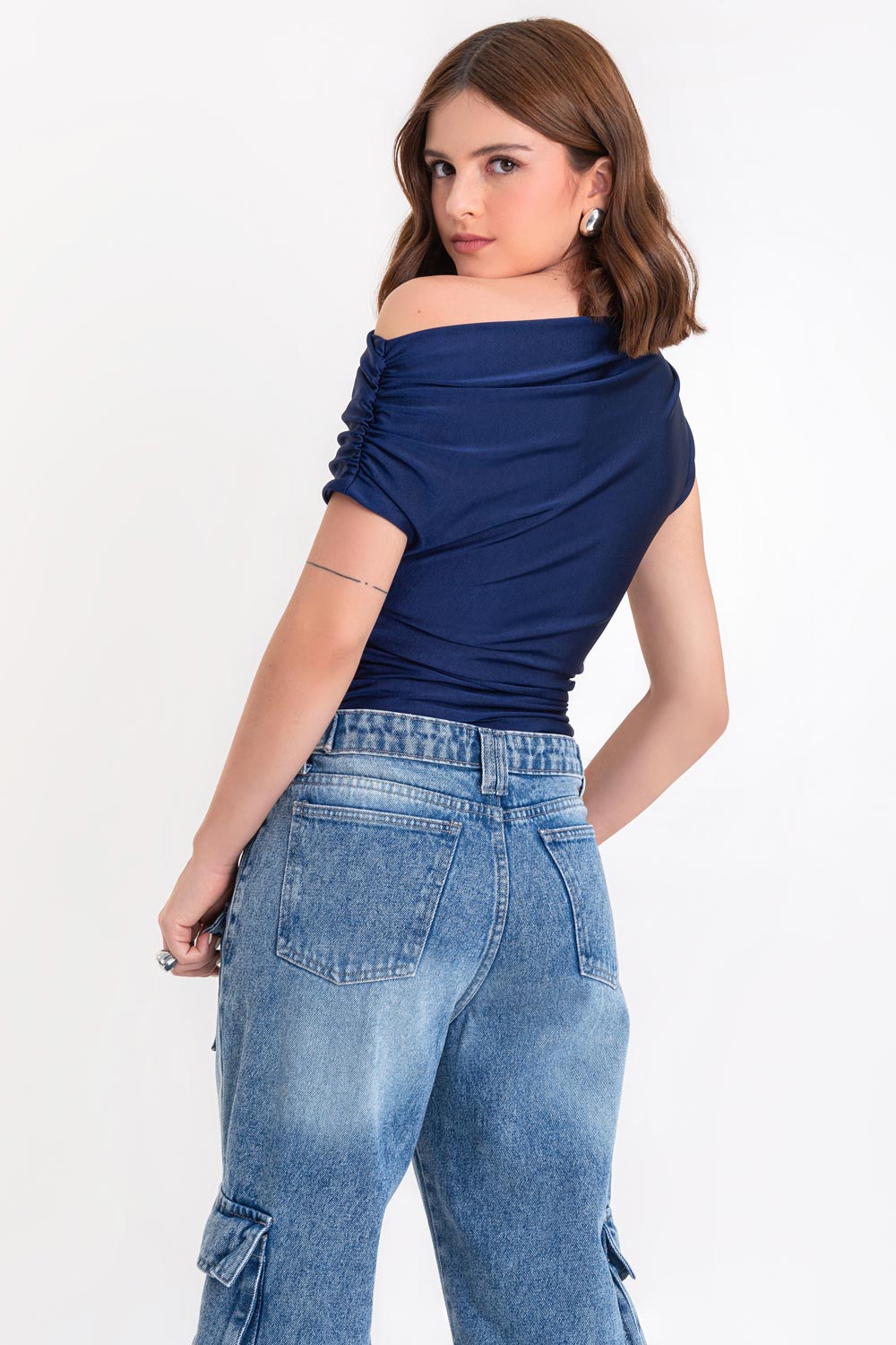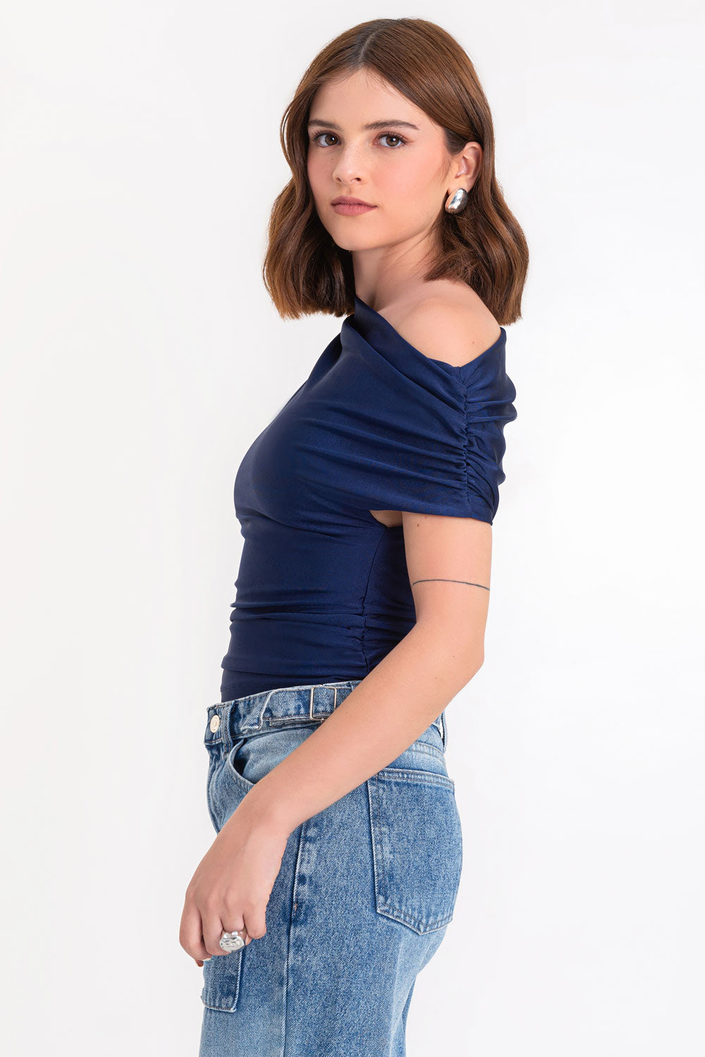 Top ajustado asimétrico de escote diagonal, una manga corta seguida con hombro descubierto y plisados en hombros.