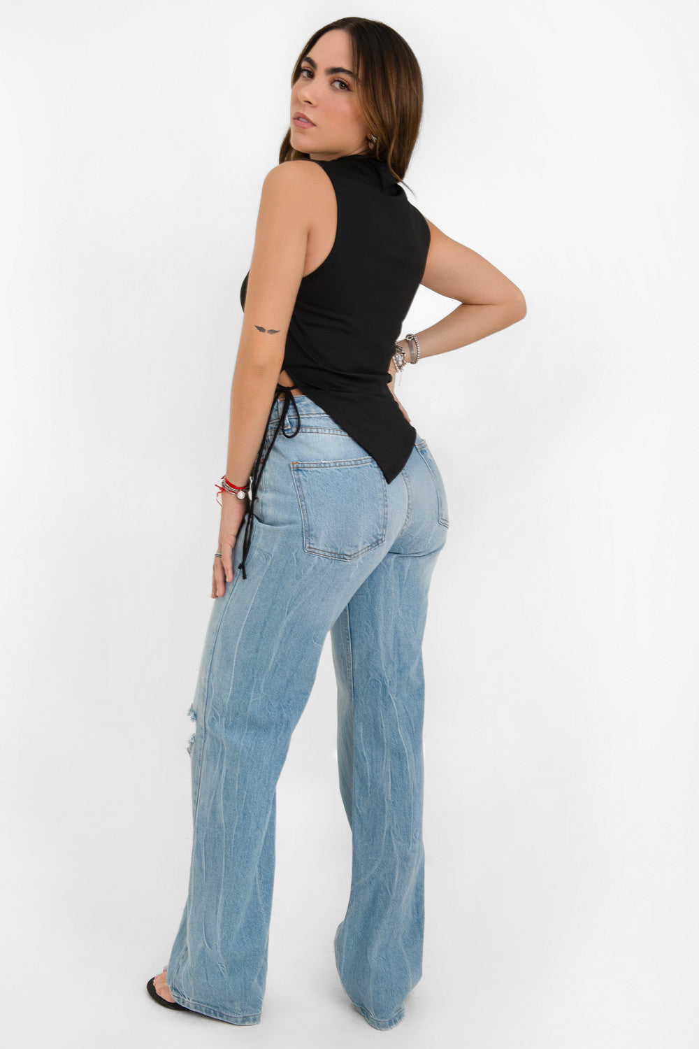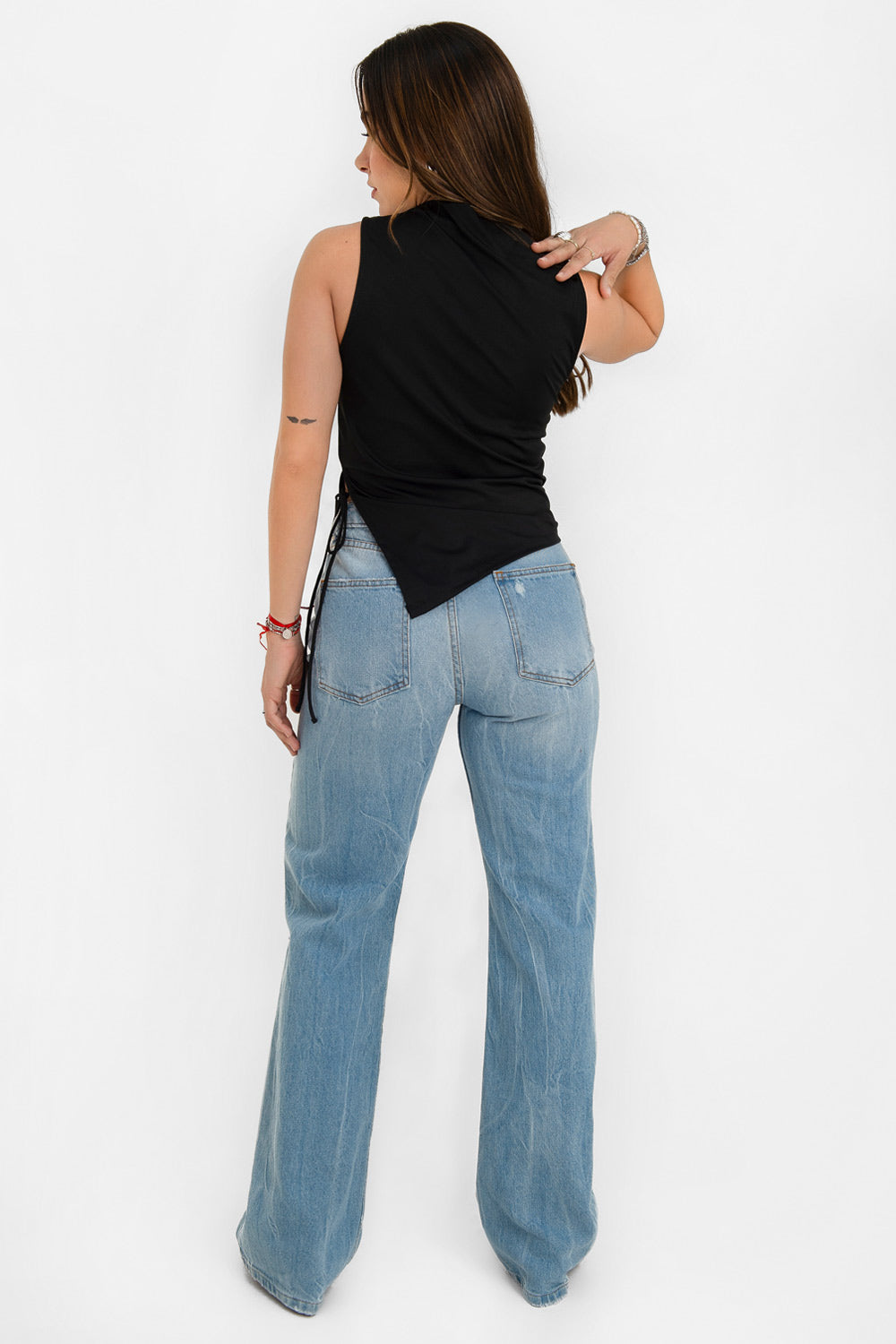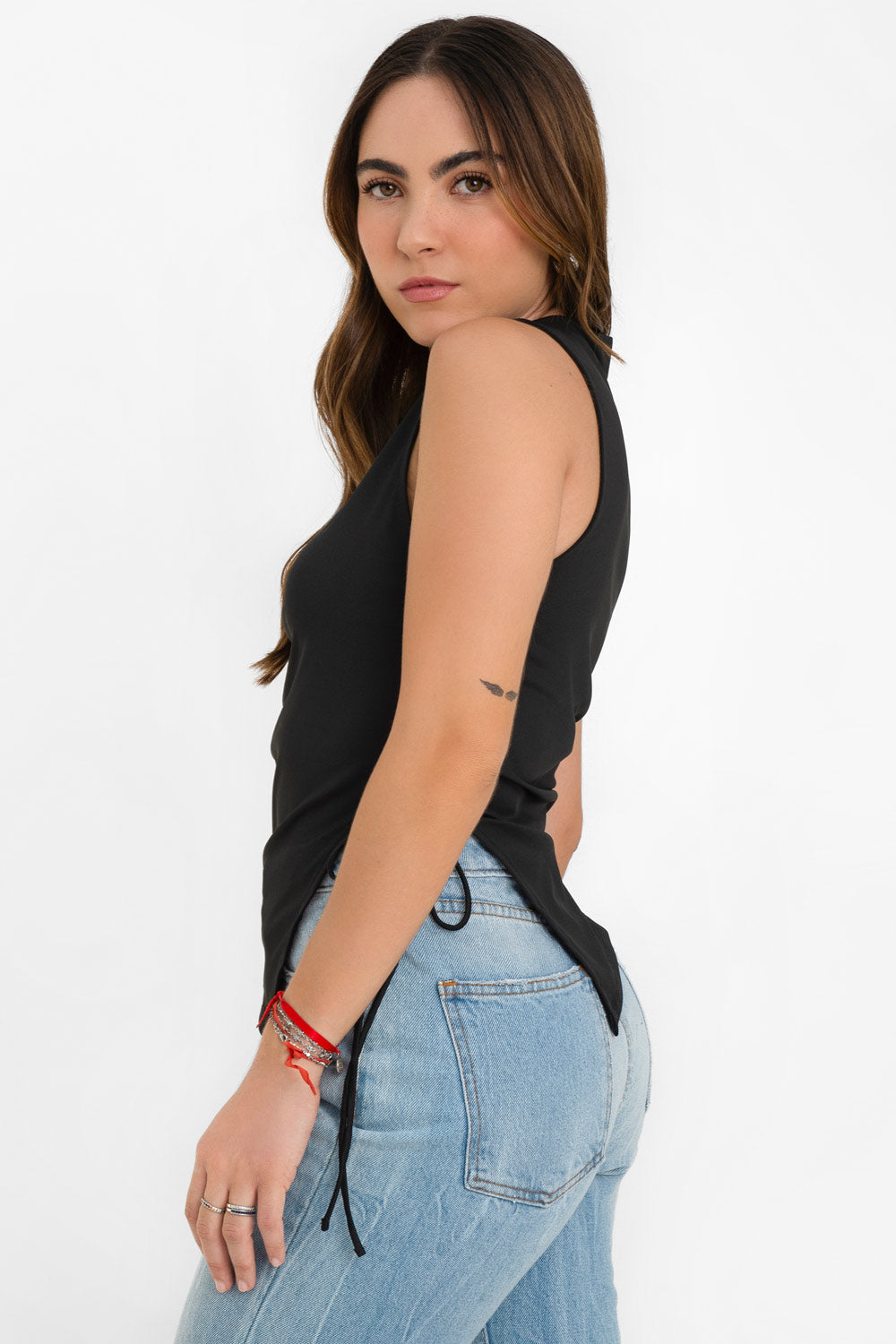 Top asimétrico de fit recto, cuello barco, sin mangas, bajo asimétrico diagonal con abertura lateral y lazo amarrable decorativo.