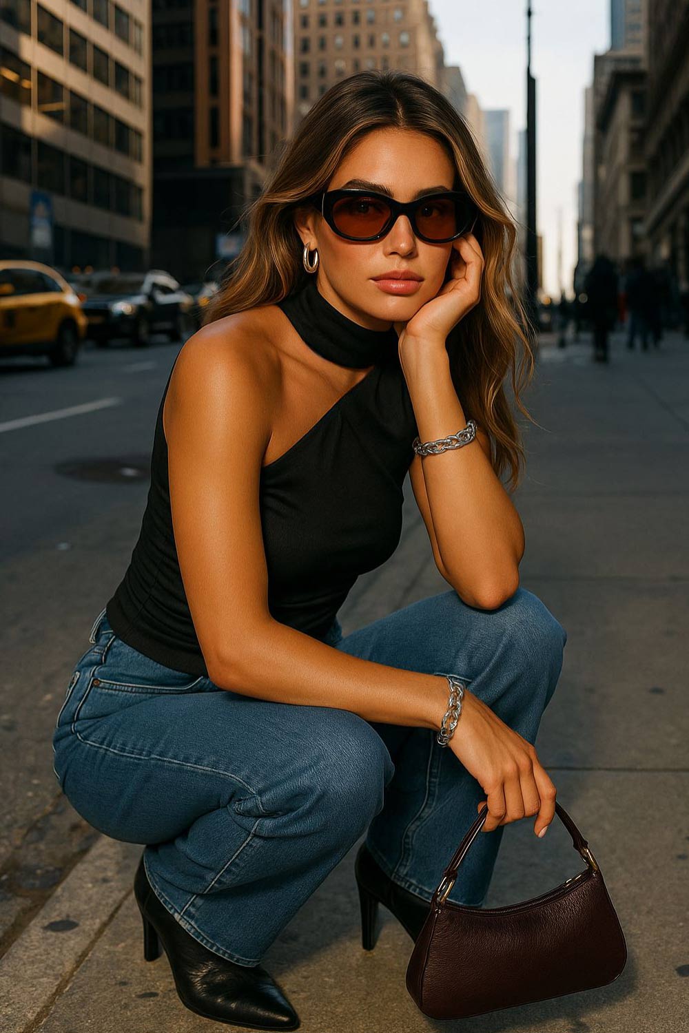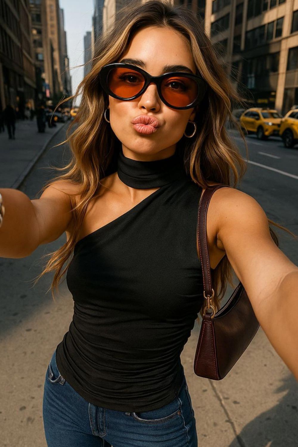 Blusa satinada asimétrica de fit recto, sin mangas, escote diagonal con detalle de choker cruzado.