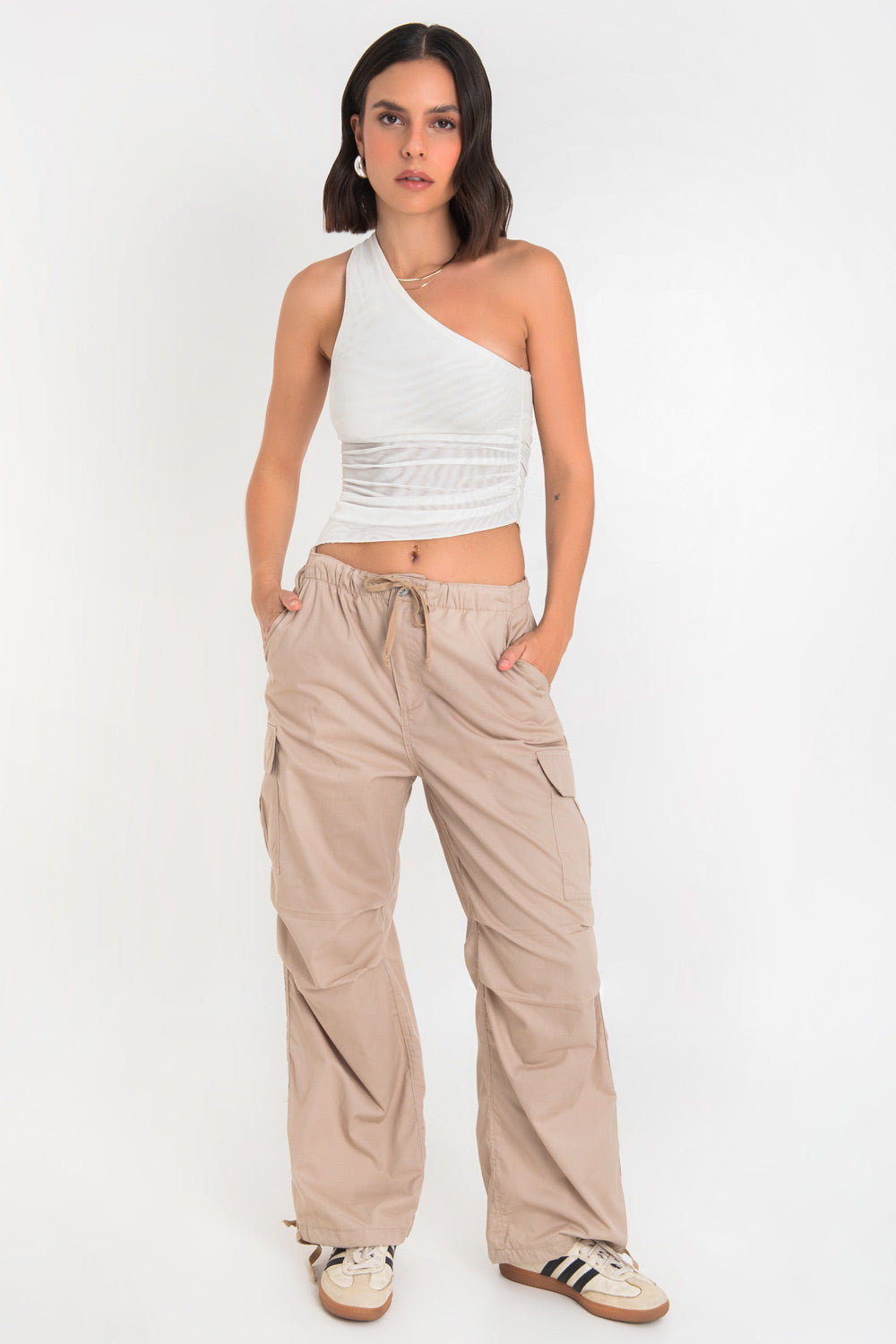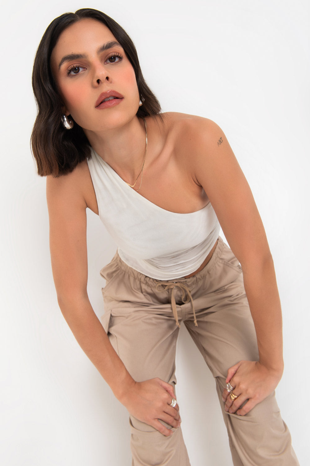 Top corto asimétrico de mesh, fit ajustado, un hombro, escote diagonal, sin mangas, detalles plisados en costado y bajo asimétrico con rib en borde.