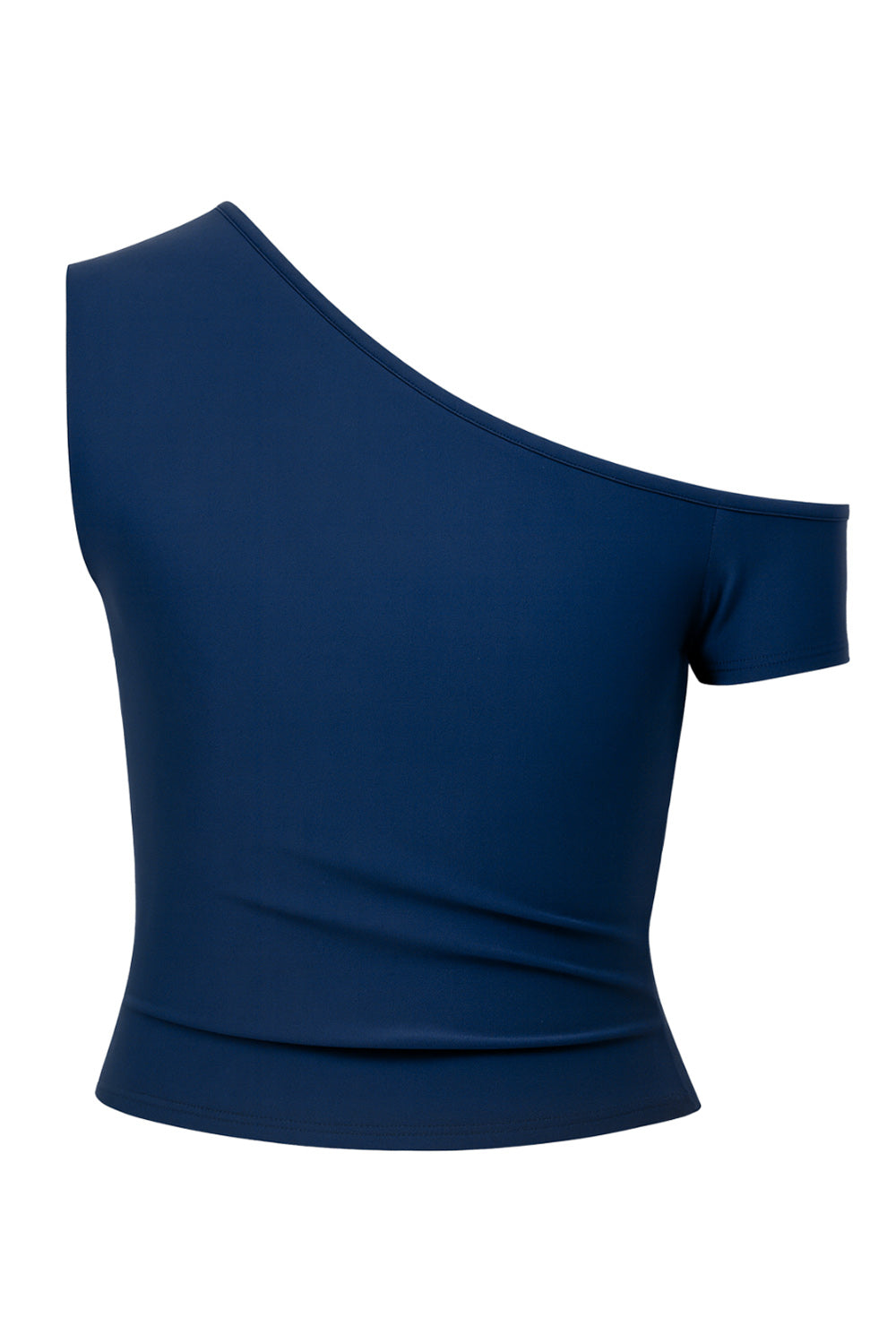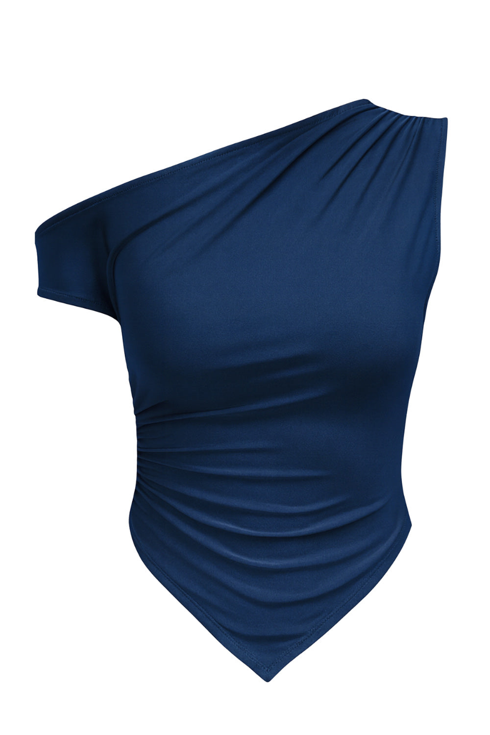 Top ajustado satinado asimétrico de escote diagonal, una manga corta seguida con hombro descubierto, plisados en hombro y bajo frontal asimétrico. Detalle de plisados en costados.