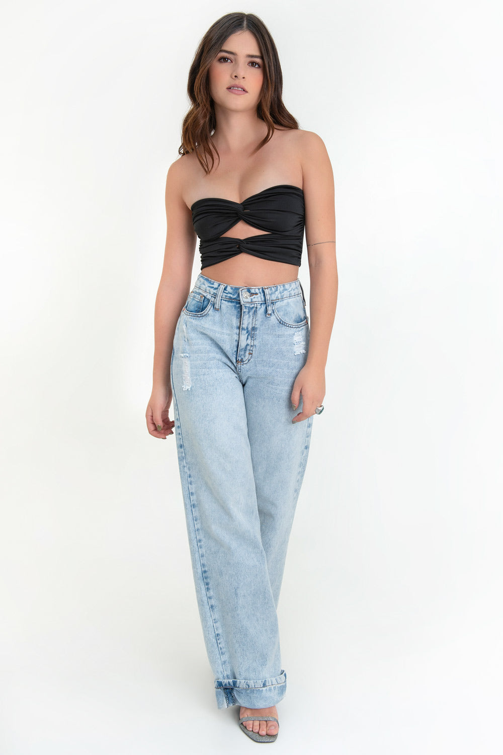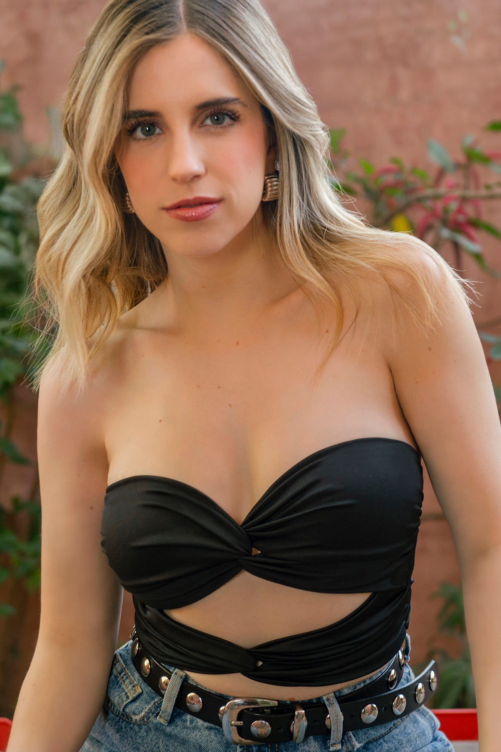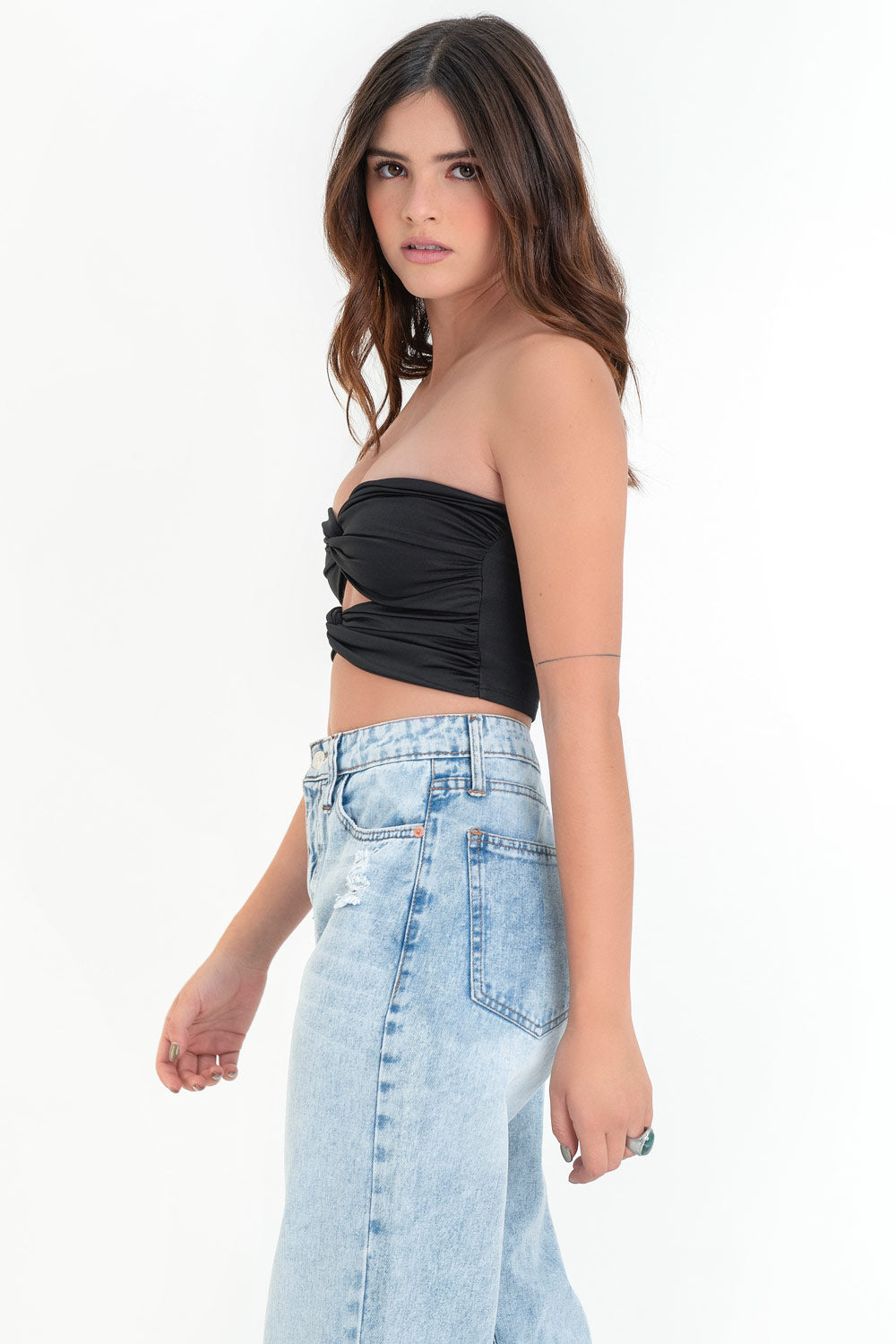 Top tubo corto de fit ajustado, escote corazón con doble nudo frontal, detalles plisados y cut out frontal.