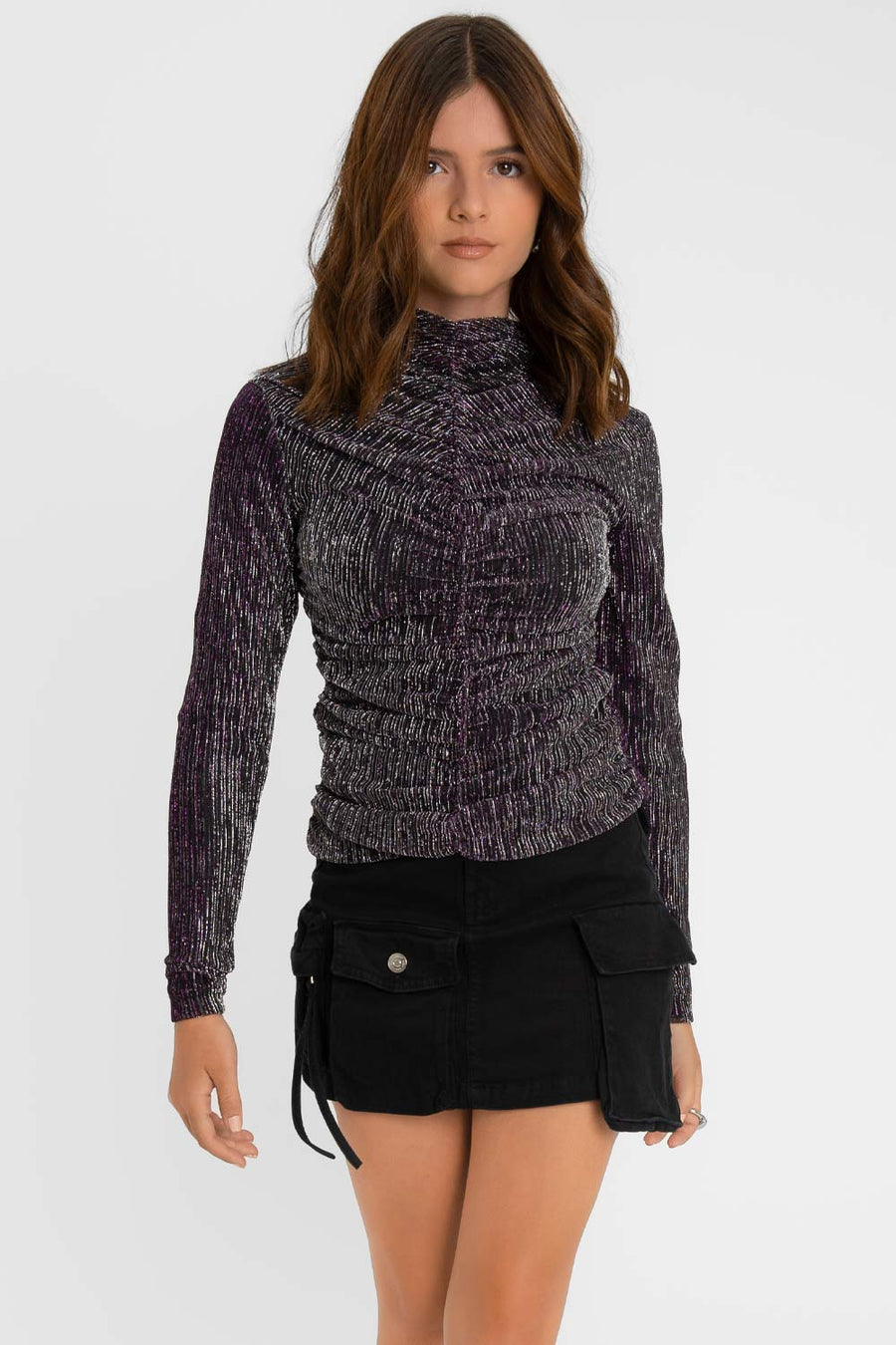 Top de fit ajustado, cuello mock seguido, manga larga, plisado frontal y posterior. Detalle de hilo metálico en tejido.