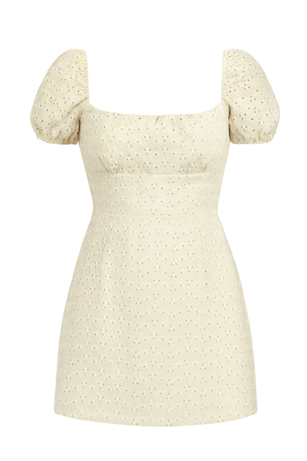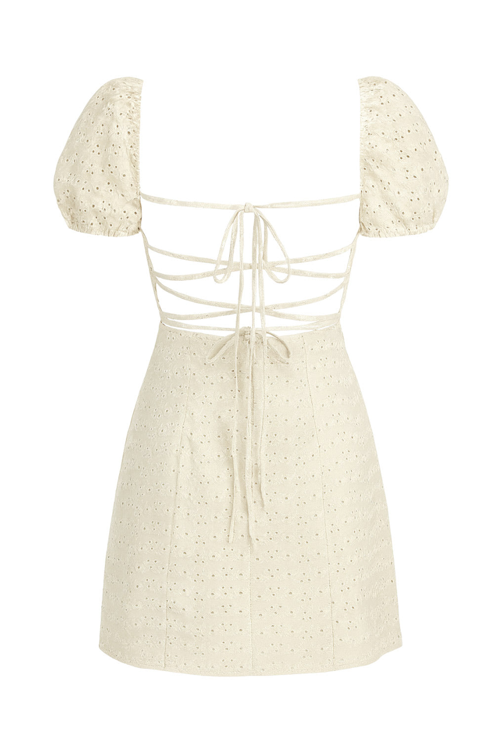 Vestido corto bordado de fit ajustado, manga corta abullonada con rib elástico en bordes, escote cuadrado, detalles plisado frontales con cortes, escote en espalda con lazado ajustable y cierre posterior con cremallera oculta. Detalle de perforado en tejido.