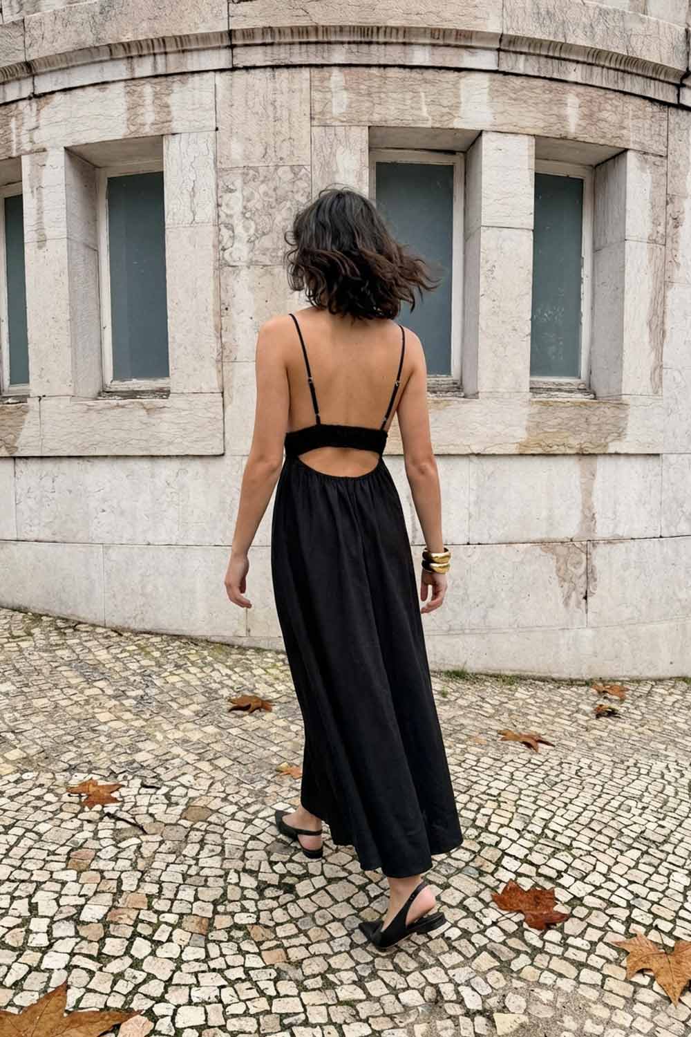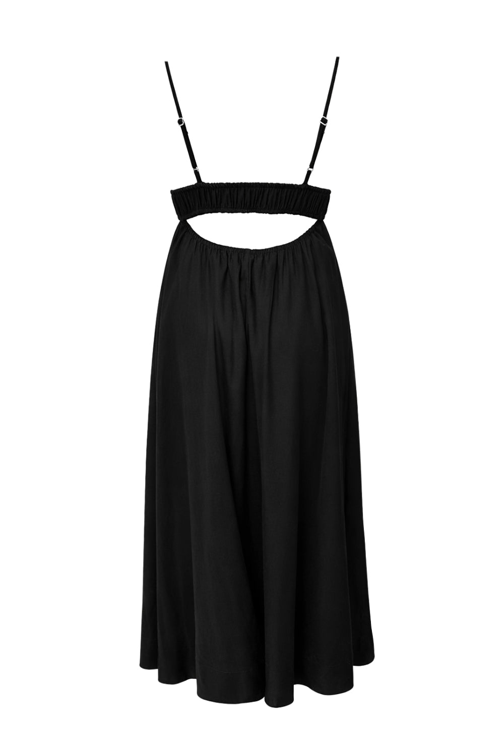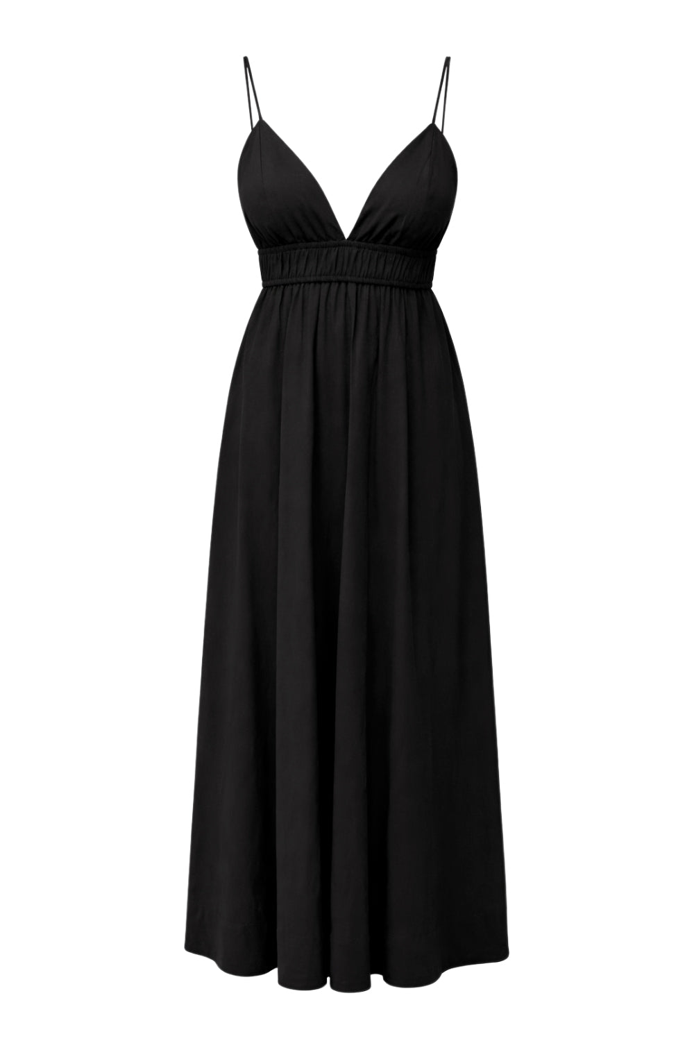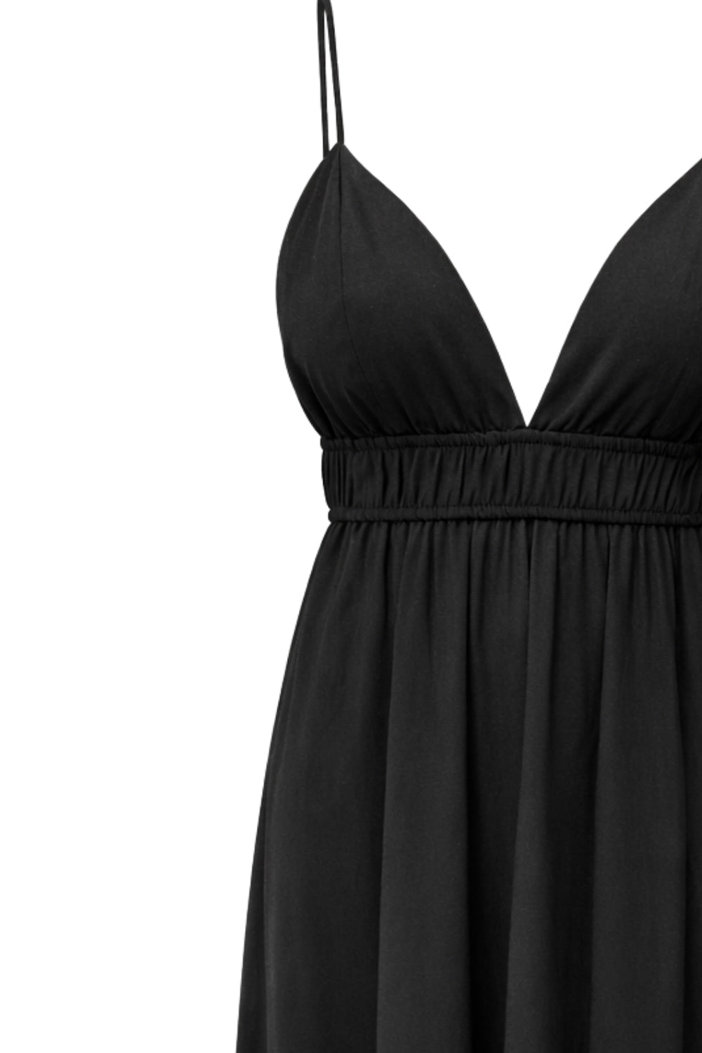 Maxi vestido de corte en a, escote v, rib elástico con plisados en cintura, tirantes delgados ajustables, fruncido y detalle de cut out en espalda.