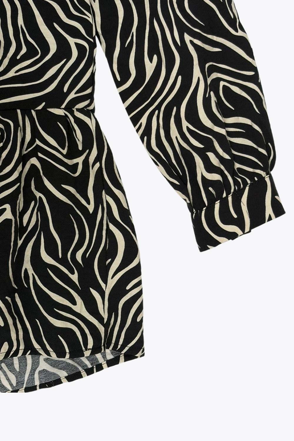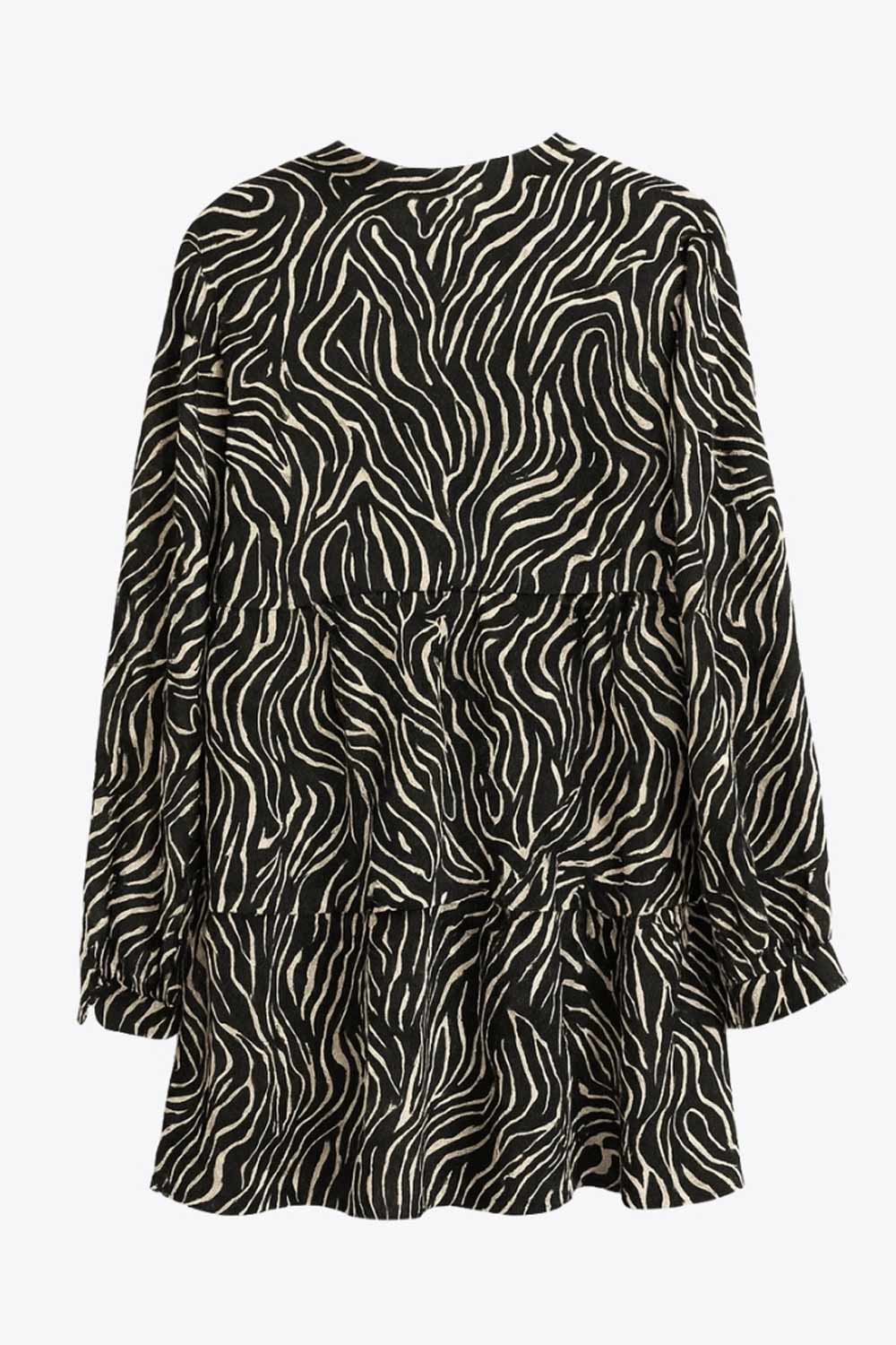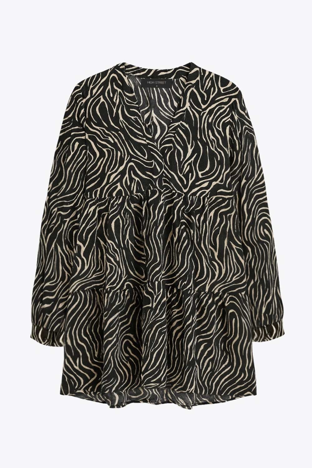 Vestido corto camisero estampado, de manga larga con puño abotonado, corte en a, escote v y capas con olanes en bajo.