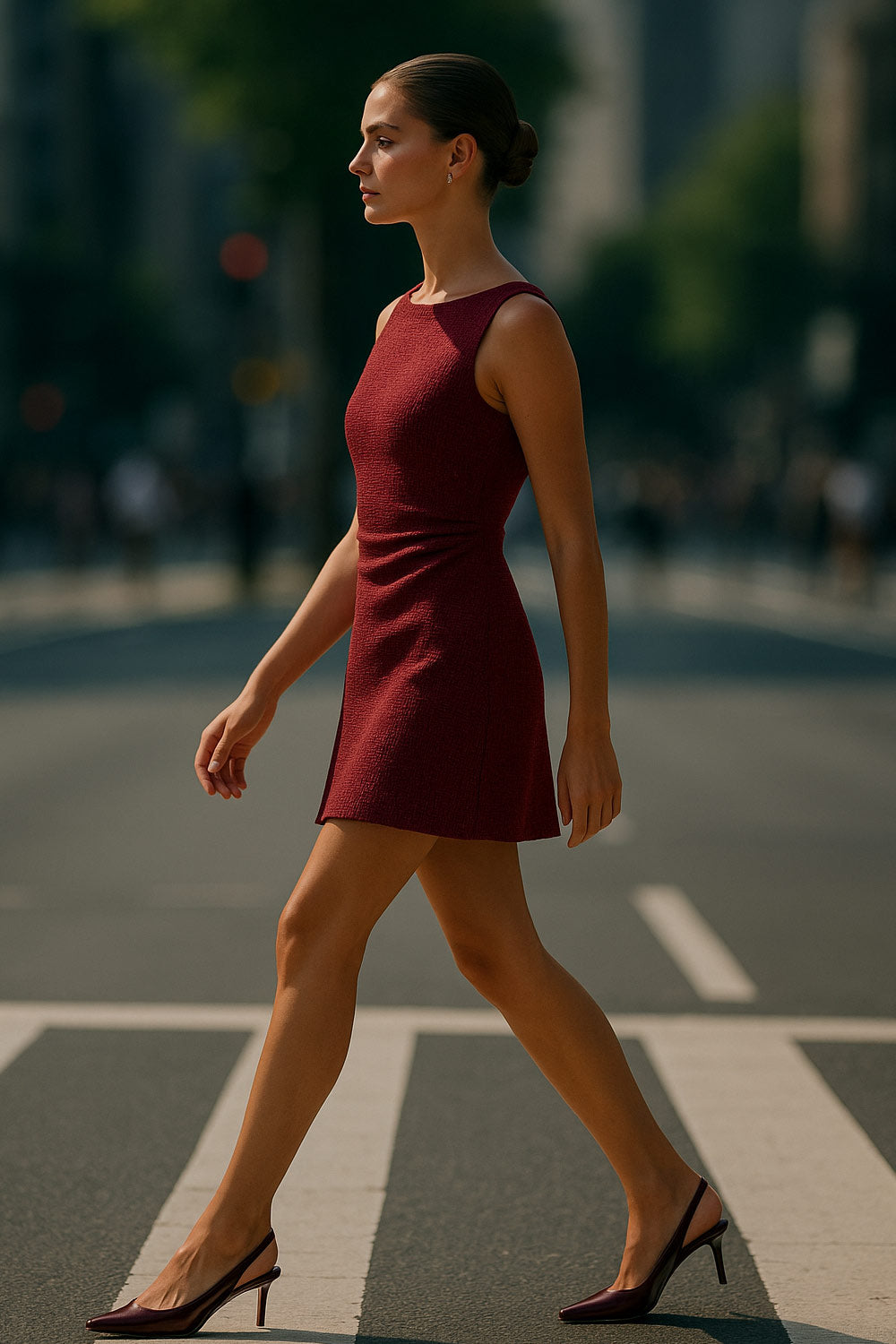 Vestido corto de cuello barco, sin mangas, plisados laterales en cintura, corte en a, rib en bordes y detalle de textura en tejido.
