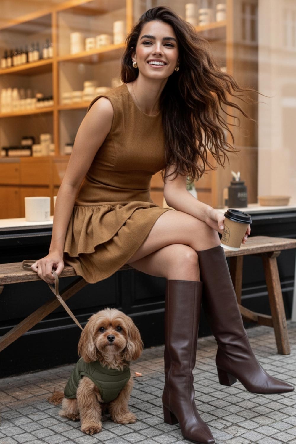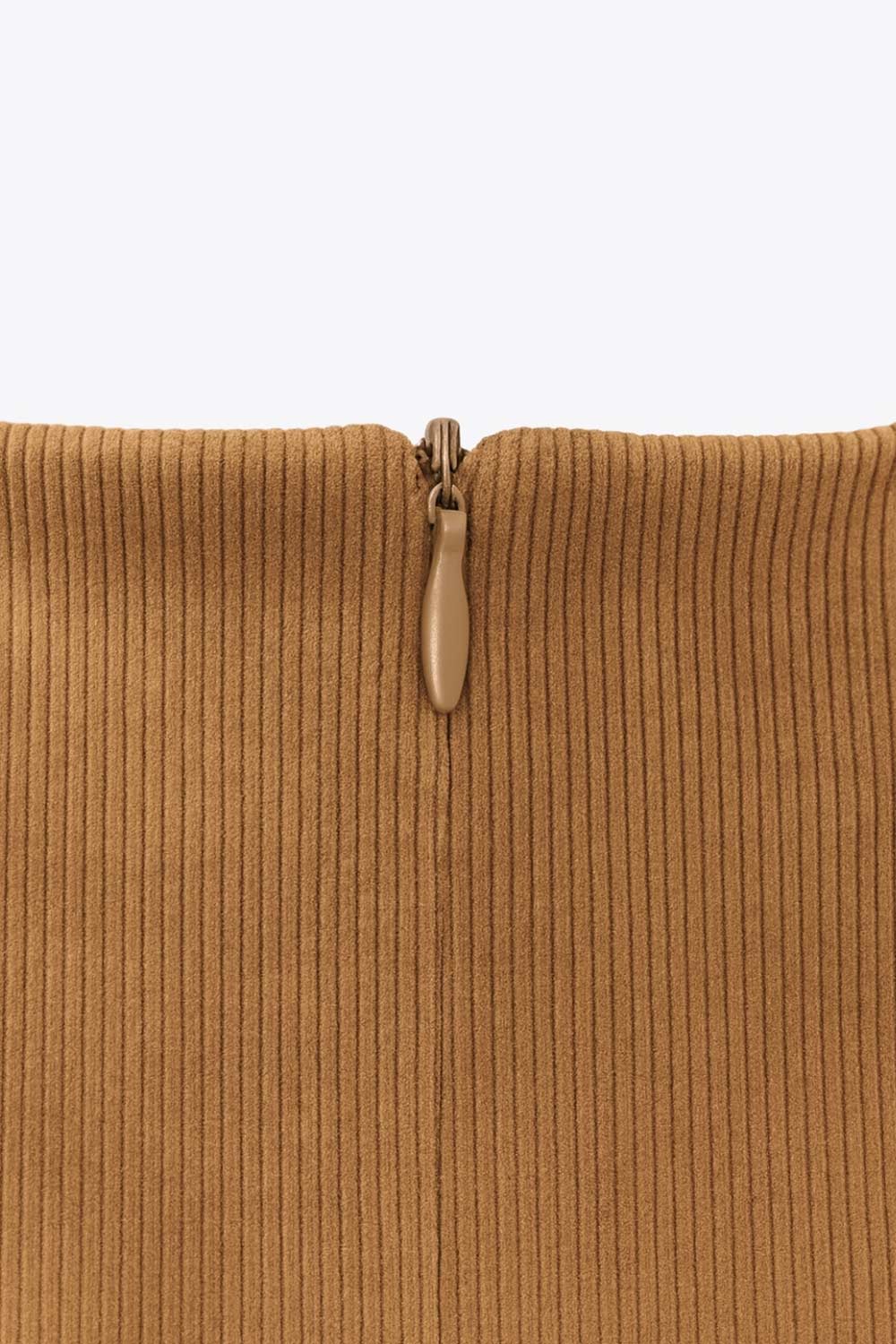 Vestido corto de pana, fit ajustado, cuello redondo, sin mangas, pinzas frontales, corte v frontal en cadera y doble capa de olanes en bajo. Cierre posterior con cremallera oculta.